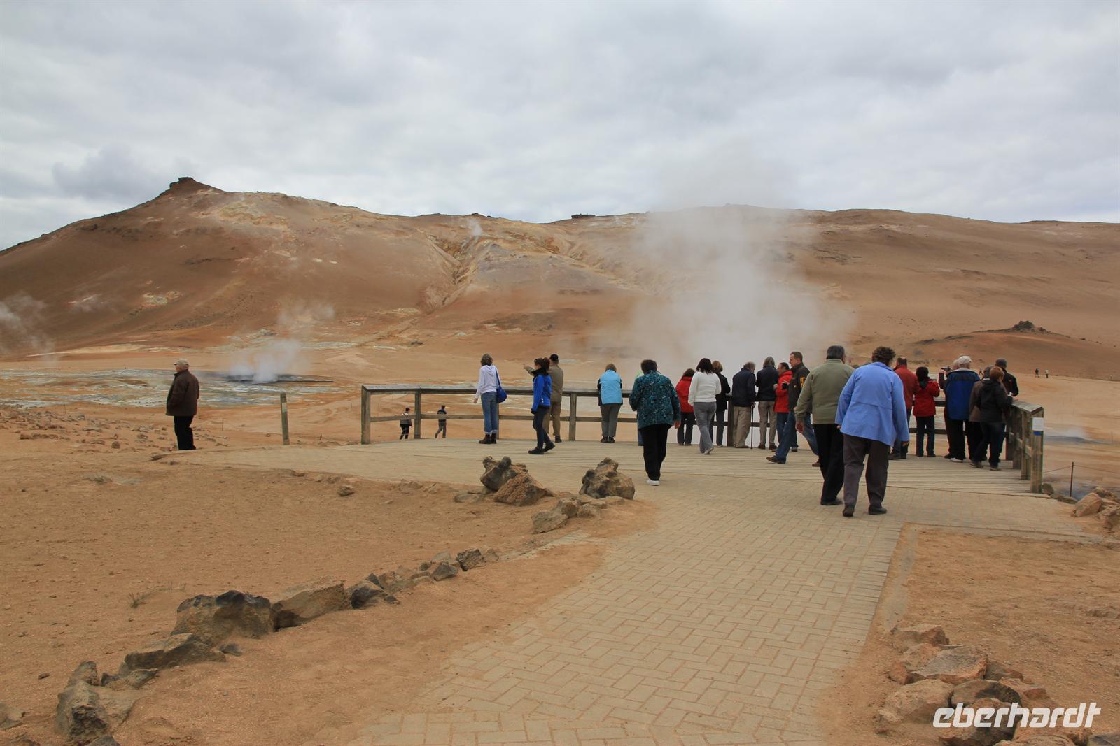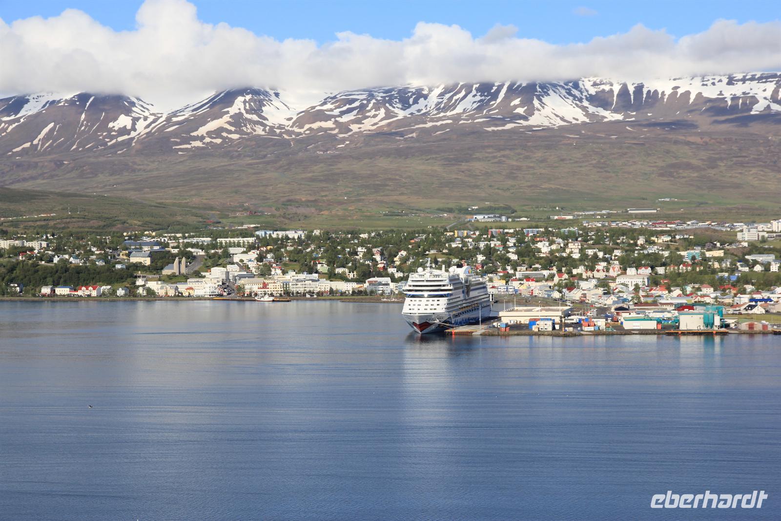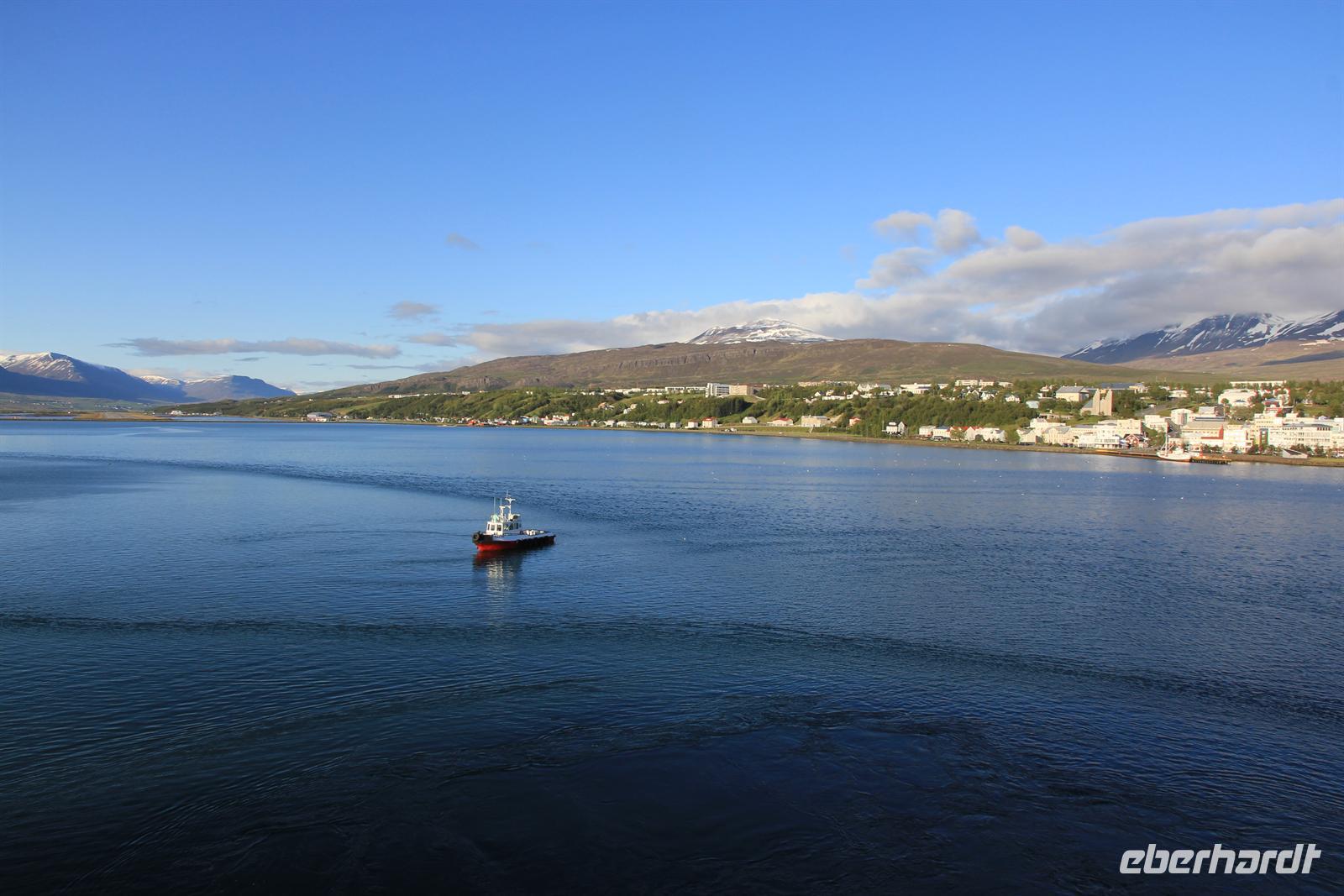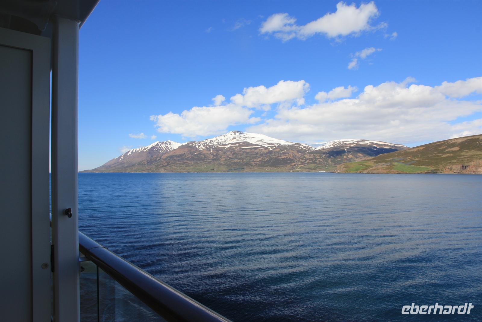 Land in Sicht hieß es früh am Morgen beim Einlaufen in den wunderschönen Eyjafjödur. Bei strahlendem Sonnenschein wollten wir heute die zauberhaften isländischen Naturwunder des Nordens kennen lernen. Von Akureyri aus begannen wir unsere Tour vorbei an dem gewaltigen Wasserfall Godafoss, rund um den See Myvatn. Der Mückensee machte seinen Namen alle Ehre und so wurden wir beim Aussteigen von Millionen der kleinen schwarzen Tierchen begrüßt. Im Lavalabyrinth Dimmubogir unternahmen wir eine herrliche Wanderung, bei der wir so einige Tierwesen in den seltsamen Lavagebilden erkennen konnten. Beim Mittagessen konnten wir eine typisch isländische Fleischsuppe kosten und dabei einen traumhaften Ausblick über das Myvatn-Gebiet und Dimmubogir werfen. Anschließend statten wir noch dem Hochtemperaturgebiet Namaskard einen Besuch ab. Wie in einer Hexenküche sah es hier aus. Es blubberte, brodelte und stank gewaltig nach Schwefel. Beglückt von diesen vielen Eindrücken fuhren wir durch die vielseitige Natur zurück zu unserem Heim auf Zeit. Bei strahlendem Sonnenschein konnten wir die Fjordausfahrt wunderbar genießen und zahlreiche Wale beobachten.
