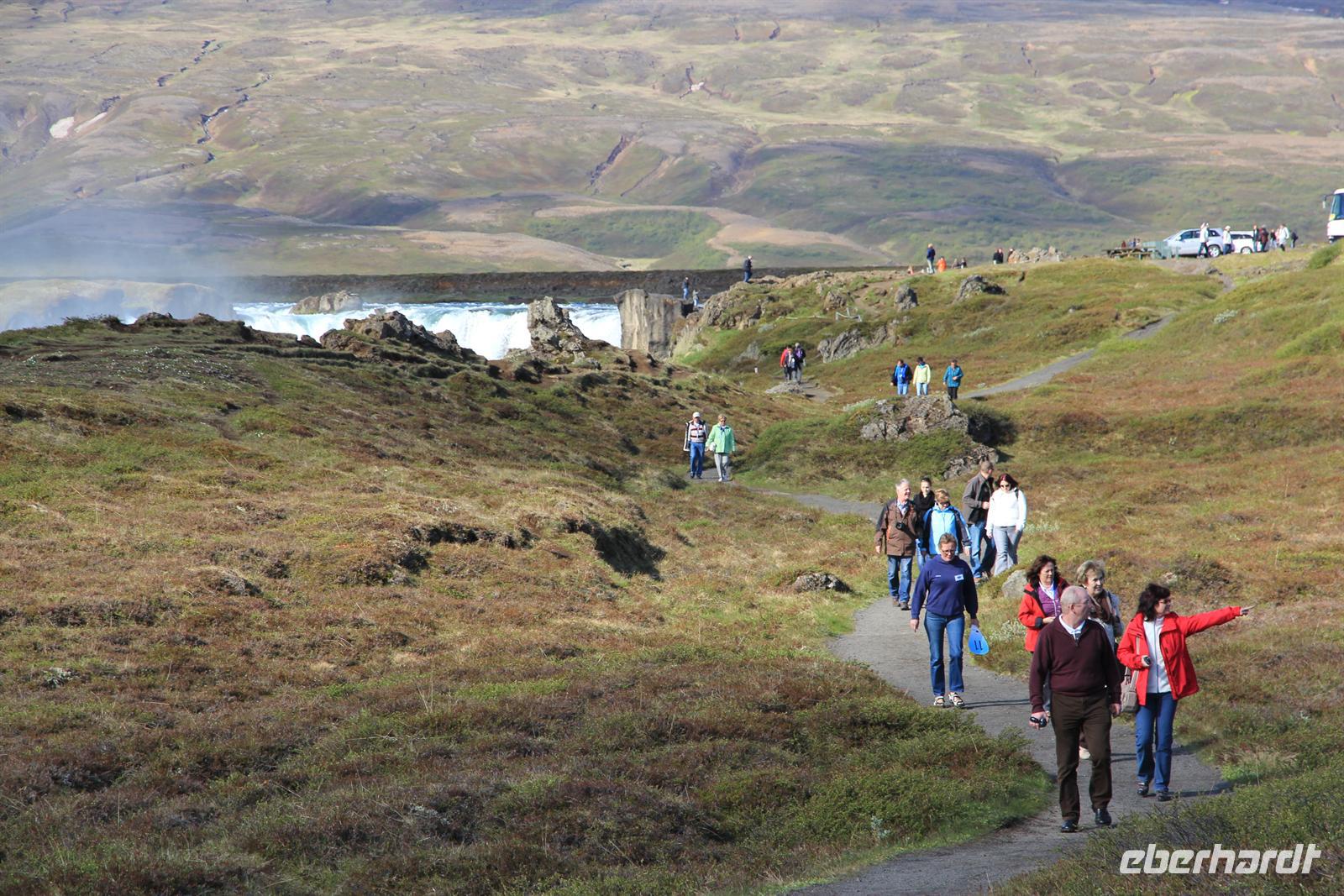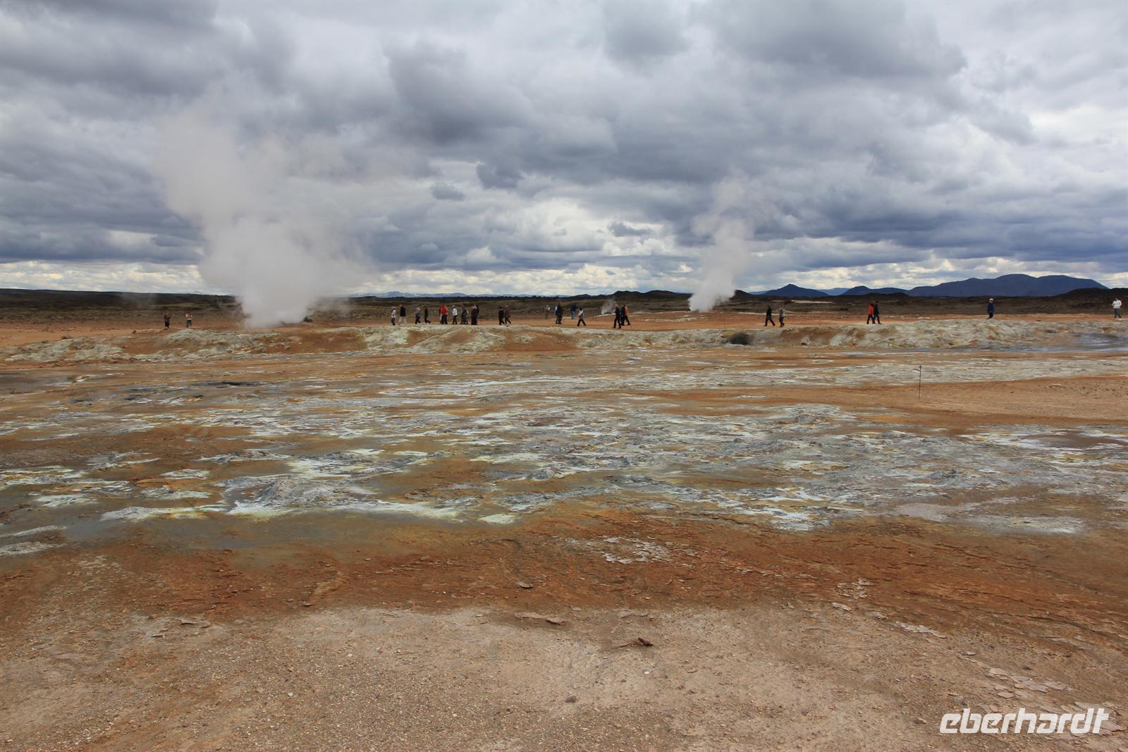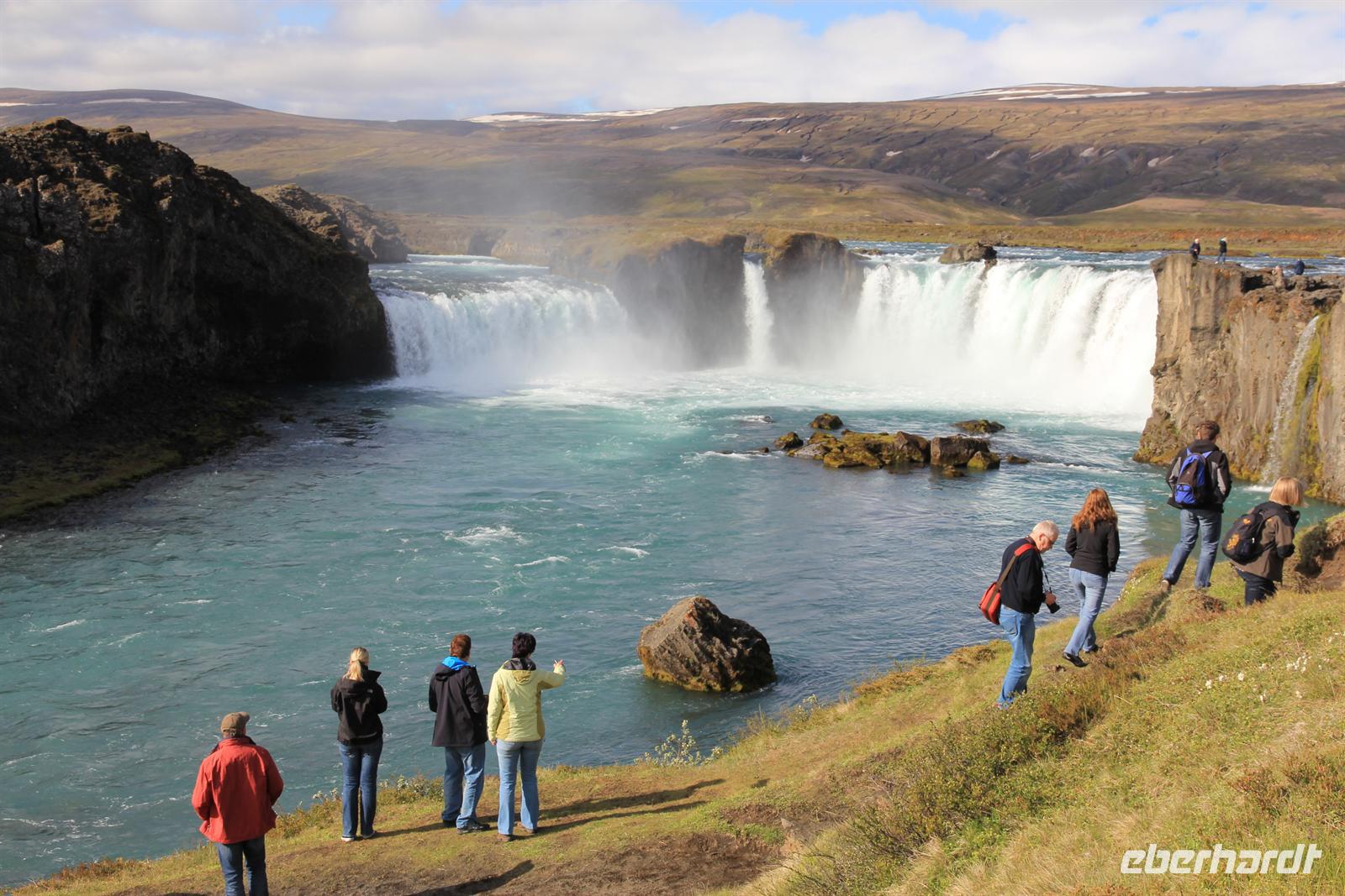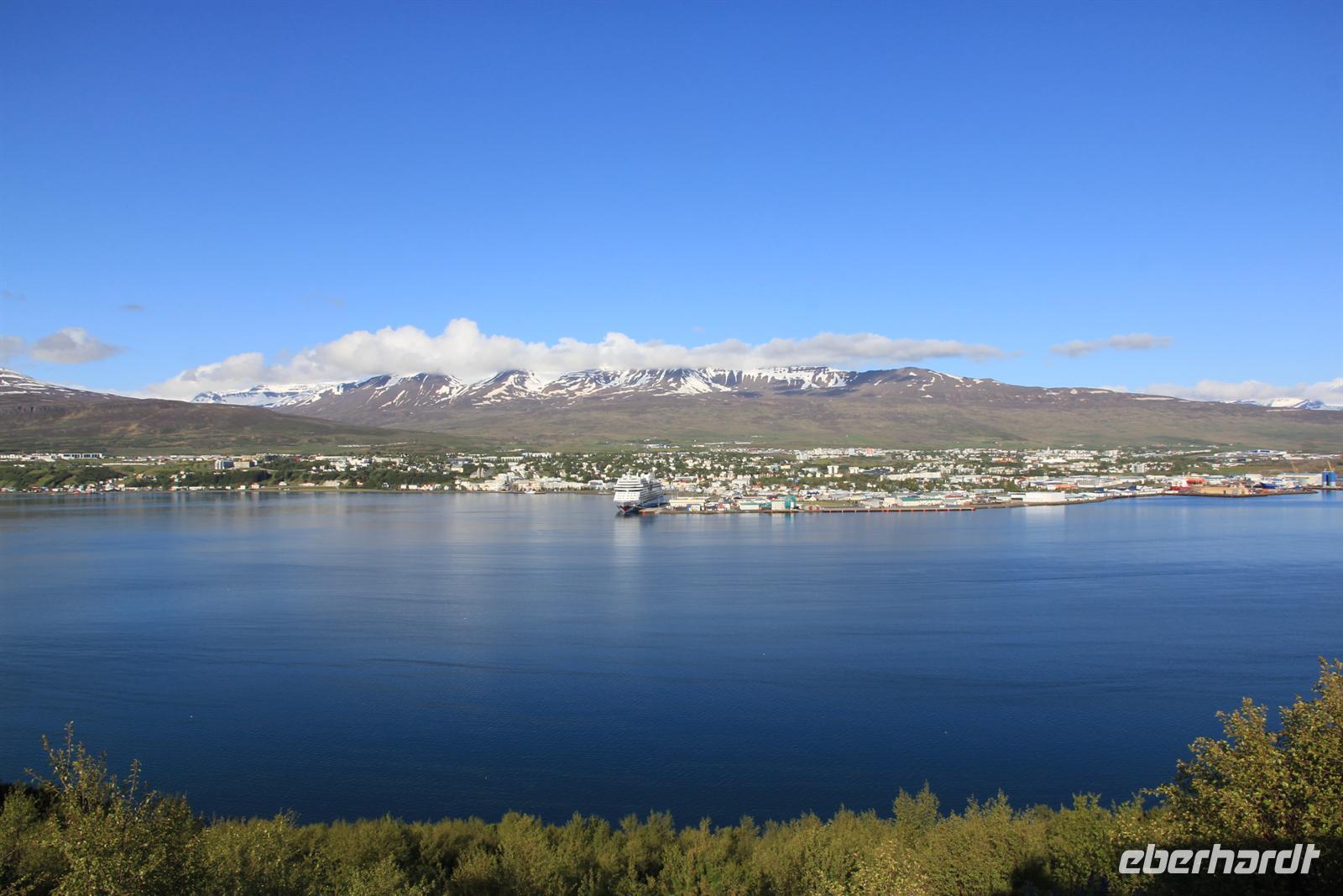 Land in Sicht hieß es früh am Morgen beim Einlaufen in den wunderschönen Eyjafjödur. Bei strahlendem Sonnenschein wollten wir heute die zauberhaften isländischen Naturwunder des Nordens kennen lernen. Von Akureyri aus begannen wir unsere Tour vorbei an dem gewaltigen Wasserfall Godafoss, rund um den See Myvatn. Der Mückensee machte seinen Namen alle Ehre und so wurden wir beim Aussteigen von Millionen der kleinen schwarzen Tierchen begrüßt. Im Lavalabyrinth Dimmubogir unternahmen wir eine herrliche Wanderung, bei der wir so einige Tierwesen in den seltsamen Lavagebilden erkennen konnten. Beim Mittagessen konnten wir eine typisch isländische Fleischsuppe kosten und dabei einen traumhaften Ausblick über das Myvatn-Gebiet und Dimmubogir werfen. Anschließend statten wir noch dem Hochtemperaturgebiet Namaskard einen Besuch ab. Wie in einer Hexenküche sah es hier aus. Es blubberte, brodelte und stank gewaltig nach Schwefel. Beglückt von diesen vielen Eindrücken fuhren wir durch die vielseitige Natur zurück zu unserem Heim auf Zeit. Bei strahlendem Sonnenschein konnten wir die Fjordausfahrt wunderbar genießen und zahlreiche Wale beobachten.