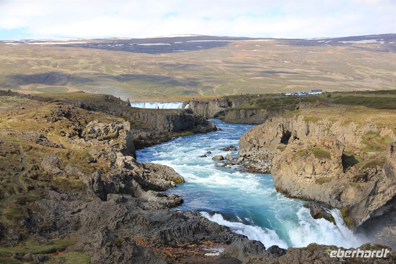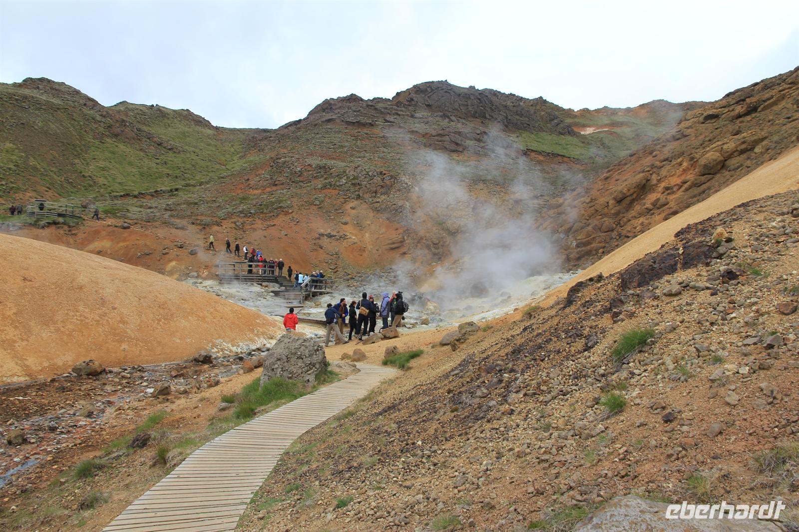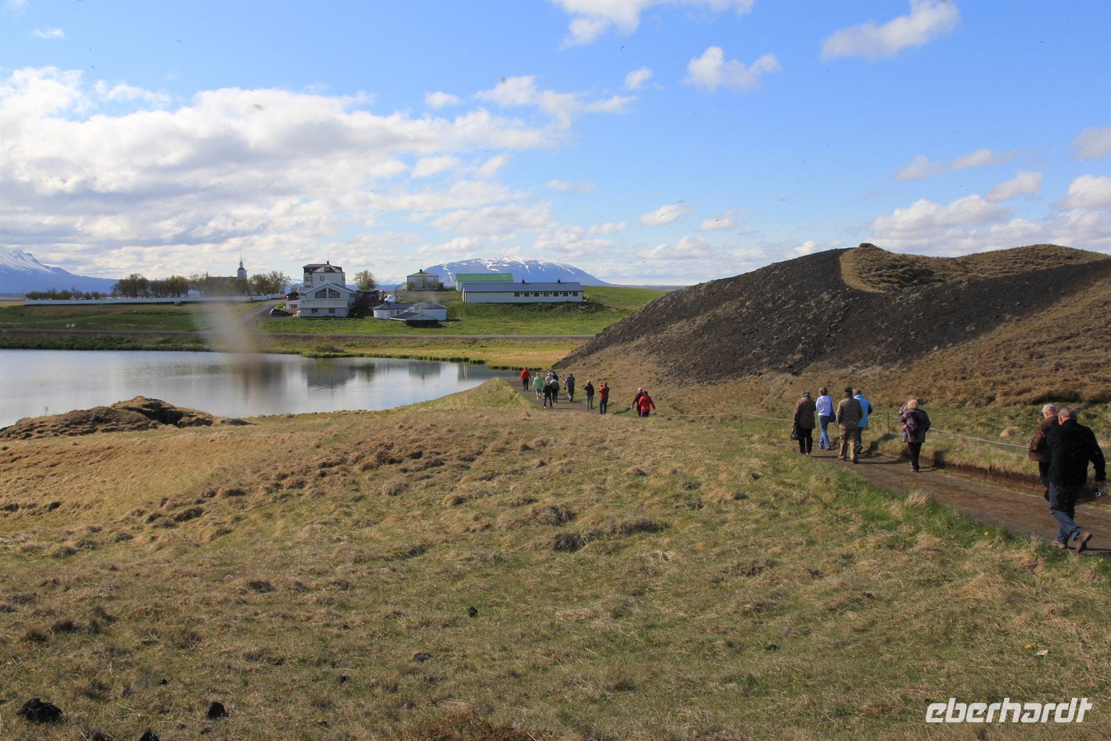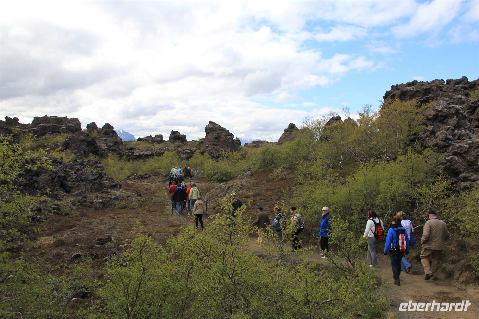 Land in Sicht hieß es früh am Morgen beim Einlaufen in den wunderschönen Eyjafjödur. Bei strahlendem Sonnenschein wollten wir heute die zauberhaften isländischen Naturwunder des Nordens kennen lernen. Von Akureyri aus begannen wir unsere Tour vorbei an dem gewaltigen Wasserfall Godafoss, rund um den See Myvatn. Der Mückensee machte seinen Namen alle Ehre und so wurden wir beim Aussteigen von Millionen der kleinen schwarzen Tierchen begrüßt. Im Lavalabyrinth Dimmubogir unternahmen wir eine herrliche Wanderung, bei der wir so einige Tierwesen in den seltsamen Lavagebilden erkennen konnten. Beim Mittagessen konnten wir eine typisch isländische Fleischsuppe kosten und dabei einen traumhaften Ausblick über das Myvatn-Gebiet und Dimmubogir werfen. Anschließend statten wir noch dem Hochtemperaturgebiet Namaskard einen Besuch ab. Wie in einer Hexenküche sah es hier aus. Es blubberte, brodelte und stank gewaltig nach Schwefel. Beglückt von diesen vielen Eindrücken fuhren wir durch die vielseitige Natur zurück zu unserem Heim auf Zeit. Bei strahlendem Sonnenschein konnten wir die Fjordausfahrt wunderbar genießen und zahlreiche Wale beobachten.