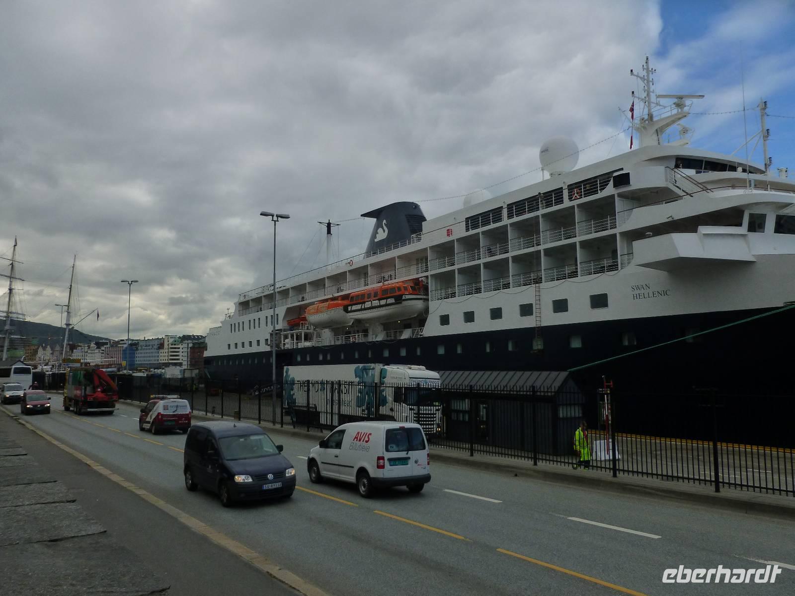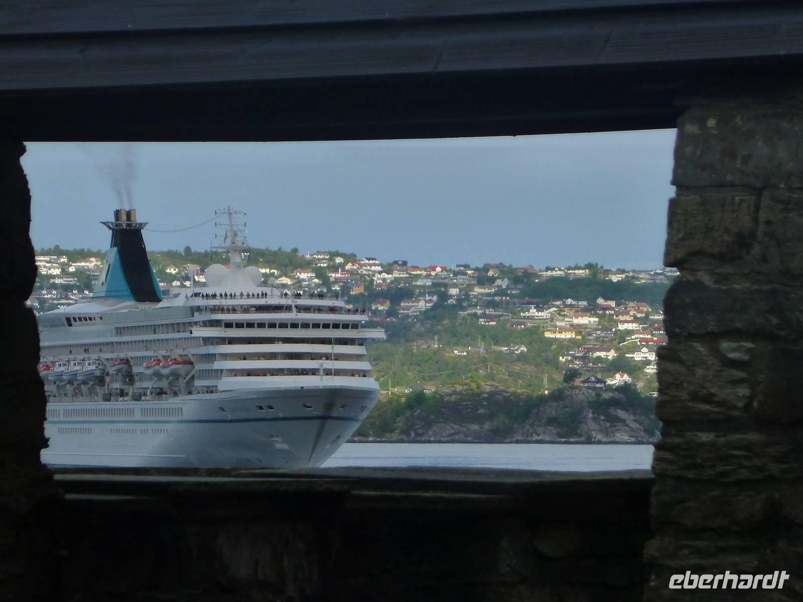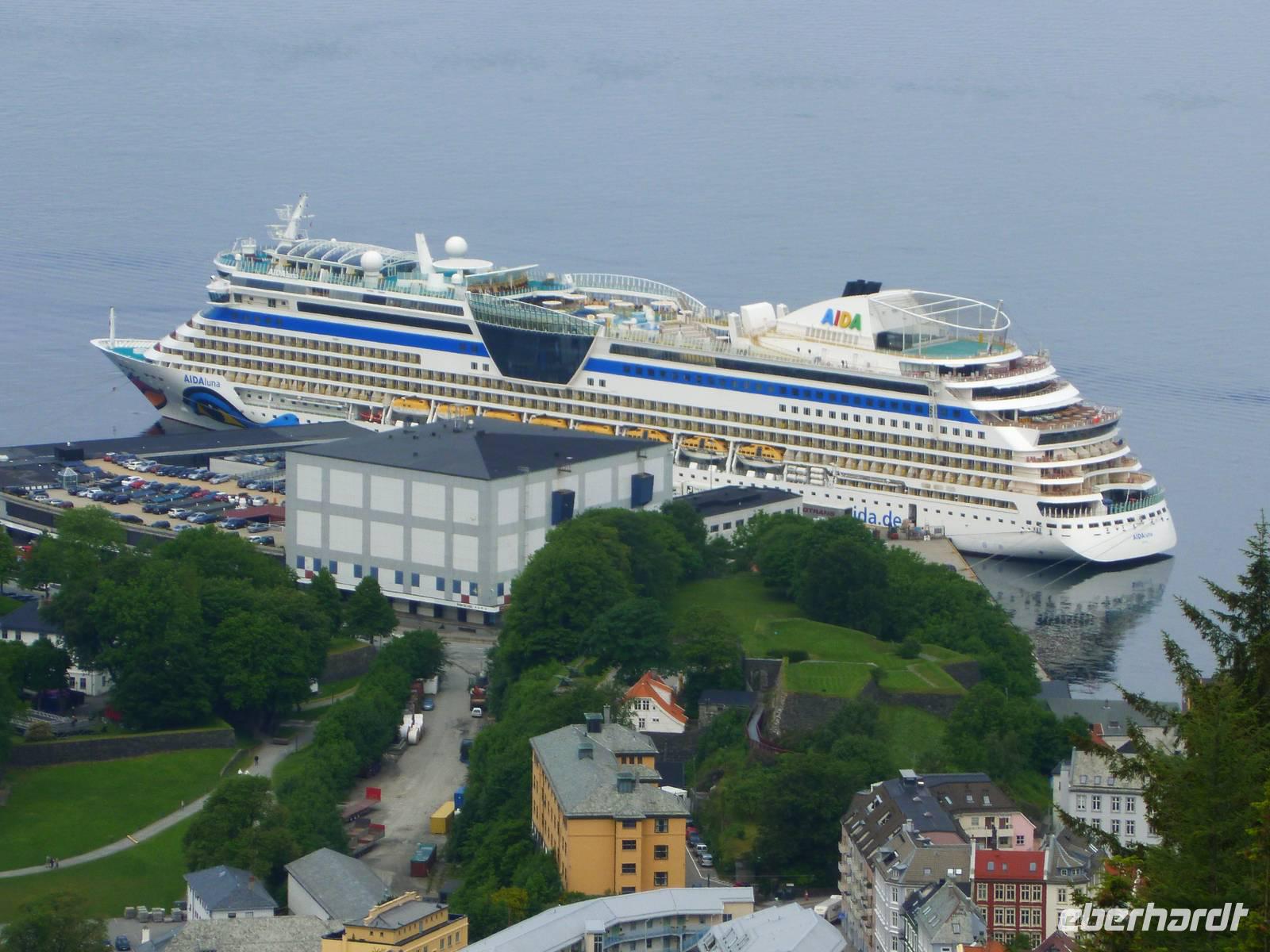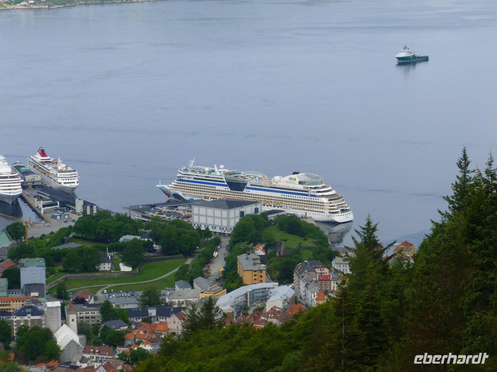 Gegen 08 Uhr liefen wir im Hafen Bontelabo der Stadt Bergen ein. Bergen gilt als eine der schönsten Metropolen des Nordens. Den Namen „Königin der Fjorde" verdankt Sie Ihrer Lage im Bezirk Fjordland, umrahmt von sieben Bergzügen und als Verbindung von sieben Fjorden. Auch der Beiname „heimliche Hauptstadt Norwegens" zeigt wie bedeutend die Stadt im Norden ist. Unseren ersten Landgang unternahmen wir zu Fuß geführt von einem örtlichen Gästeführer. Direkt vom Schiff aus liefen wir durch die Parklandschaft mit der Hakonshalle, heute als Konzerthalle genutzt, vorbei am Rosenkrantztarnet, einem alten Wehrturm, bis zum alten Hanseviertel Brygge. Dieser in der Geschichte bedeutendste Stadtteil zählt zu den UNSECO erhaltenswürdigen Baudenkmäler. In Brygge (= Deutsche Brücke) befanden sich früher die Wohnviertel deutscher Kaufleute. Hinter den bunten Holzfassaden der spitzgiebeligen Handelshäuser erstreckt sich ein Labyrinth von Gässchen, Stiegen und Kellerhäusern. Unser Spaziergang führte uns weiter an der Kreuzkirche vorbei, welche aber aufgrund von Restaurierungsarbeiten nicht zugänglich ist, bis zu der Floybahn. Dank unseres Gruppentickets mussten wir uns nicht an der langen Menschenschlage anstellen und konnte mit einer kurzen Wartezeit von circa 15 Minuten mit der Floyenbergbahn in sieben Minuten auf den Floyen fahren. 320 Meter über dem Meer genossen wir die Sicht auf Bergen und die weit gestreckte Fjordlandschaft aus der Vogelperspektive. Letzte Station unseres Stadtrundganges war das Hanseatische Museum, in dem das Leben der deutschen Kaufleute dargestellt wird. Die anschließende Zeit bis zum Ablegen der AIDA um 18 Uhr nutzte jeder nach eigenem Belieben. Sicher hat da ein Besuch des Fischmarktes in Bergen nicht gefehlt.