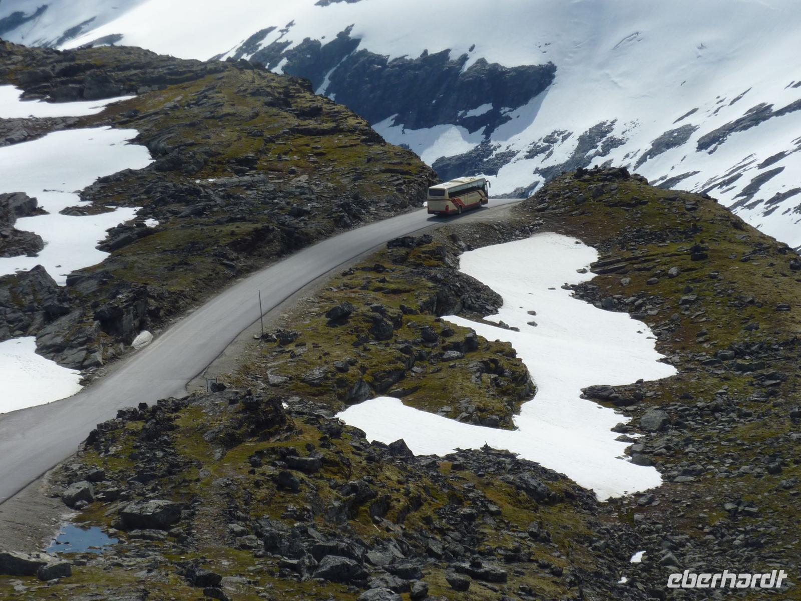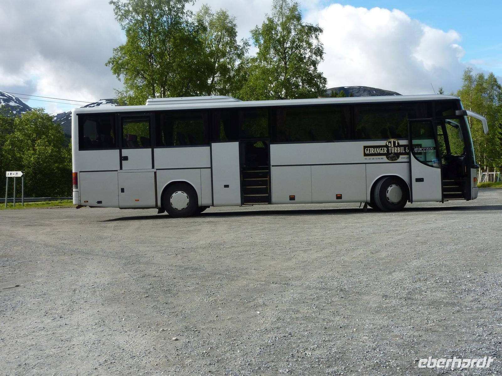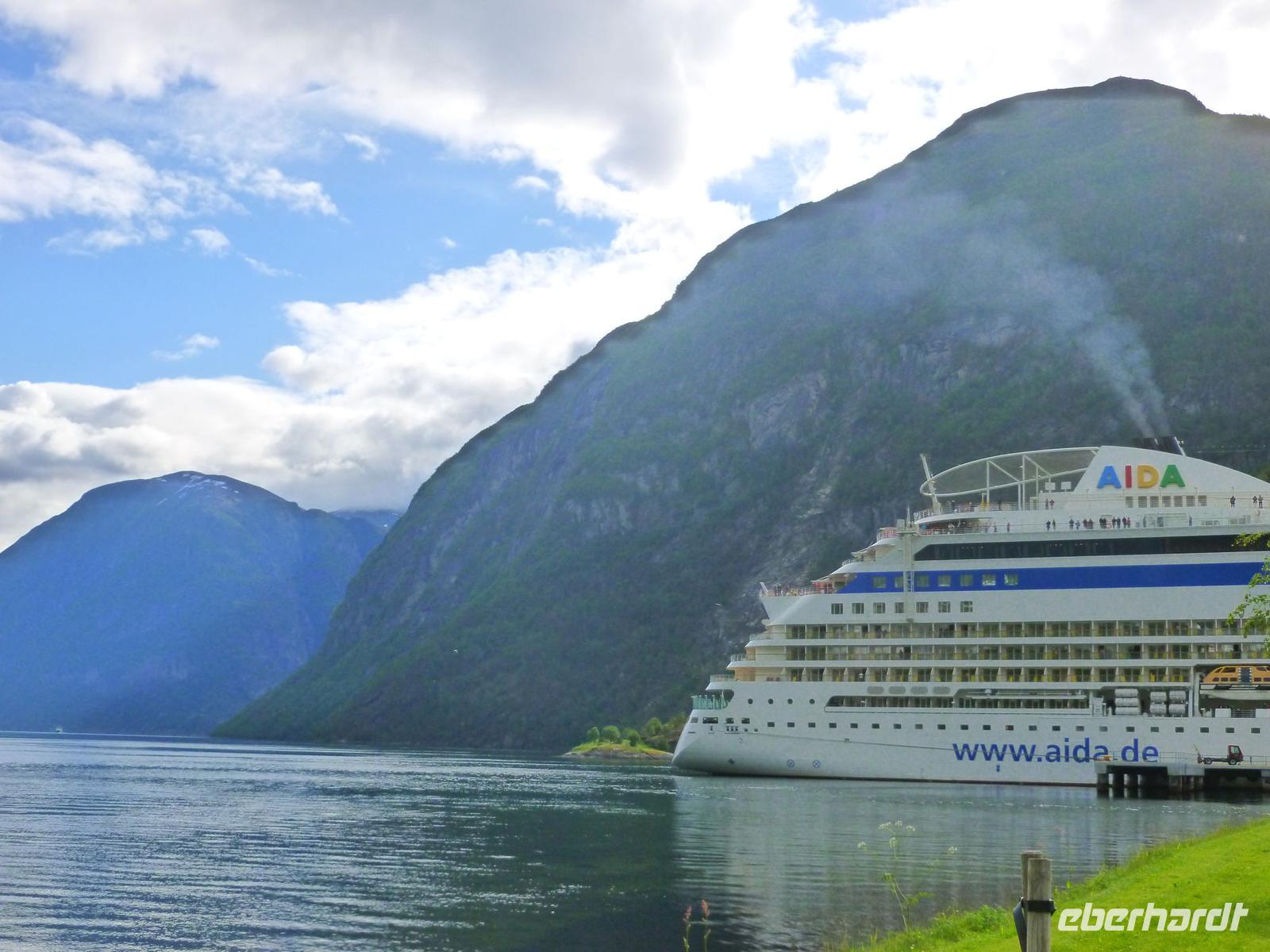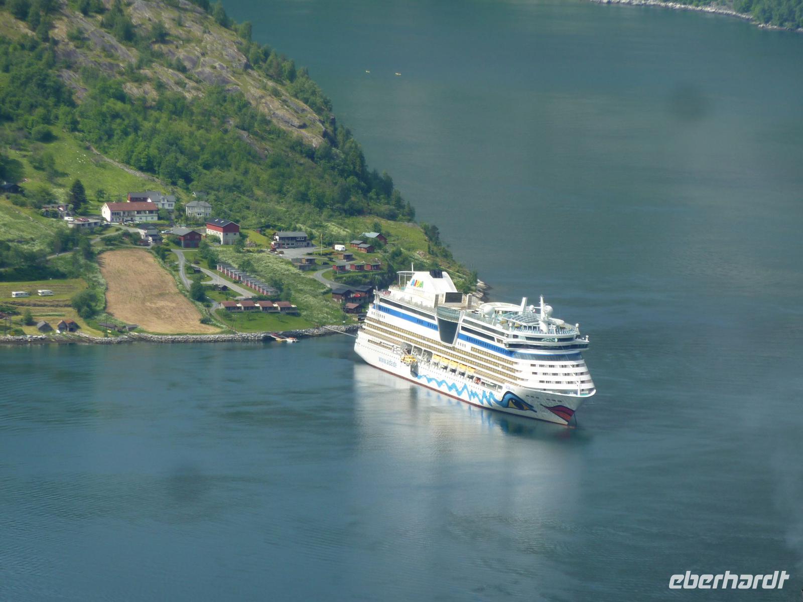 Heute hieß es etwas früher zu frühstücken, denn wir trafen uns bereit 08:15 Uhr zu unserem heutigen Ausflug von Hellesylt, dem Eingang zum Geirangerfjord, nach Geiranger. Viele waren aber schon früher an Deck und genossen die Fahrt in den Fjord hinein. Wieder ganz pünktlich trafen wir uns auf Deck 5. Die Wettervorhersagen versprachen einen schönen Tag und so machten wir uns voller Vorfreude auf den Weg. In Hellesylt empfing uns unsere heutige Reiseleiterin Mariana und unser Chauffeur bei Sonnenschein. Wir liefen vom Schiff circa 500 Meter zum Wasserfall des Flusses Langedalserva und stiegen von hier in unseren Bus. Unsere sympathische, gut aussehende Reiseleiterin für den Tag kommt aus Hamburg und arbeitet in der Saison hier in Norwegen. Während der Busfahrt erzählte Sie uns viel Interessantes über die Landschaft und die Menschen hier in Norwegen. Bei strahlendem Sonnenschein fuhren wir durch die gebirgige tolle Landschaft von Hellesylt Richtung Hornindal. Am See von Hornindal, wo es ein großes Seeungeheuer geben soll, stoppten wir für ein paar Minuten. Die schöne Landschaftsfahrt führte uns dann in das kleine, ruhige Städtchen Stryn, wo wir unsere einstündige Mittagspause verbrachten. Kleine Läden und Kaffees luden zum Bummeln oder Verweilen ein. Von Stryn fuhren wir weiter bis zum Nationalpark Jostedalsbreen, wo sich auf 487 Quadratkilometern der größte Gletscher auf europäischem Festland befindet. Unsere Reise führte uns weiter auf steilen, kurvigen Bergstraßen hinauf zum Tystigengletscher, wo sich das Sommer-Skigebiet befindet. Bei strahlender Sonne konnten wir hier noch die weißen Schneewände bestaunen. Unser nächstes Ziel war der 1494 Meter hohe Gipfel Dalsnibba. Von hier oben hatten wir einen unvergleichbaren Blick auf den tief unten liegenden Geirangerfjord, die steilen Felswände, Seen und Gletscher. Unsere AIDAluna sah von hier oben, wie eine kleine Stecknadel aus.
