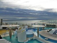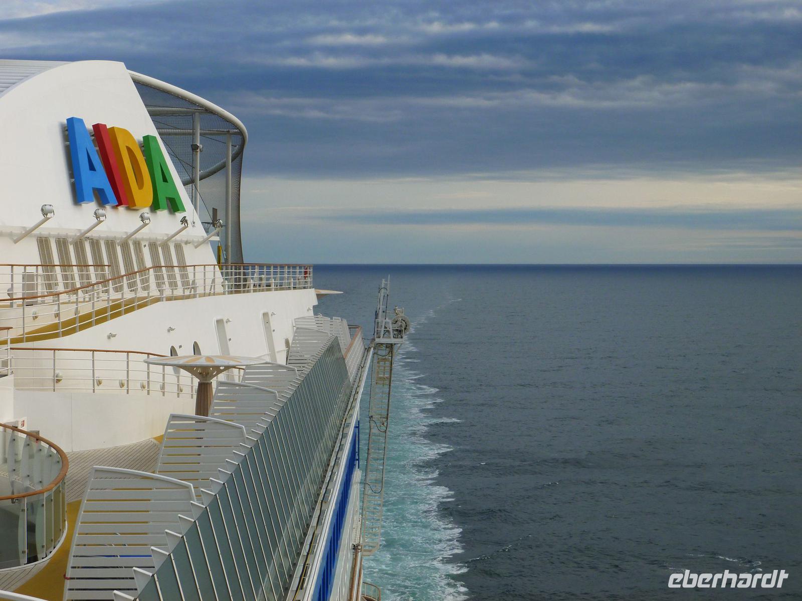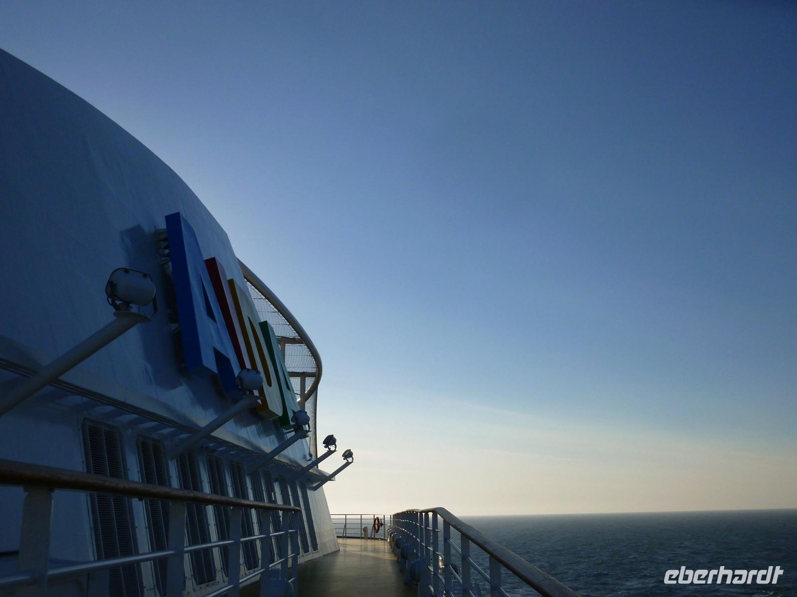 Beim heutigen Aufwecken merkte man am sanften Schaukeln, dass wir auf offener See waren. Kein Land in Sicht, nur das Meer mit leichtem Seegang. Jeder nahm sein Frühstück im Restaurant seiner Wahl ein. Hier und da traf man ein bekanntes Gesicht oder lernte neue Bekanntschaften kennen. Um 11 Uhr trafen wir uns alle in der AIDA Bar, wo uns Nicole zum Sektempfang eingeladen hatte. Hier stießen wir alle auf eine schöne, gemeinsame Reise an und besprachen noch einige Fragen zu den bevorstehenden Ausflügen. Um 11.30 Uhr nahmen wir am einstündigen Schiffsrundgang teil, der uns eine bessere Orientierung gab.