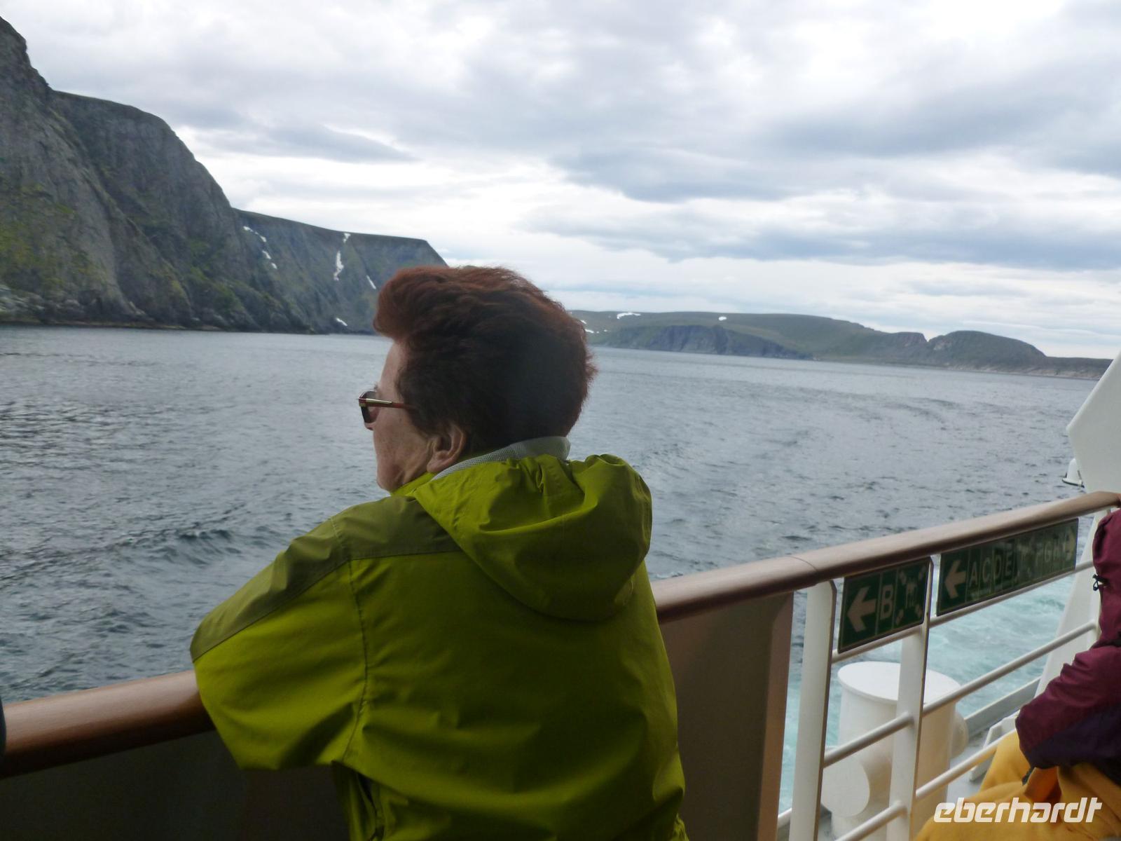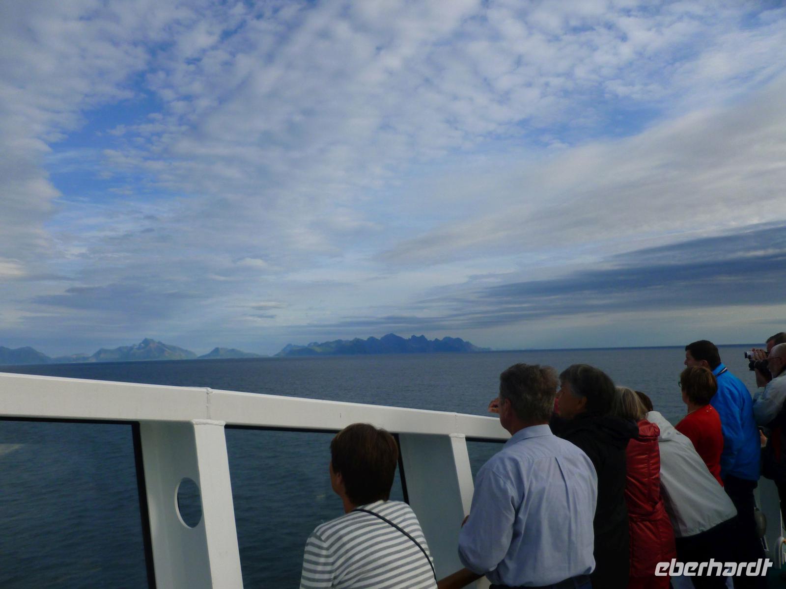 Auf der Weiterfahrt gen Norden verbrachten wir den heutigen Tag auf See. Gegen 16 Uhr war wieder Land in Sicht - die Lofoten. Für 16:30 Uhr hatte uns Nicole zu einem Norwegen Vortrag eingeladen und so trafen wir uns auf Deck 6 im Konferenzraum, der nur für die Eberhardt Gruppe reserviert war, wieder. Nicole erzählte uns über das vergangene und das jetzige Norwegen, über die Landschaft und die Menschen, die hier leben und über berühmte Norweger, wie Roland Amundsen, der als erster die Ost-West-Passage durchquerte und vor Robert Scott am Südpol ankam. Oder aber Fridtjov Nansen, welcher Grönland von Ost nach West durchquerte und mit der Fram-Expediton die Eisdrift Richtung Nordpol belegte. Aber auch in der Kunst gab es Berühmtheiten zu erwähnen. So der bedeutenste norwegische Komponist Edvard Grieg, bekannt vor allem durch die Suite Nr. 1, aber auch die Maler J.C. Dahl und Edvard Munch. Danach gab uns Nicole noch ein paar Hinweise für den morgigen Tag mit dem Ausflug zum Nordkap.