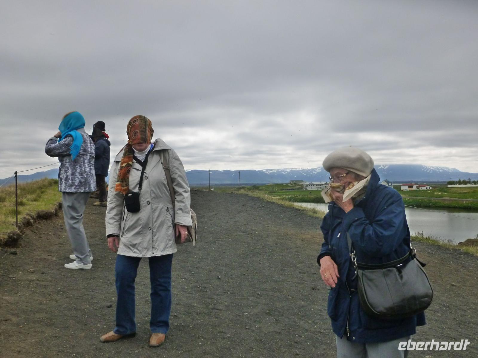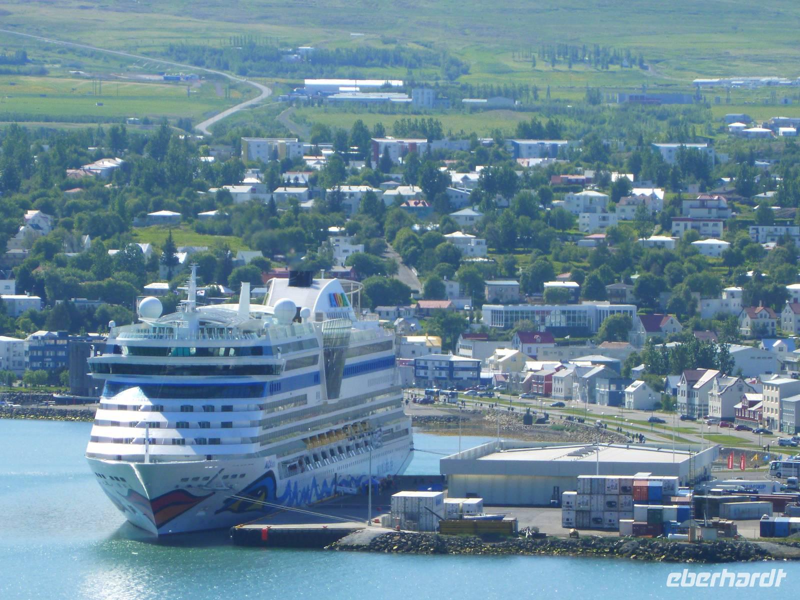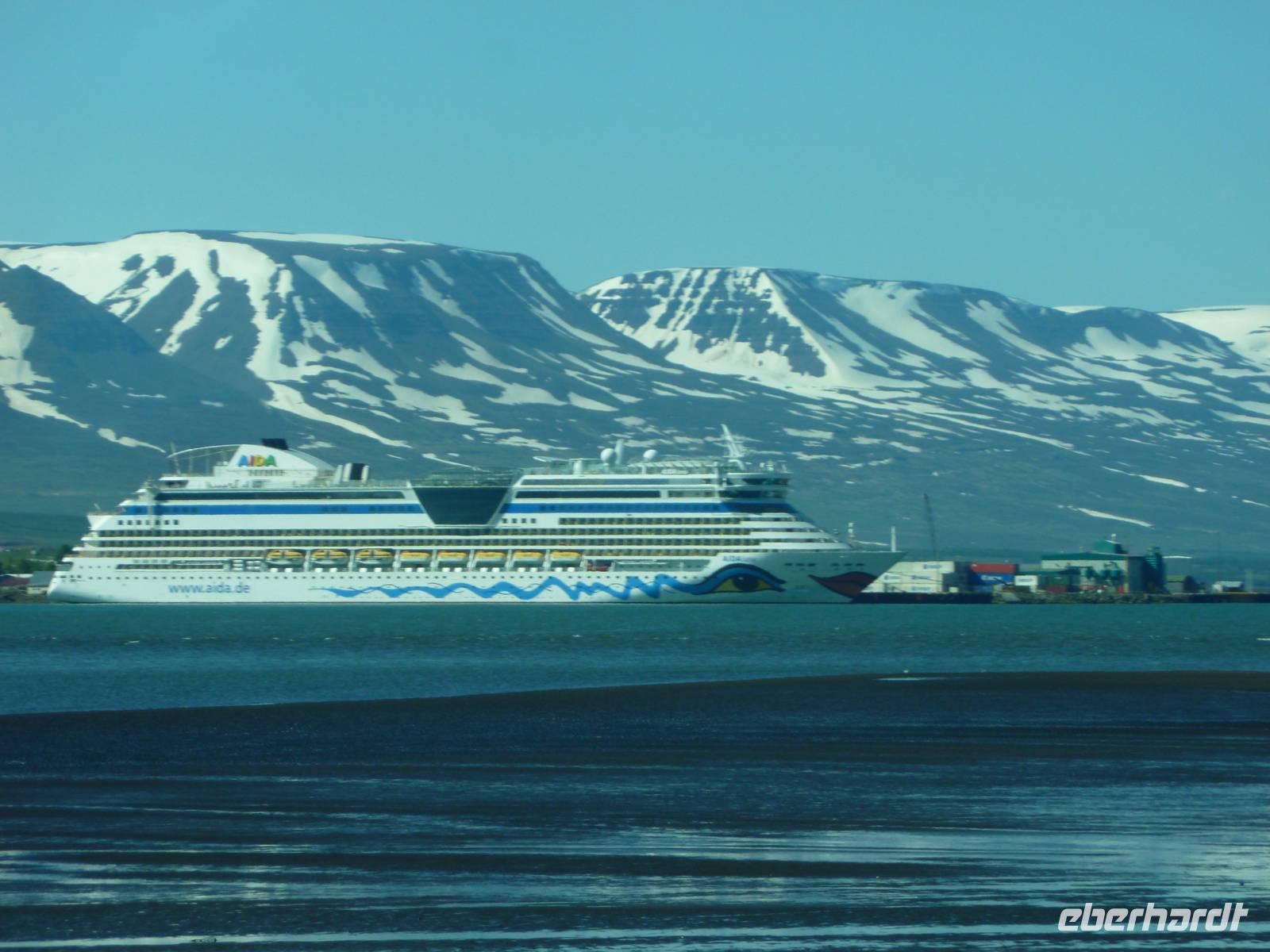In der Nacht hatten wir die Uhren erneut um eine Stunde zurück gestellt und waren somit auf isländische Zeit eingestellt. 08:30 Uhr lief die AIDA im Hafen von Akureyri ein. Wieder super pünktlich trafen wir uns alle auf Deck 5 und gingen zusammen von Bord. An den vielen AIDA Bussen vorbei, fanden wir auch schnell unseren heutigen örtlichen Reiseleiter Walter. Walter ist gebürtiger Schweizer und lebt seit über 50 Jahren hier auf Island. Sein großes Wissen über dieses faszinierende Land und die Menschen erzählte er uns auf der Busfahrt und auf den Rundgängen. Mit dem Bus fuhren wir als erstes zum Godafoss, dem Götterwasserfall, der seinen Namen aus der Zeit der Christianisierung bekam. Nach einem kurzen Spaziergang am Flusslauf stiegen wir wieder in den Bus und fuhren nach Skútusdadir am Mývatn, dem Mückensee. Der Mückensee ist der viertgrößte See Islands und macht seinen Namen alle Ehre. Schon als wir aus dem Bus stiegen, fielen die Mücken über uns her. Auch wenn Sie nicht stechen, sind sie sehr lästig, denn sie setzen sich am liebsten ins Gesicht und die Ohren. Eingemummelt und verschleiert mit Tüchern spazierten wir circa 20 Minuten am Mückensee und sahen die faszinierenden Pseudokrater. Pseudokrater sind keine Vulkane. Sie entstanden, als heiße Lava über einen feuchten Untergrund, wie flache Seen geflossen ist. Durch die Hitze verdampfte das Wasser explosionsartig und sprengte dabei die Krater in die Landschaft. Weiter ging unsere Fahrt nach Dimmuborgir in den Lava-Irrgarten. Hier spazierten wir bei strahlendem Sonnenschein 30 Minuten durch die bizarren Lavaformationen. Danach stärkten wir uns zu Mittag mit drei verschiedenen Suppen, frischem Brot oder Brötchen. 13 Uhr fuhren wir mit dem Bus weiter nach Namaskard. Dabei fuhren wir über die Grenze zwischen der eurasischen und der amerikanischen Kontinentalplatte. Kurz nach der Passhöhe liegt am Fuße des Berges Námafjall das beeindruckende Solfatarenfeld Hverarönd. Überall blubbern und zischen die heißen Schlammtöpfe und ein Geruch von faulen Eiern liegt in der Luft. Wir spazierten 30 Minuten durch dieses Gebiet und bestaunten die gewaltige Kraft da unter der Erde. Von hier fuhren wir über die Ringstraße mit zwei weiteren Fotostopps zurück nach Akureyri. Kurz vor der Stadt genossen wir noch einen schönen Blick auf Akureyri, den Hafen und die mächtige AIDA, neben der die Häuser winzig wirkten. Bei wohligen 17 Grad, Sonnenschein, blauen Himmel und klarer Luft ließen wir den schönen Tag langsam ausklingen.
