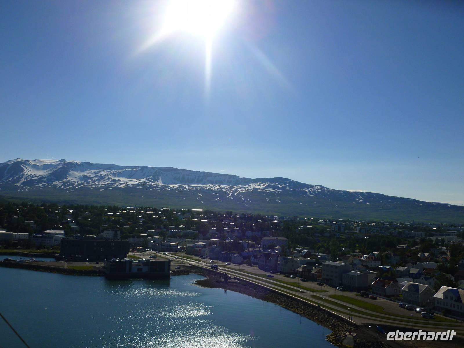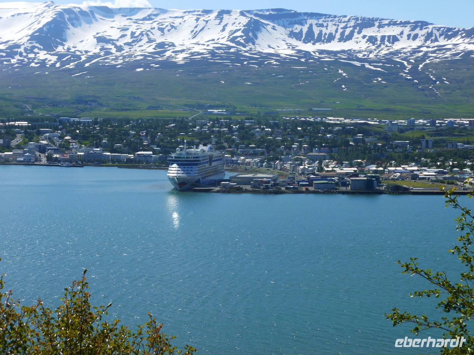 In der Nacht vom Donnerstag auf den Freitag stellten wir die Uhren um eine Stunde zurück. Unser Schiff hatte die Küste Norwegens verlassen und wir fuhren über die weite See Richtung Island. Zwei Seetage dauerte die Überfahrt vom Nordkap bis zur nördlichen Stadt Akureyri auf Island. Das umfangreiche Unterhaltungsangebot hielt für jeden etwas dabei und ließ sicher keine Langeweile aufkommen. Ob Sport, Sauna und Massage, Tanzkurs oder die zahlreichen interessanten Vorträge, gepaart mit den kulinarischen Köstlichkeiten der verschiedenen Restaurants und Bars. Oder auch die Bibliothek und die Spielesammlung sorgten für einen netten Zeitvertreib.