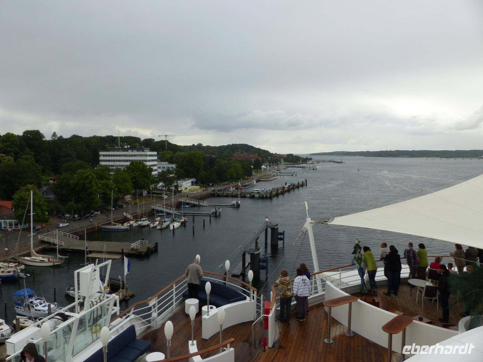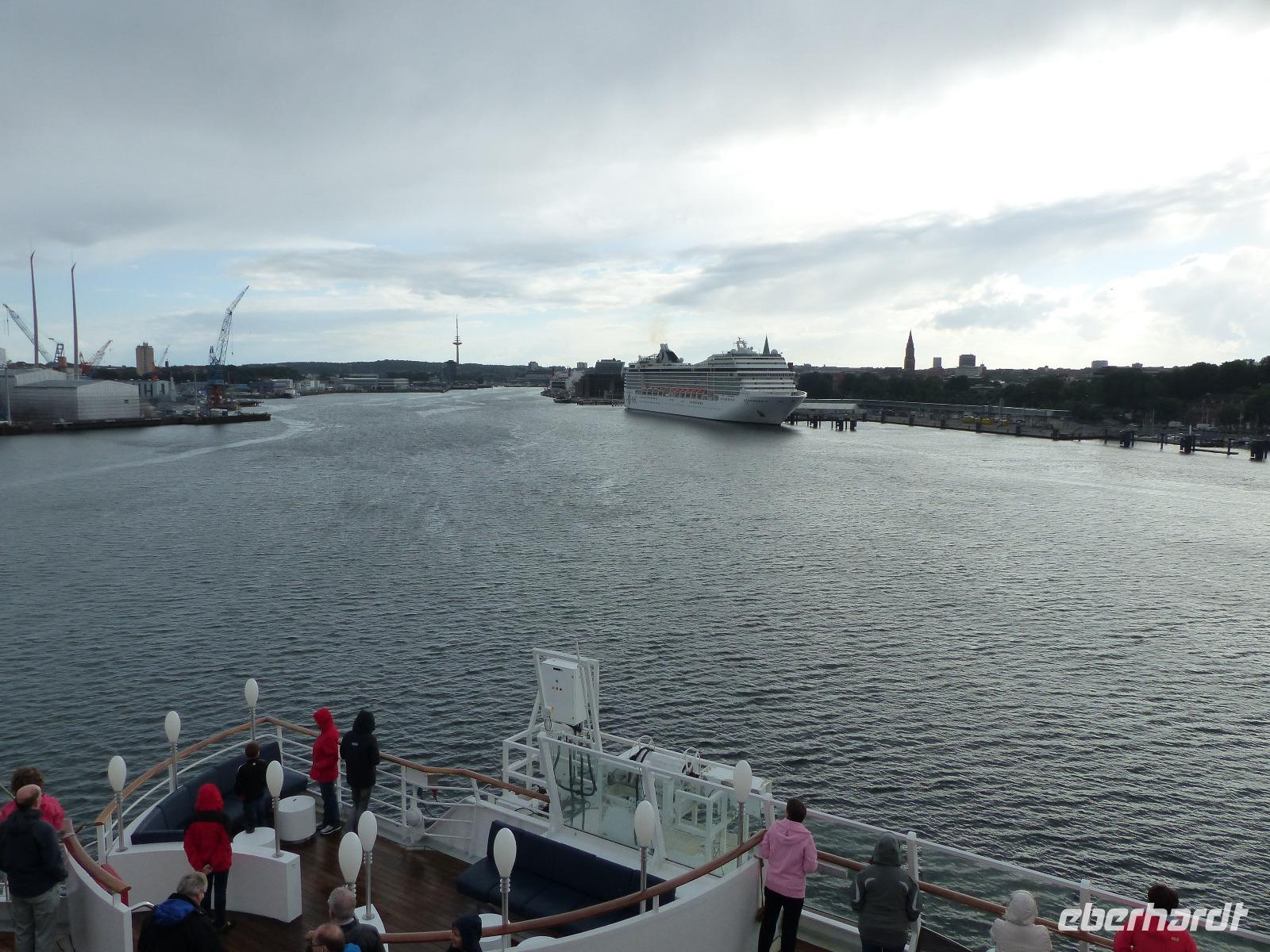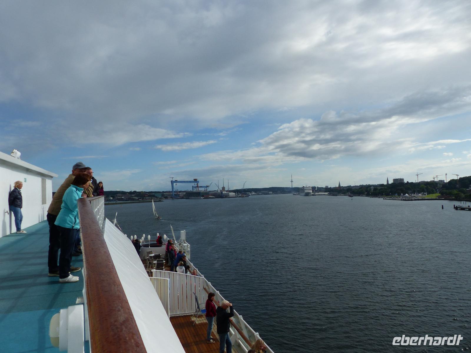 Recht früh beginnt für viele Gäste unserer Gruppe der Samstagmorgen. Bereits um 6 Uhr treffen wir uns in Dresden und starten unsere Anreise nach Kiel pünktlich. Auf dem Weg dahin haben wir weitere Zustiege wie Leipzig Flughafen, Michendorf und Fehrbellin. Leider werden unsere Fahrtstunden durch etwas Stau unnötig verlängert, aber die ein oder andere Erzählung lässt die Zeit etwas schneller vergehen. Am Nachmittag, gegen 15:30, kommen wir am Hafen in Kiel an und unsere Reise mit AIDAVita beginnt. Nach einem schnellen Check In und einem Sicherheitscheck, geht es für uns an Bord, wo wir alle bereits freundlich begrüßt werden. Um unser Gepäck brauchen wir uns auch keine Sorgen machen, denn dieses wird parallel von fleißigen Helfern an Bord und somit direkt zu unserer Kabine gebracht. Nach einer ersten Erkundung der Kabine, werden wir unmittelbar zur Seenotrettungsübung aufgefordert. Es heißt Schwimmweste um und auf zum Musterdeck. Hier müssen wir geduldig warten, bevor es dann wieder zurück in die Kabine geht. Dann heißt es Auslaufen und die schöne Musik „Sail away" ertönt. Sogar der Regen macht eine kurze Pause und ein paar Sonnenstrahlen kommen durch. Unsere Fahrt kann beginnen! Ein erstes Abendessen lässt den Tag am Abend lecker ausklingen.