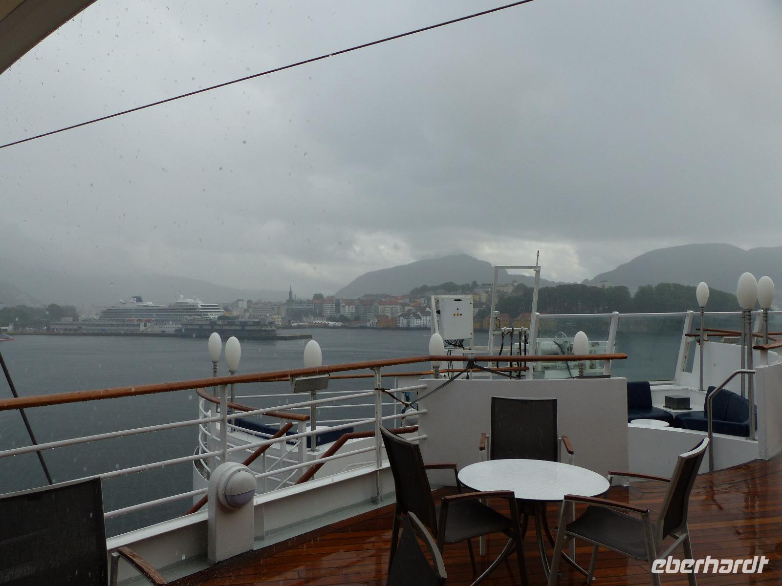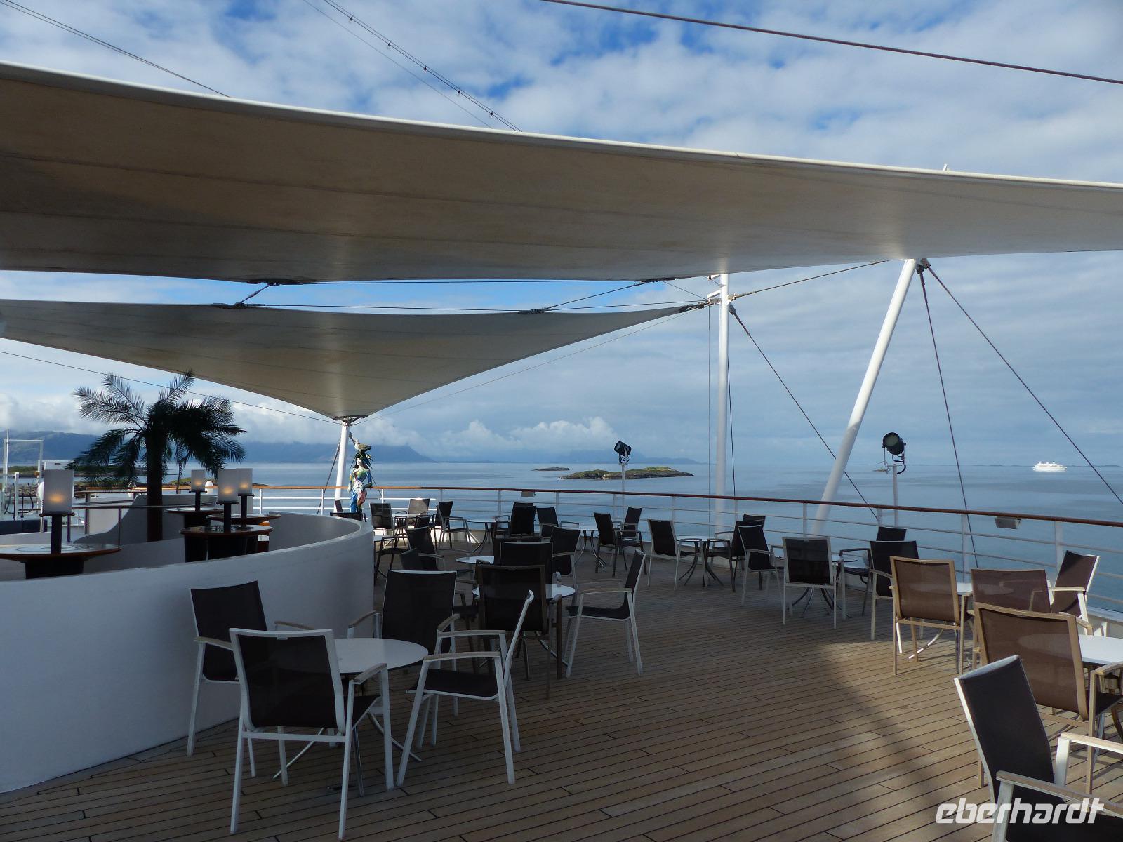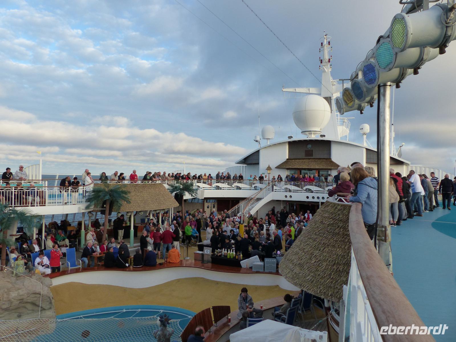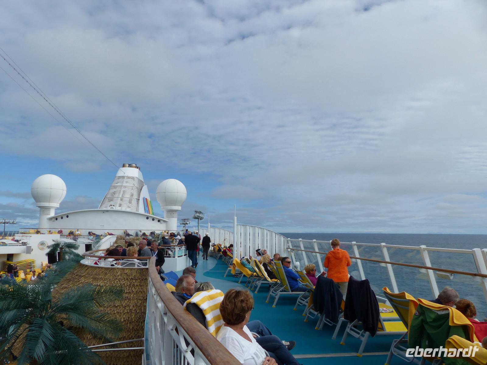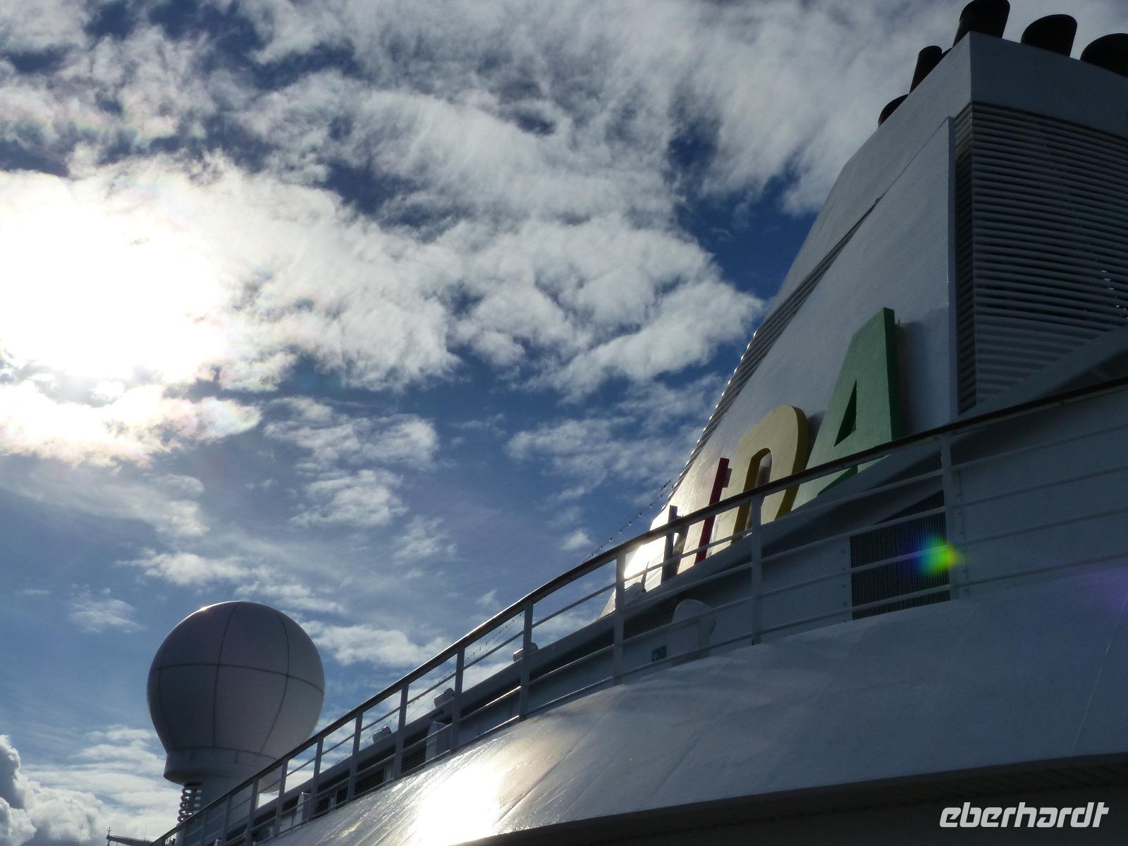 Insgesamt heißt es seit gestern Mittag auf nach Haugesund! Allerdings liegen ganze 1839 km Entfernung noch zwischen uns und der Hafenstadt an der Südwestküste Norwegens. Ein Tag mit herrlichem Sonnenschein und ein Tag mit bedeckten Himmel und Regenschauern am Vormittag begleiten uns. Dank der zahlreichen Angebote an Bord wird es aber so schnell auch niemanden langweilig. Während der ein oder andere kleine Rundgänge an Bord unternimmt, zieht es andere in den Fitnessbereich des Schiffes, sodass entweder an Kursen teilgenommen oder an einem der vielen Geräte trainiert werden kann. Aber auch das Theater wartet mit verschiedenen Angeboten. So lauschen viele den Vorträgen des Lektors David Bobisch oder den Ausflugspräsentationen der AIDA Scouts. An beiden Nachmitttagen findet ebenso ein Eberhardt-Travel Shuffleboard-Tournier auf dem Pooldeck statt- Sport frei! Nach etwas Spiel und Spaß haben wir uns dann auch das Kaffee trinken verdient. Hier hat man in der Regel die Auswahl ob man lieber in die AIDA Bar oder ins Calypso Restaurant möchte. Natürlich bietet sich hier besonders die AIDA Bar an, denn hier kann man direkt im Anschluss noch das Tanzbein schwingen- ein täglicher Tanzkurs wird angeboten, bei dem natürlich Anfänger besonders auf Ihre Kosten kommen. Am Abend sind dann die Lachmuskeln gefragt- Comedy mit Markus Bart.