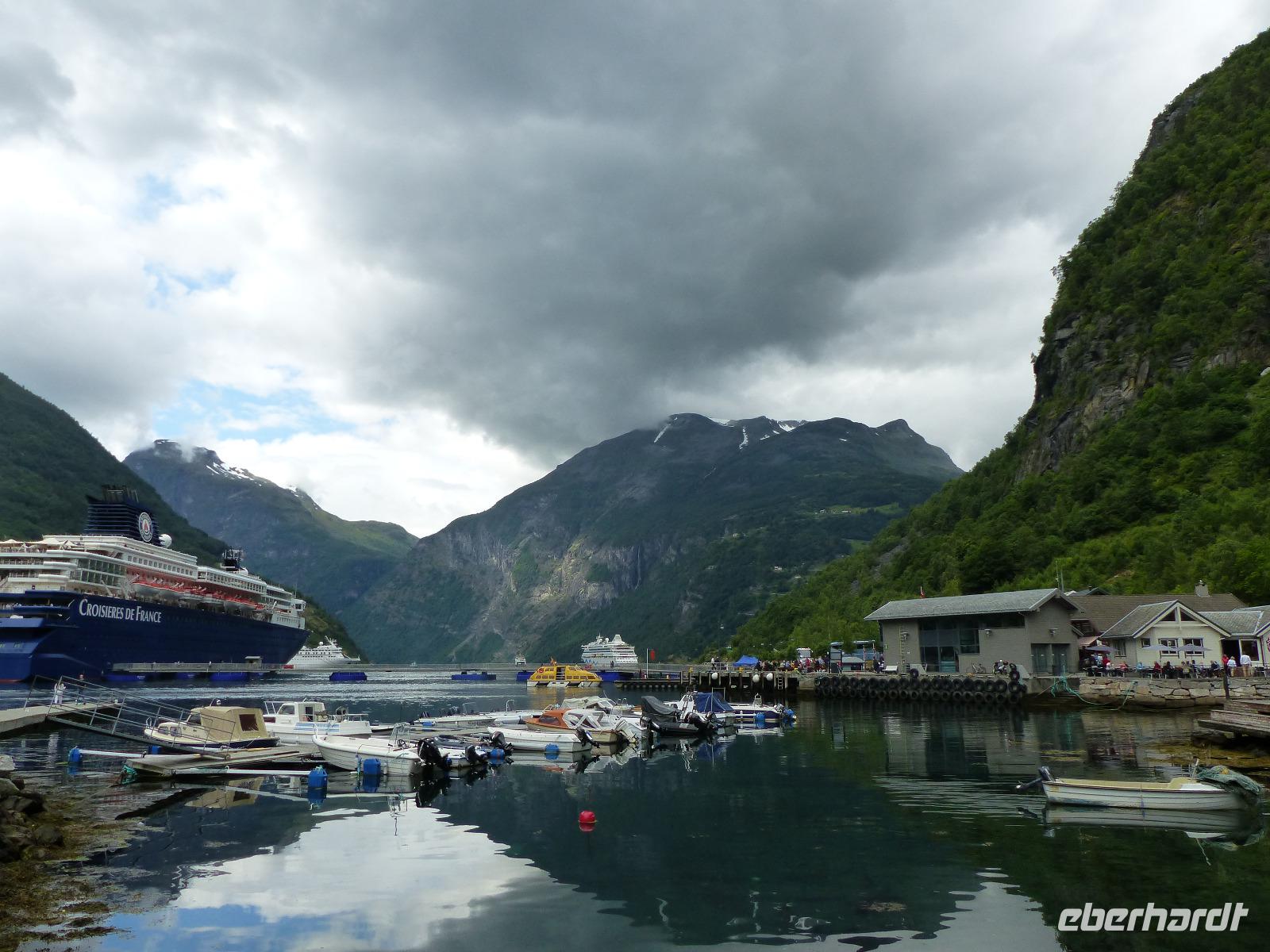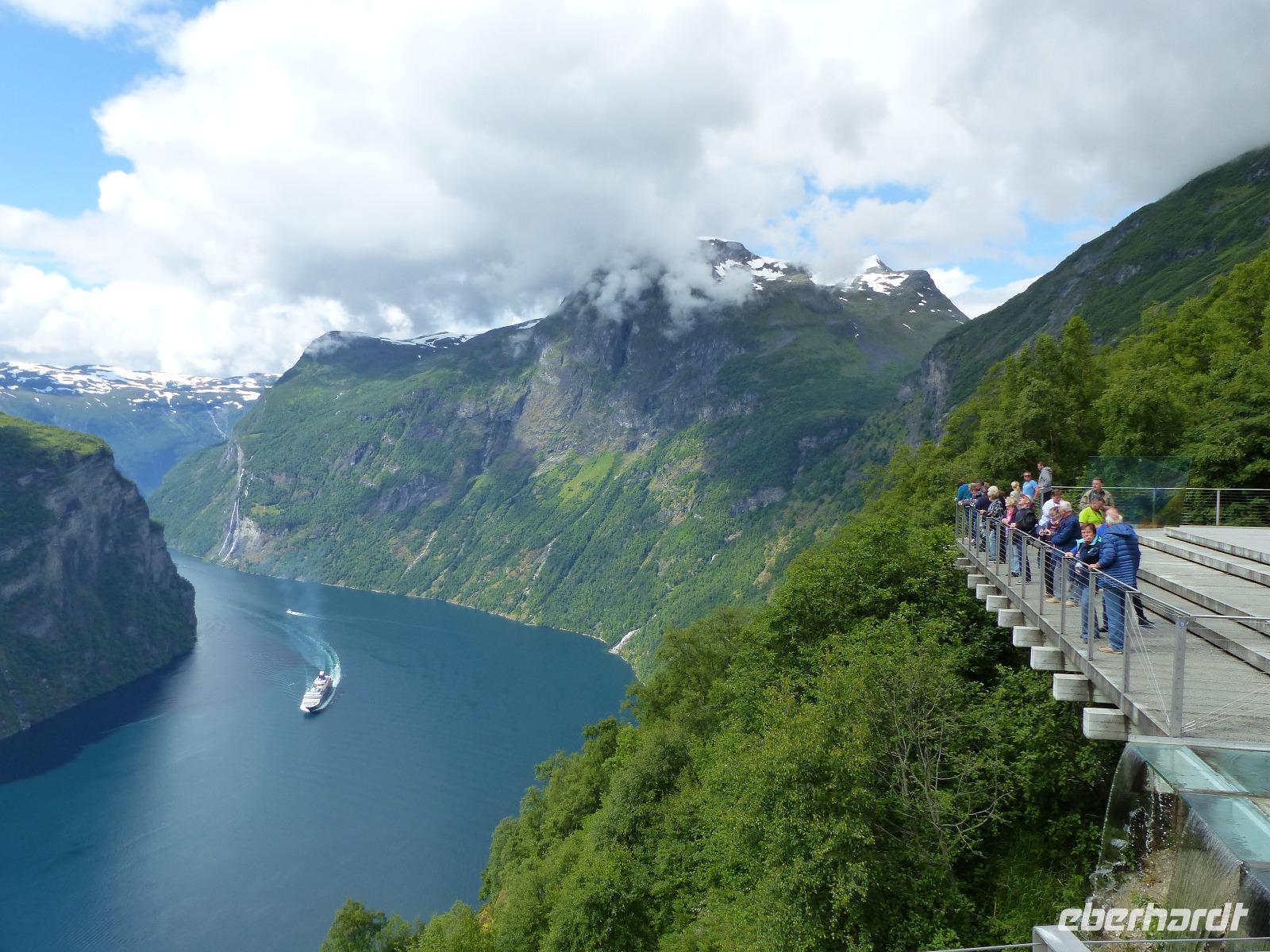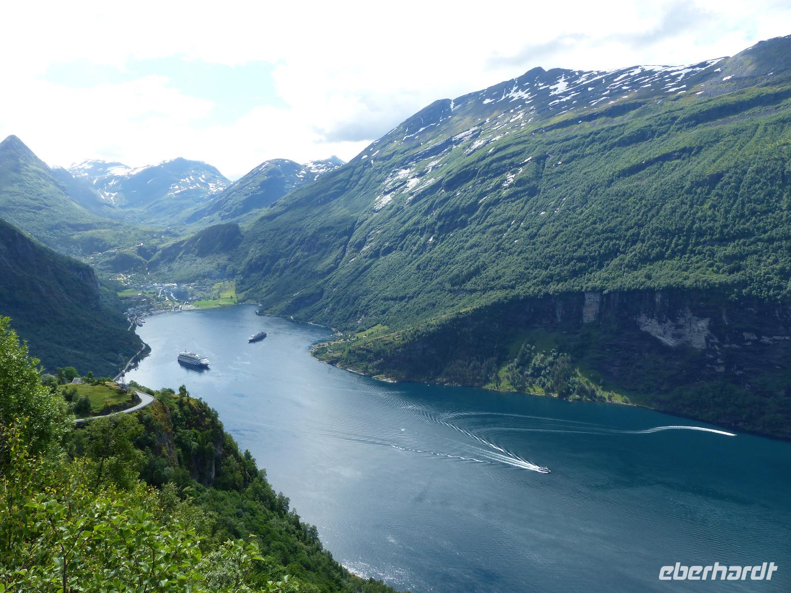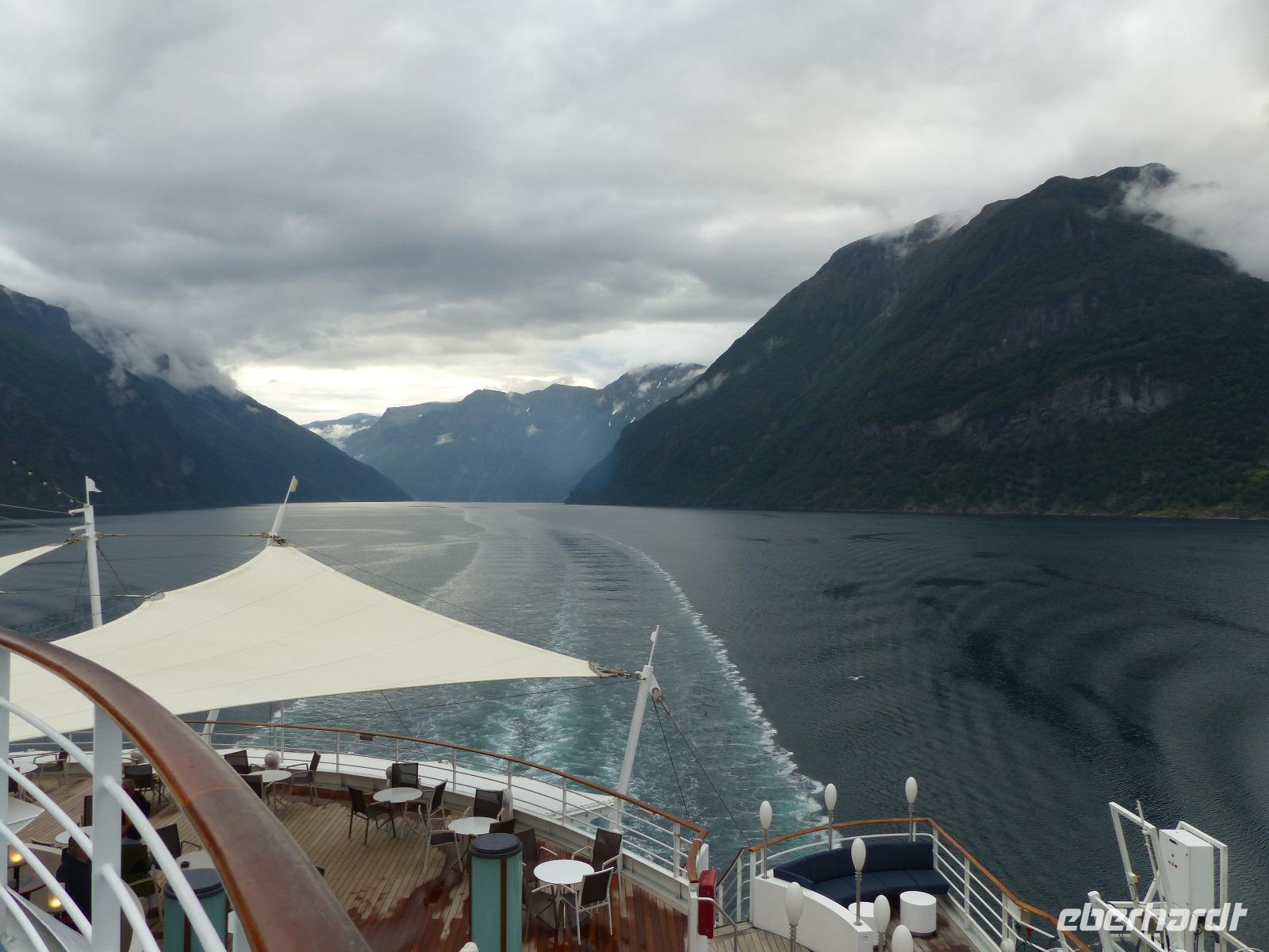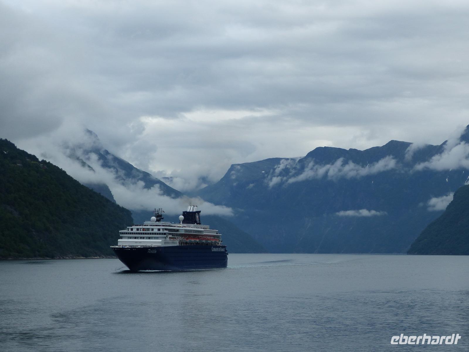 Früh am Morgen begeben wir uns in den wunderschönen Storfjord, welcher uns letztendlich zuerst in den Sunnylvsfjord und weiter in den Geirangerfjord führt, wo unsere AIDAvita direkt vor dem kleinen Örtchen Geiranger ankern wird. Einige Gäste sind schon früh auf den Beinen, einmal um diese tolle Fahrt entlang der schroffen Felsen zu bewundern oder aber auch um rechtzeitig zum Ganztagesausflug, welcher in Hellesylt beginnt, bereit zu sein. Nach einem kurzen Stopp genießen alle weiteren Gäste die Fahrt in den Geiranger Fjord, welcher seit 2005 auch als Weltnaturerbe die World Heritage List der UNESCO schmückt. Das Schiff scheint sich fast durch die steil abfallenden Felswände, welche hunderte von Metern aus dem Wasser ragen, hindurchzuzwängen. Kurz vor der gleichnamigen Stadt Geiranger passieren wir den Wasserfall Syv Söstre, auch Wasserfall der sieben Schwestern genannt, welcher einige Gäste an Deck lockt um eines der vielen unvergesslichen Fotos zu knipsen. Dann heißt es für fast alle Gäste: Bitte einsteigen- denn es geht mit Tenderbooten an Land- die AIDAvita liegt auf Reede. In Geiranger gibt es nun die Möglichkeit einen Halbtagesausflug entlang der Panorama-Passstraße Adlerkehren und zum Dalsnibba, einem Gipfel in 1500m Höhe, welcher einen einmaligen Blick auf den Fjord ermöglicht und somit Europas höchste Fjord-Aussicht von einer Straße aus darstellt, zu unternehmen. Selbstverständlich kann man aber auch an einer der aktiveren Ausflüge, wie einer Kanufahrt, teilnehmen oder einen individuellen Bummel im 260 Seelendorf Geiranger unternehmen. Ein Spaziergang zum Wasserfall und dem hiesigen Fjordmuseum sind zum Beispiel ebenso lohnenswert. Egal wie man sich entscheidet- ein wunderschöner Tag bei diesem besonders reizvollen Panorama ist garantiert!