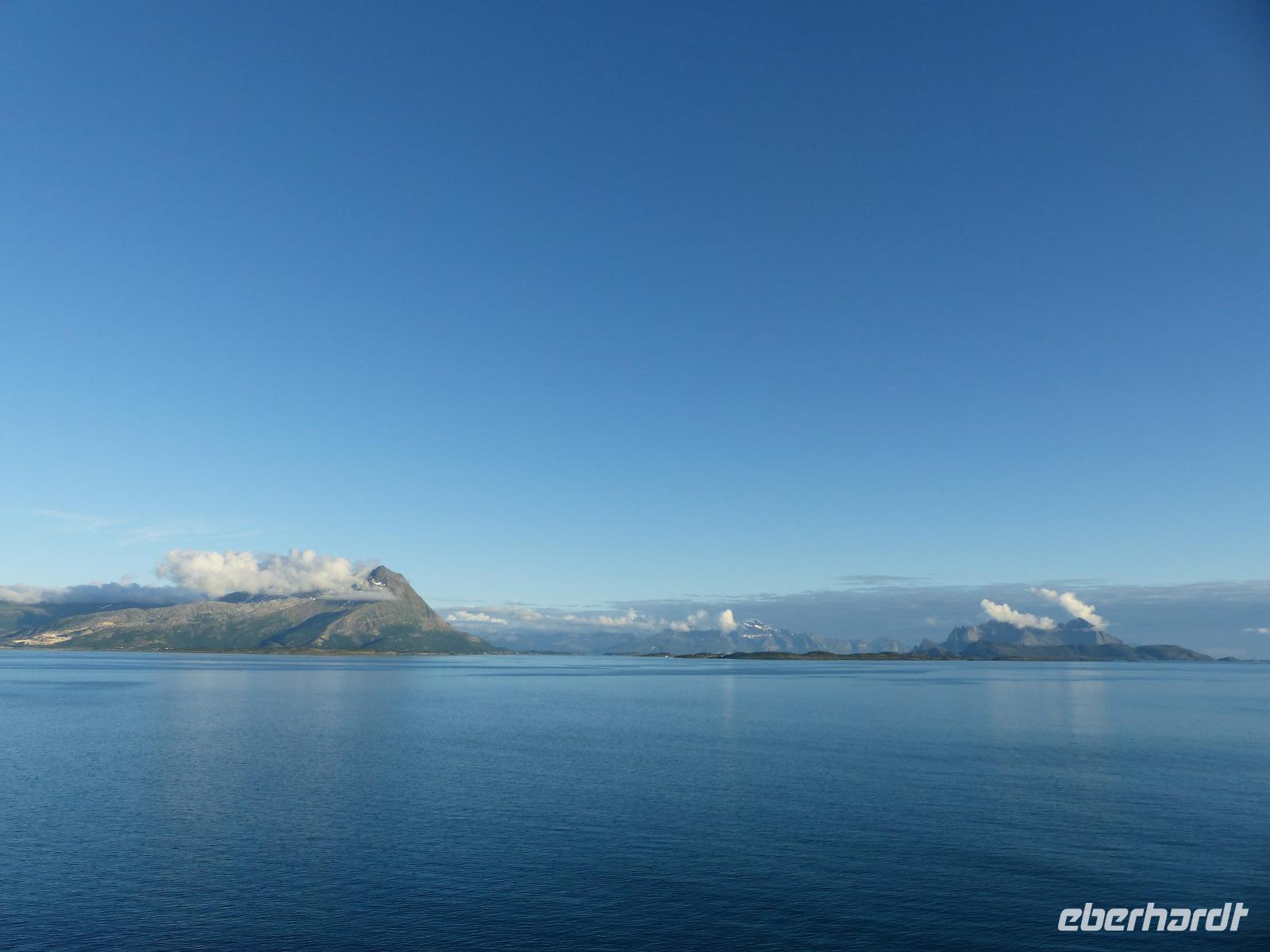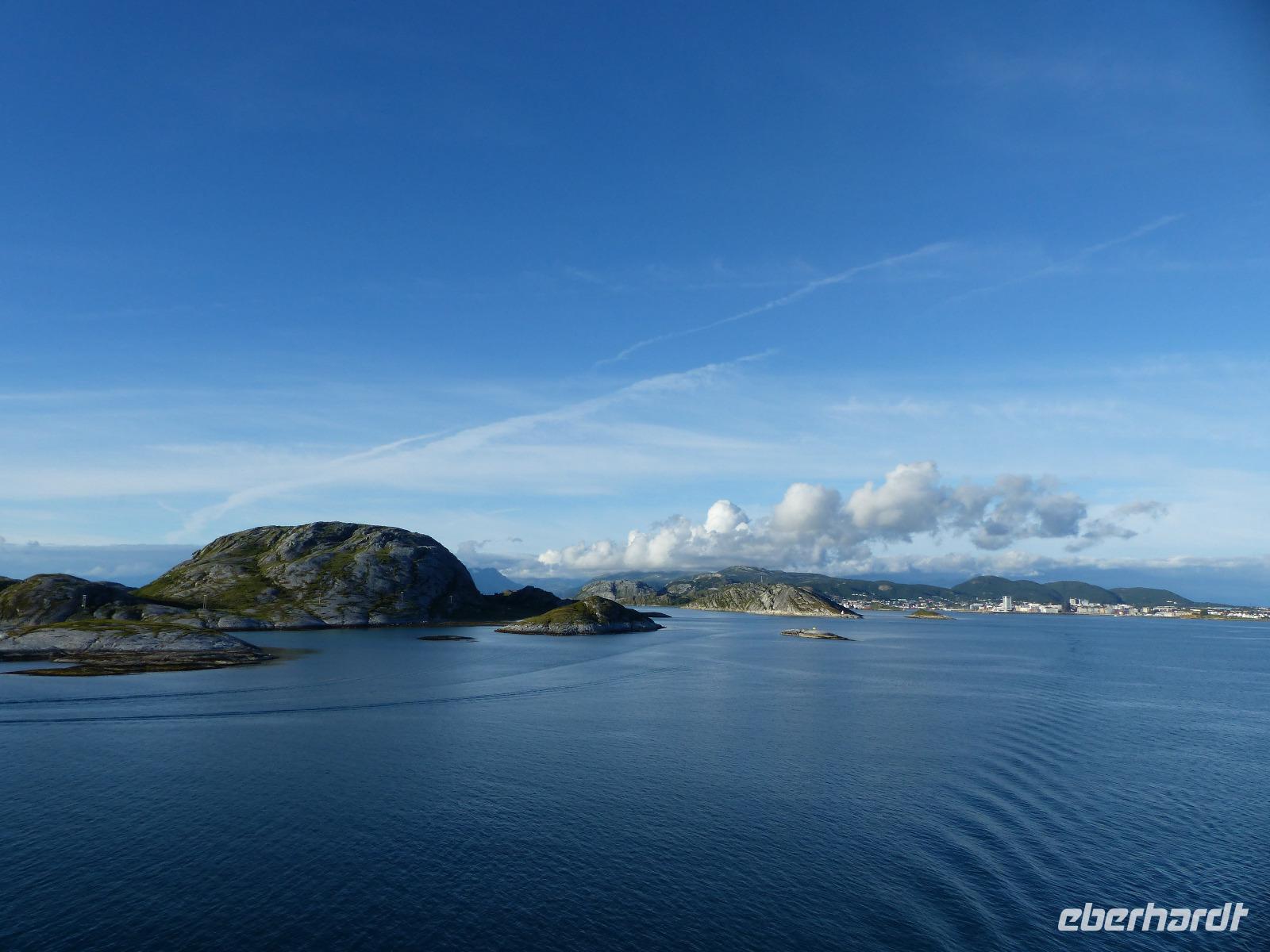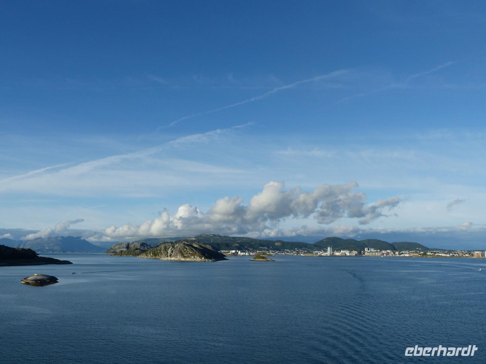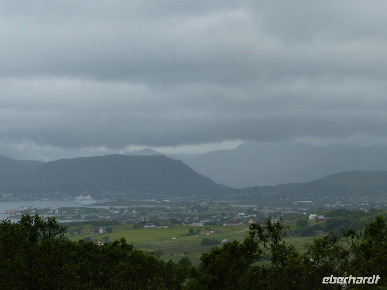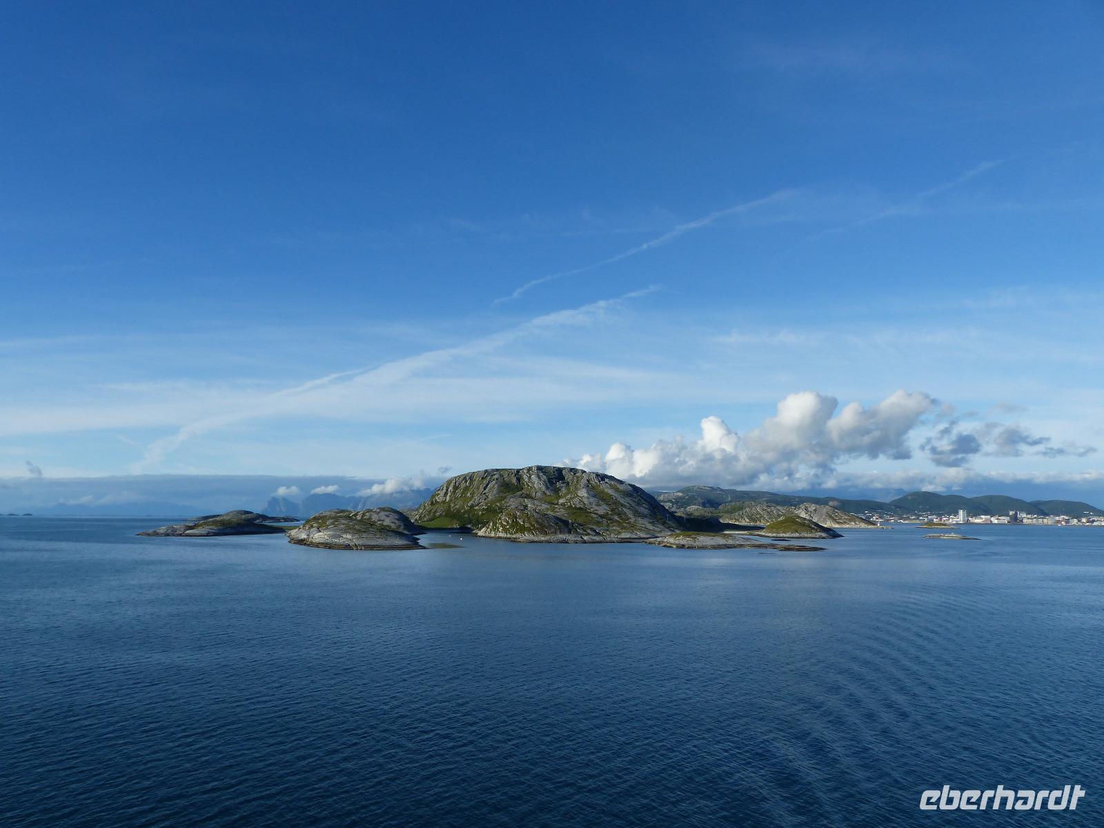 Nach einer wunderschönen Einfahrt in den Fjord und letztendlich mit dem Anlegen des Schiffes in Bodö, der Hauptstadt von Nordland, begrüßt uns der Tag bereits mit etwas Sonnenschein. Am Vormittag verlassen wir gemeinsam das Schiff, denn ein Eberhardt-Inklusivausflug steht auf dem Programm. Wir steigen in unseren Rundreisebus und werden herzlich von Juden, unserer örtlichen Reiseleiterin begrüßt und beginnen sogleich mit einer kleinen Orientierungsfahrt durch die rund 45.000 Einwohner zählende Stadt. Aufgrund des Angriffs der deutschen Wehrmacht im Jahre 1940, erwartet uns in der Innenstadt nicht allzu viel Idylle, sondern eher ein in Stein- und Betongehülltes Stadtbild. Doch auf dem Weg nach Kjerringgöy, dem ehemals reichsten Handelsplatz des hohen Nordens, zeigt sich uns eine wunderschöne Natur. Die sich immer mehr zeigende Sonne lässt die Landschaft in all Ihren Farben leuchten. Auch fahren wir bei diesem Ausflug nicht nur mit dem Bus, sondern auch eine 10 minütige Fährüberfahrt steht auf dem Programm - so schön, dass ein Gast der Gruppe die Chance für eine extra Fahrt nutzt ;). Gegen Mittag kommen wir dann am alten Handelsposten Kjerringöy an und nehmen nach einer kurzen Videopräsentation eine leckere Fischsuppe ein. Im Anschluss werden wir mit auf eine Zeitreise durch die nordnorwegische Kulturgeschichte genommen- unser kleiner Rundgang auf dem Gelände beginnt und wir lauschen aufmerksam den interessanten Erzählungen. Gegen 14 Uhr treten wir unsere Rückfahrt nach Bodö an, und begeben uns auf dem selben Weg zurück in die Stadt. Doch bevor es bei herrlichem Sonnenschein zurück aufs Schiff geht, besuchen wir den 150m hohen Ronvikfjell, einen Aussichtpunkt von dem wir nicht nur auf die Stadt, sondern auch die vorgelagerte Inselwelt bis hin zu den Lofoten erblicken können. Die hier in größerer Zahl vorkommenden Weißschwanz-Seeadler können wir allerdings nicht entdecken. Den späten Nachmittag gestaltet jeder für sich selbst- bequem bei Kaffee und Kuchen an Bord oder auch bei einem Spaziergang zum Segelhafen von Bodö.