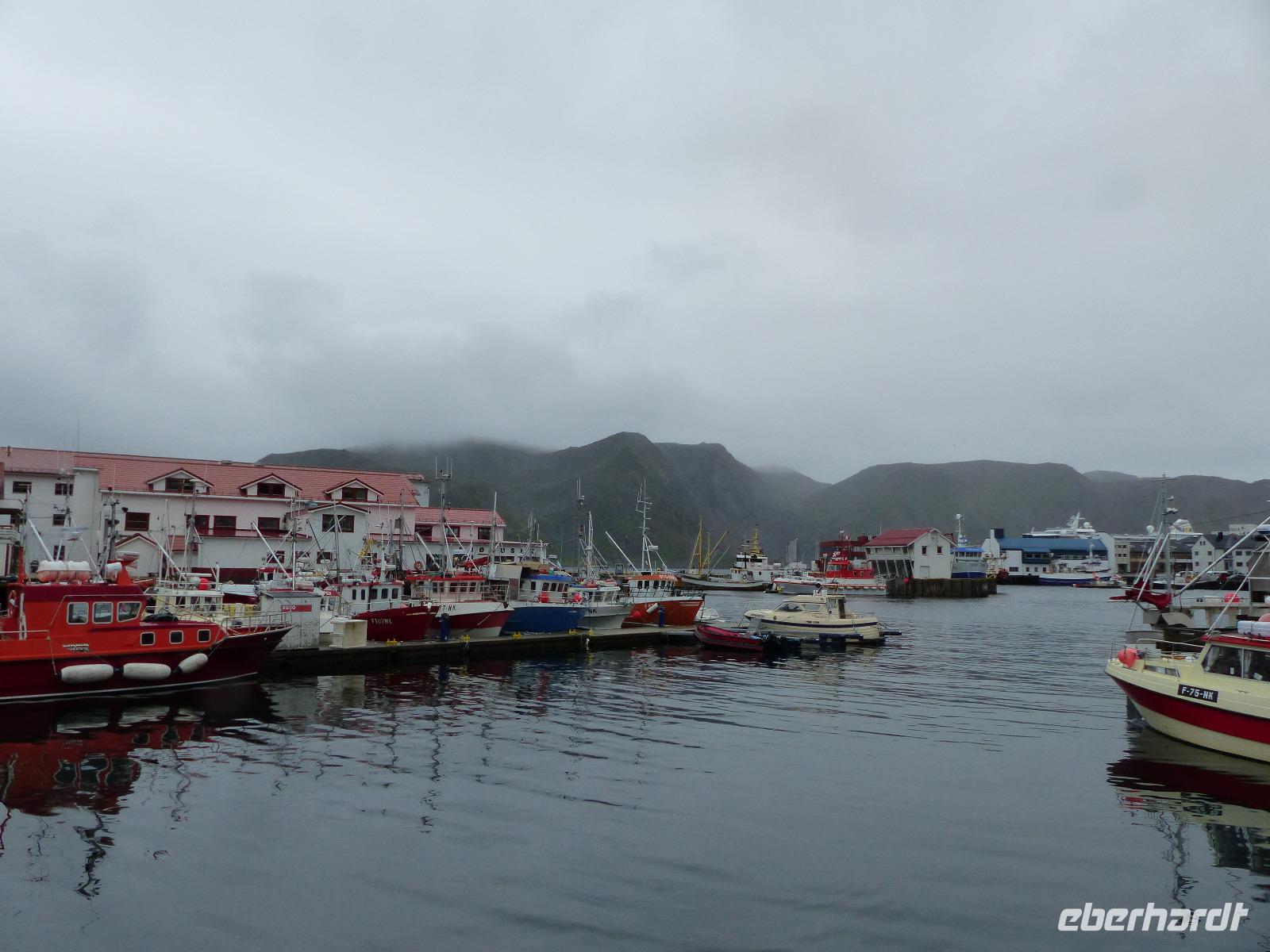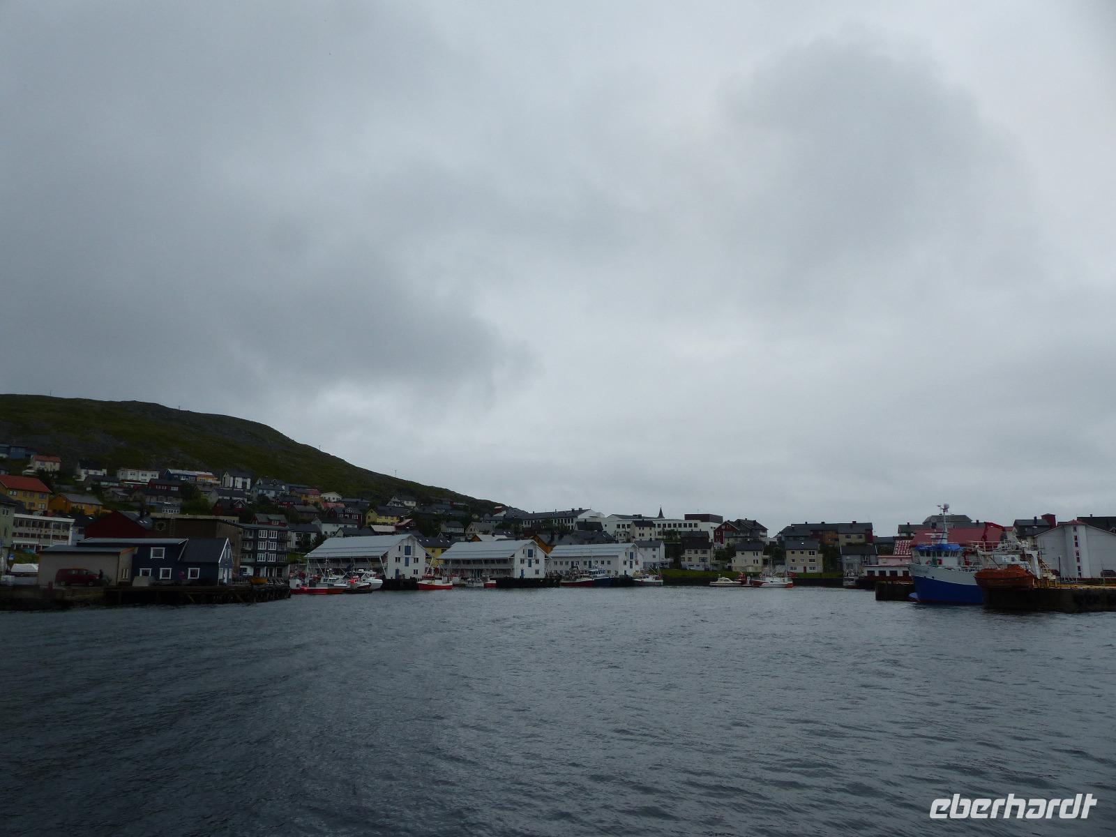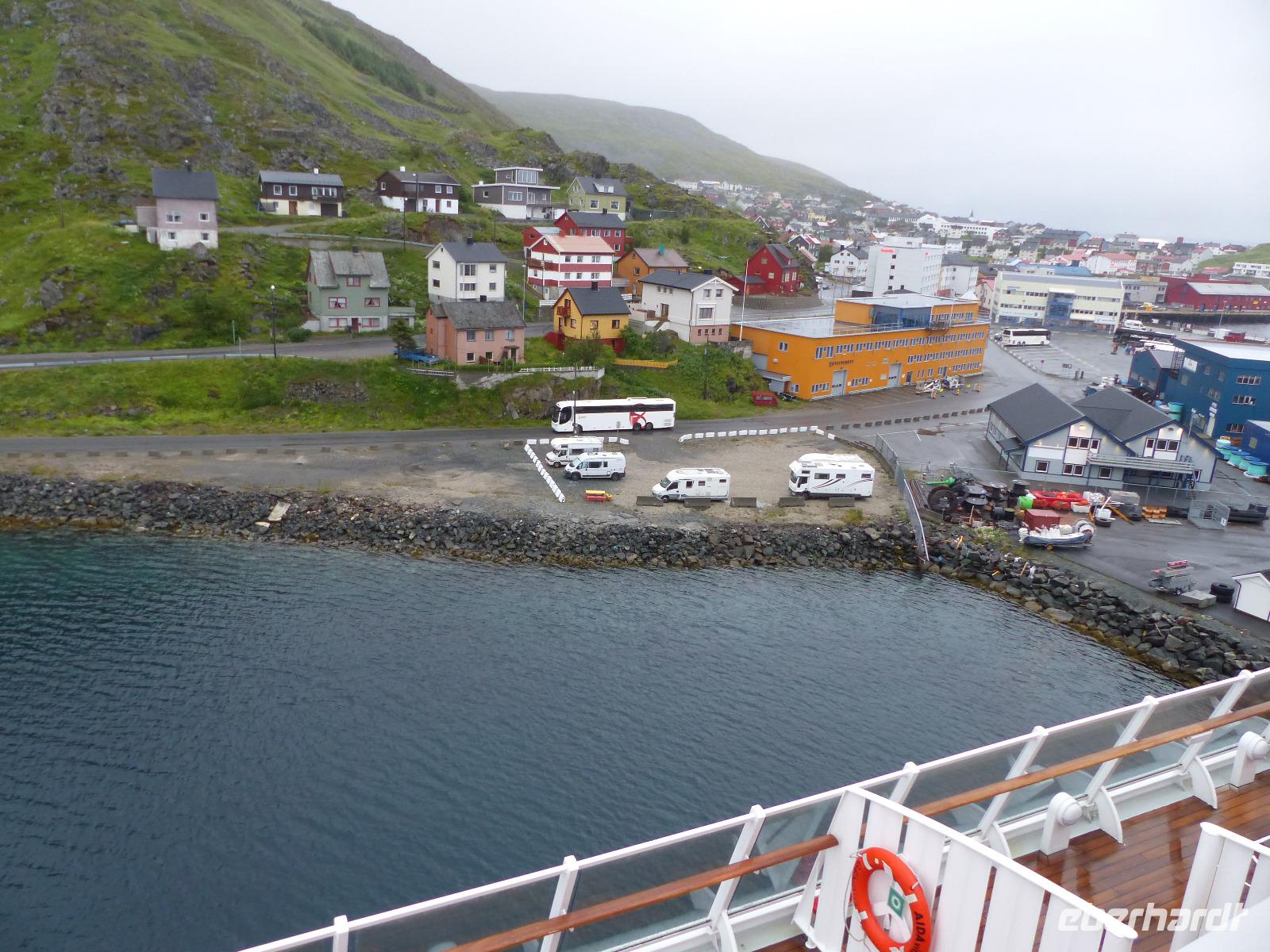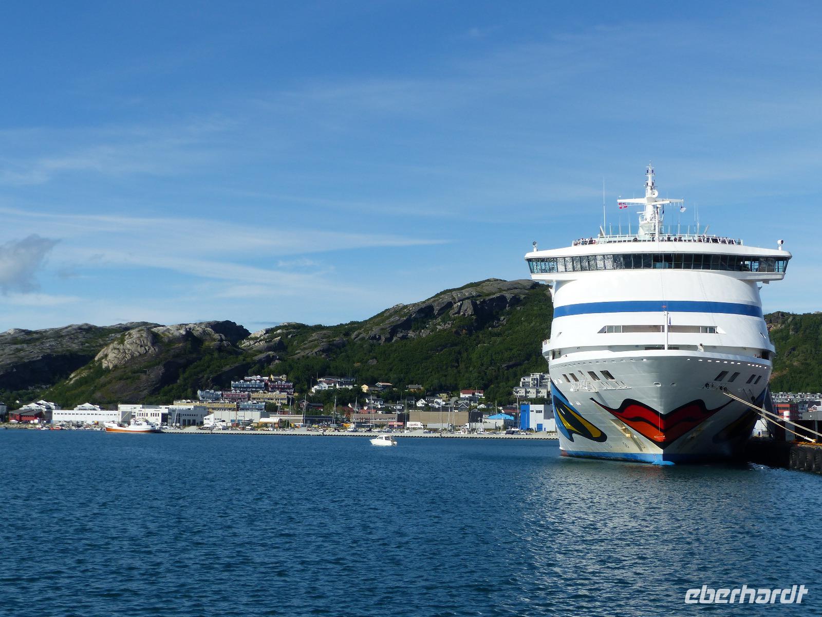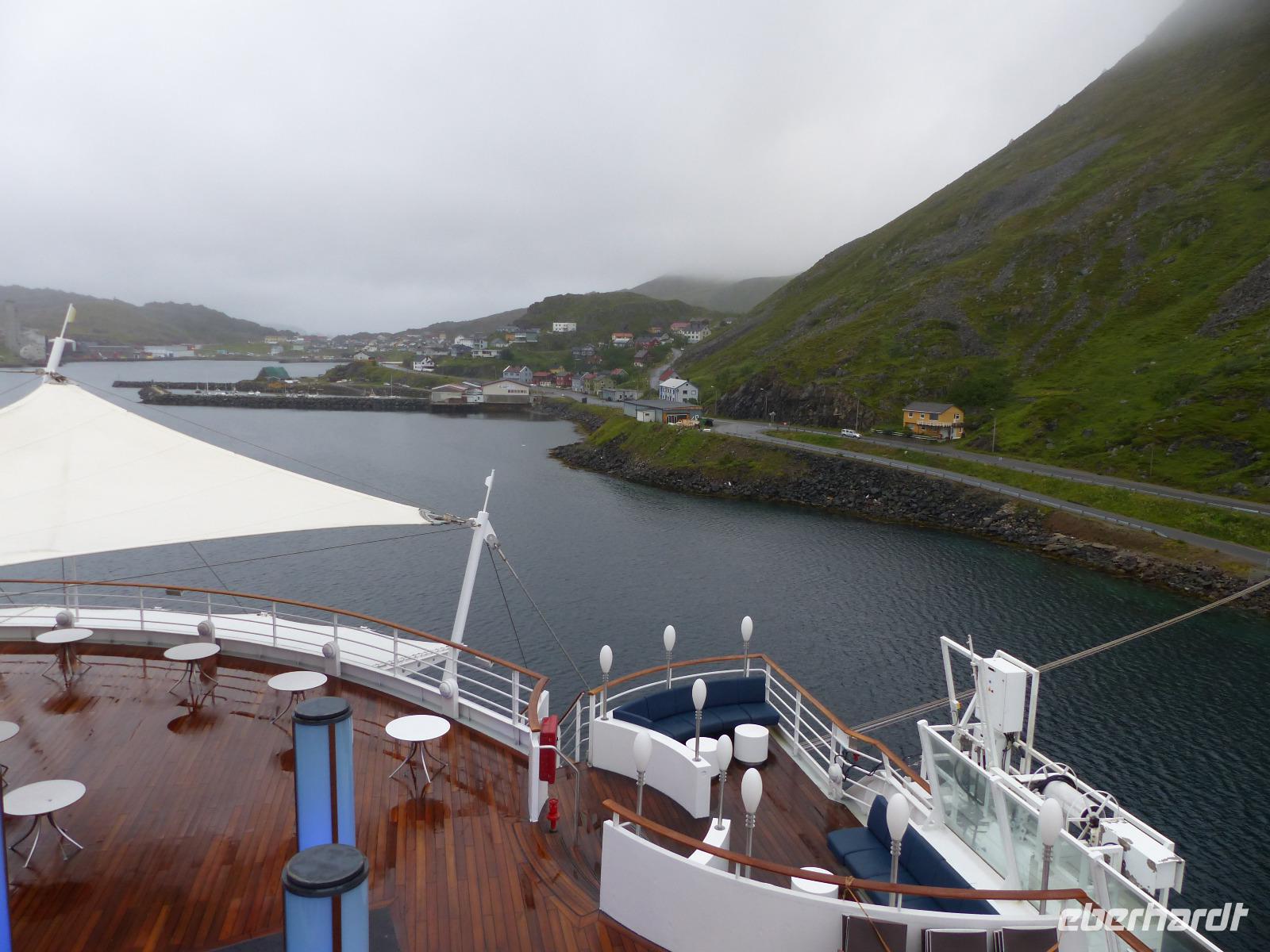 Der heutige Morgen wird von vielen Gästen zum Ausschlafen und gemütlichen Frühstück genutzt. Da die AIDA jedoch noch bis Mittag im Hafen von Honningsvag liegt, bietet es sich natürlich an, sich noch einmal auf einen Spaziergang im rund 3000 Einwohner zählendem Städtchen zu begeben. Viel gibt es allerdings nicht zu entdecken, außer natürlich einige Fischerboote, wobei zu erwähnen ist, das Honninsvag die bedeutendste Fischereisiedlung der westlichen Finnmark ist. Der anhaltende Nieselregen macht es uns jedoch nicht so schwer die Nordkap-Insel Mageroya zu verlassen. Mit jeder Menge Unterhaltung an Bord begeben wir uns nun wieder in Richtung Süden. Wobei wir nach kurzer Fahrtdauer noch einmal das Nordkap passieren und tatsächlich Glück haben die 307m senkrecht ins Meer fallende Schieferklippe zu Gesicht zu bekommen. Wer Lust hat, kann sich an diesem Nachmittag noch der Polarkreistaufe auf dem Pooldeck unterziehen oder gemütlich im Theater dem Vortrag über Wikinger lauschen.