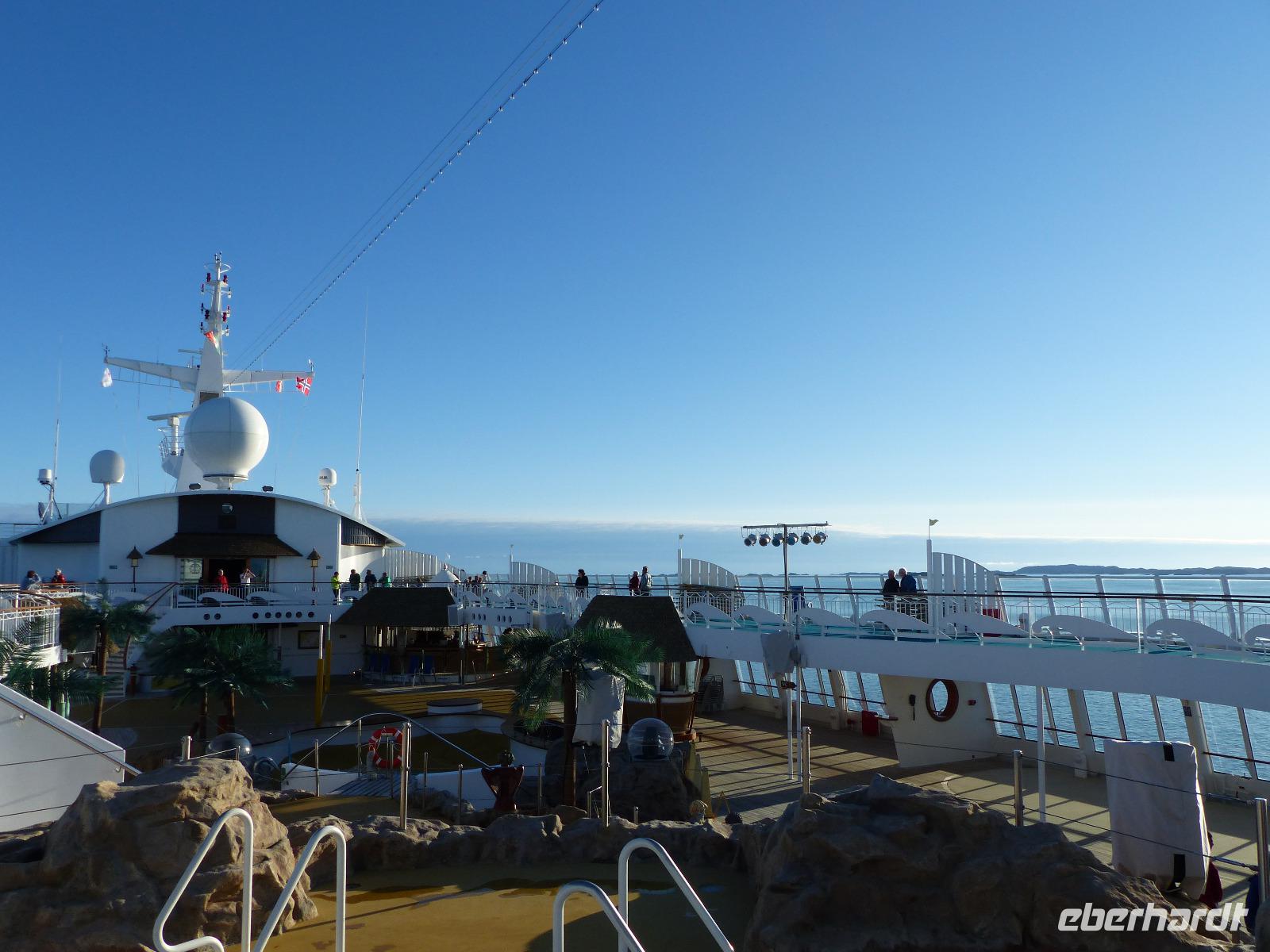 An unserem letzten Seetag genießen wir heute noch einmal alle Annehmlichkeiten an Bord. Mit einem ausgedehnten Frühstück oder auch einem Sportkurs am Morgen beginnen wir den Tag. Wer möchte, nutzt dann am Vormittag die Möglichkeit ein letztes Mal dem Vortrag des Lektors David Bobisch zu lauschen. Als Einstimmung auf unseren nächsten Hafen erwartet uns das Thema Dänemark. Informationen zur Geografie, zur Geschichte des Landes und auch ein Ausblick auf die Stadt Arhus sind dabei. Nach dem Mittag erwartet dann alle sportbegeisterten ein Abschieds-Eberhardt Travel- Shuffleboard auf Deck 10. Aber auch alle Sonnenhungrigen kommen auf Ihre Kosten - bei wunderschönem Wetter lässt es sich in kurzer Kleidung am Pooldeck aushalten. Wer sich insbesondere für die Technik an Bord und Navigation interessiert, hat heute zudem die Möglichkeit alle Informationen zum Thema „Brücke und Maschinenraum" bei der nautischen Stunde zu erhalten. Am Abend werden dann im Theater noch einmal die Lachmuskeln beansprucht- Ludger K. tritt auf.