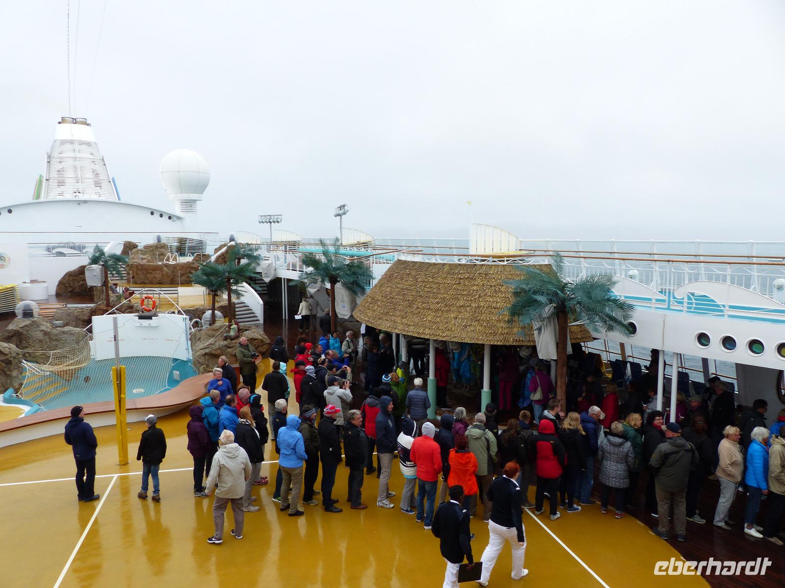 Auf dem Weg ins 707 Kilometer entfernte Bodö, steht uns heute erneut ein entspannter Tag an Bord bevor. Zahlreiche Aktivitäten werden angeboten, sodass man neben Ausflugspräsentationen und interessanten Vorträgen natürlich auch an verschiedenen aktiven Programmen teilnehmen kann. Bei etwas Wolken und Sonnenschein begeistert sich ein Teil der Gruppe am Nachmittag für das „Eberhardt Travel - Shuffleboard". Draußen auf Deck 10 heißt es den Puck in ein möglichst hohes Punktefeld zu schießen und natürlich die gegnerische Mannschaft zu übertrumpfen. Im Eifer des Gefechts kann es natürlich passieren auch den falschen Puck ins Feld der höchsten Punkte zu schießen oder wie wäre es bei der letzten Runde, mit normalerweise doppelter Punktezahl einfach gar nicht zu treffen? ;) Aber man sieht schnell- Übung macht den Meister und der Spaß war definitiv auf unserer Seite. In der Nacht passieren wir dann den Polarkreis - Mitternachtssonne wir kommen!