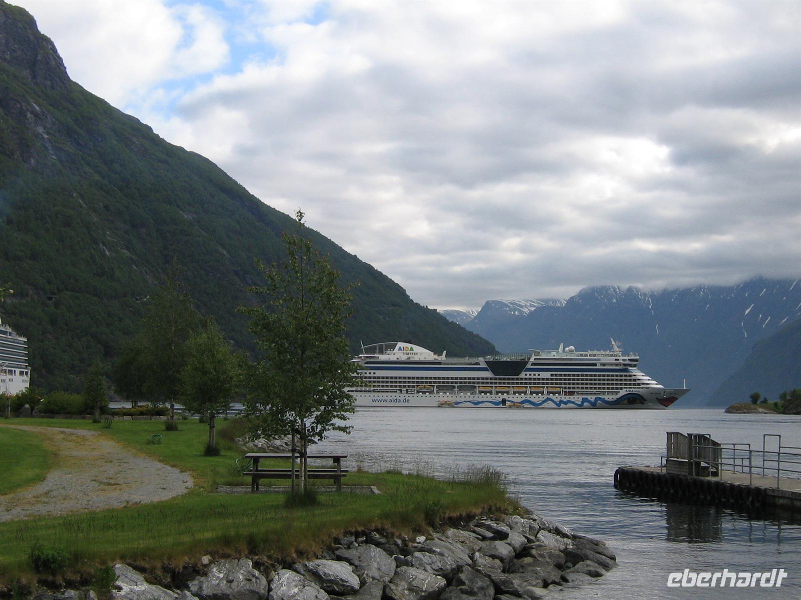 Unser nächstes Ziel ist Dalsnibba. Dieser Gipfel mit seinen 1.495 Metern ist wohl wegen seiner Aussicht weithin bekannt und berühmt. Eine private Mautstraße, Nibbevei genannt, führt von der Djupvasshytta auf den Gipfel. Im etwa 7 Kilometer entfernten Geirangerfjord liegt unsere AIDA. Sie nahm, nachdem einige morgens in Hellesylt abstiegen, die Fahrt durch den Fjord und liegt nun unter uns vor Anker.