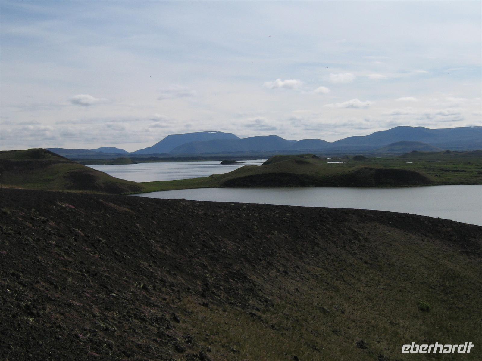 Auf unserem Weg zum Mückensee kommen wir an den berühmten Lavafeldern vorbei. Beeindruckend präsentiert sich uns die 1800 Jahre alte Landschaft der Laksalava. Insgesamt hat Island 27 aktive Vulkane. Verheerende Folgen hatte der Ausbruch des Kaplas 1984 bis 1986. Brodelnde Schlammpfuhle bei Namashard machen uns bewusst, welche Kräfte da unten in der Erde schlummern. Der Myvatn (Mückensee) trägt seinen Namen wohl zurecht. Entstanden durch Schmelzwasser, welches sich in den Mulden sammelte, als vor tausenden Jahren die Gletscher verschwanden, sind hier heute an die 50 Mückenarten zuhause. Aber mit uns waren diese kleinen Biester eher gnädig. Der Mückensee ist mit seiner Größe von 37 Quadratkilometern der viertgrößte See Islands. Wir erfuhren auch, dass hier die Kragenente ihr Brutgebiet hat. Darauf sind die Isländer sehr stolz, brüten diese doch sonst nur in den Rocky Mountains.