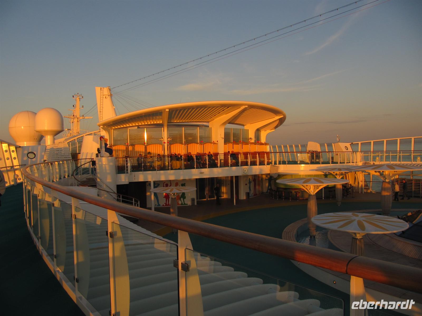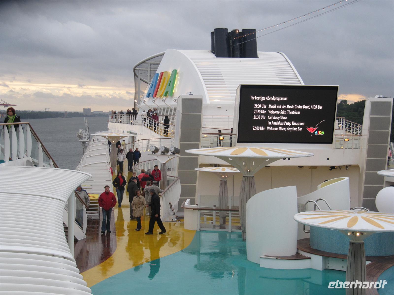 befuhren wir die Nordsee. Bereits zum Frühstück konnten wir etliche Ölplattformen sehen. In der Nordsee wird Erdöl gefördert und durch Tanker ans Festland gebracht. Am Vormittag hatten wir unsere Gäste nochmals in die AIDALounge zu einem Glas Sekt eingeladen. Wir stießen auf die schöne Reise an und schwelgten in den Erinnerungen an die vergangenen Tage. Manch einer hatte schon wieder neue Reisepläne im Kopf. Da auch heute das Wetter wieder mitspielte, genossen alle den letzten Tag auf See.