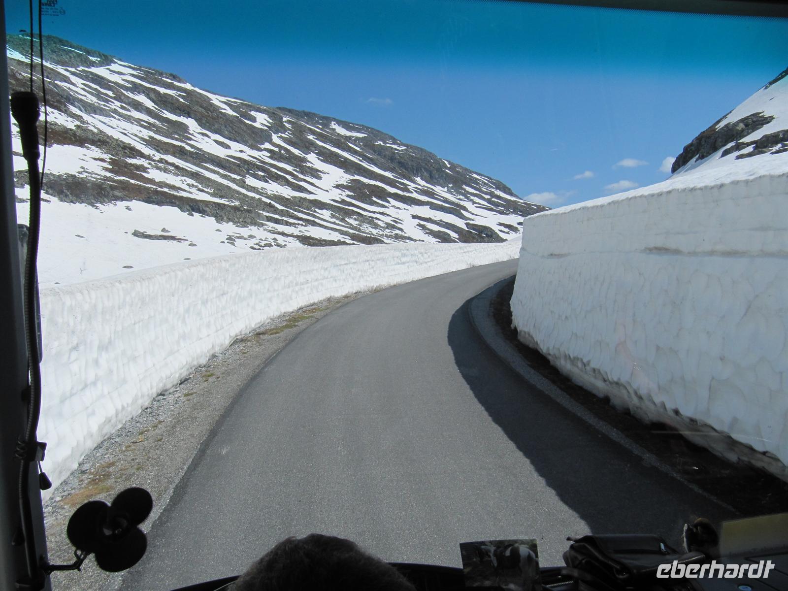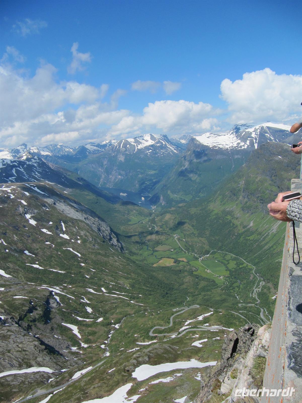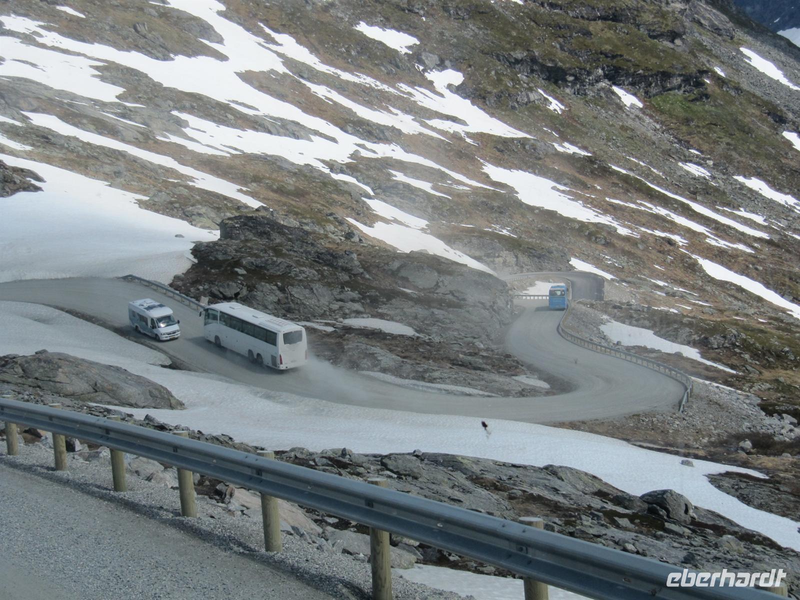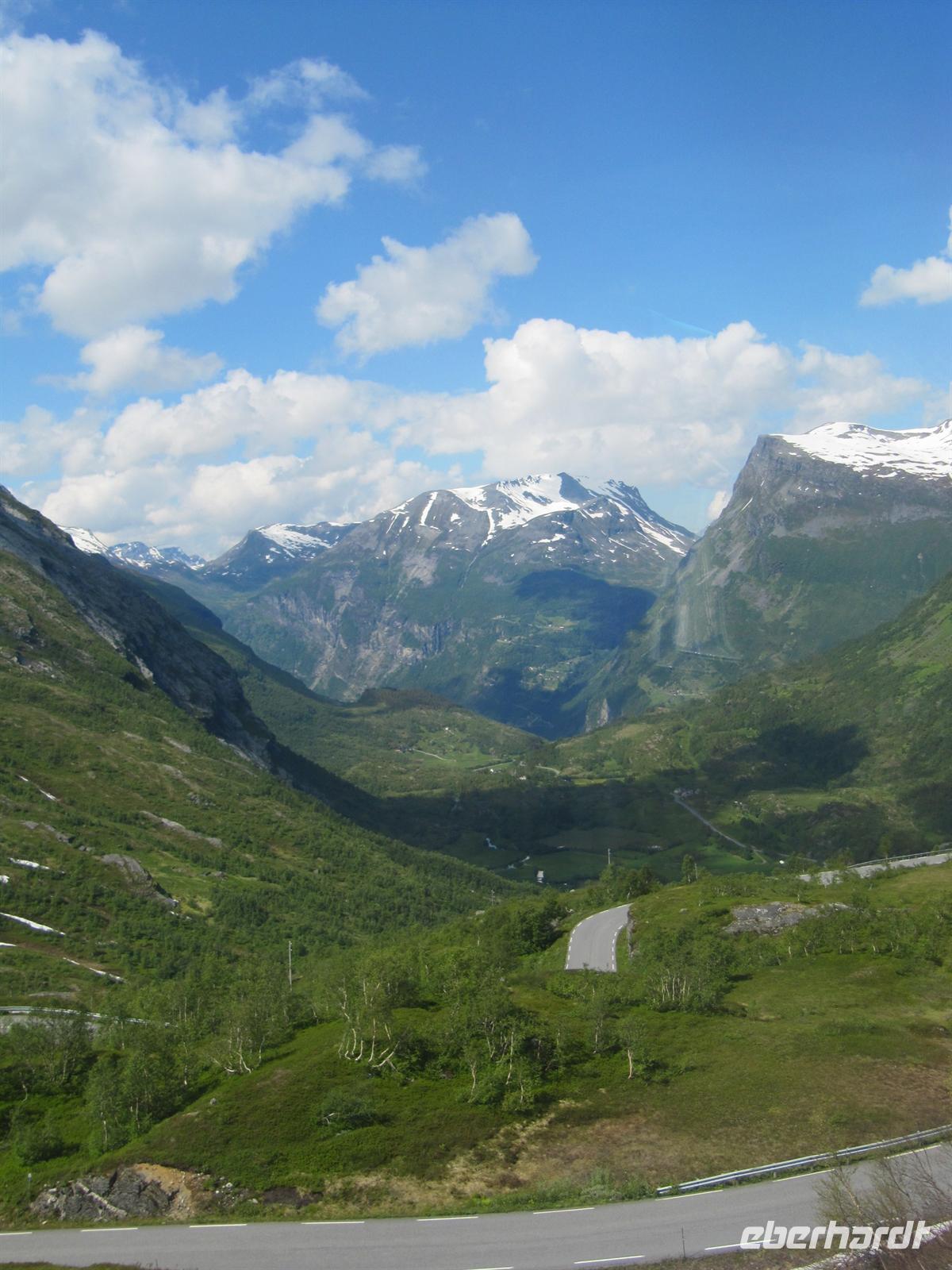 Uns begrüßte wiederum die Sonne am Morgen. Wir freuten uns auf unseren gemeinsamen Eberhardt-Ausflug. Mit den Tenderbooten der AIDA erreichten wir den kleinen Ort Hellesylt, direkt am Eingang zum Geirangerfjord. Maria, unsere Reiseleiterin, erwartete uns bereits. Nach einem kurzen Bummel durch den kleinen Ort starteten wir mit unserem Bus zunächst über den alten Postweg nach Stryn. Maria erzählte uns viele interessante Geschichten aus ihrer Heimat Norwegen. Wir bestaunten den „Hochzeitsstein", durch den der Legende nach die jungen Mädchen klettern mussten, bevor sie heiraten durften. Damit sollte geprüft werden, ob sie wirklich noch jungfräulich waren. Einige unsrer Gäste probierten es aus... Durch herrliche Landschaft brachte uns der Bus nach Stryn. Wir bummelten durch den kleinen Ort. Er bestach durch seine hübschen Häuser. Über die alte sepentienenreiche Straße erreichten wir durch eine imposante Landschaft das Sommer-Skizentrum des Tystigbreen. Wir legten eine kurze Mittagspause ein. In diesem Jahr lagt noch ungewöhnlich viel Schnee. So konnten wir einigen Skifahrern zuschauen. Durch die imposante Hochgebirgslandschaft, die hier aber nur bis ca. 1.100 Meter reicht und dennoch ein ähnliches Gesicht, wie die Alpen in 2.000 - 3.000 Metern Höhe aufweist, ging es weiter. Wir sahen hübsche Hüttensiedlungen, denn jeder Norweger möchte eine Hütte in mitten der Natur haben. Früher dienten die Hütten den Bauern auf den Almen als Unterkünfte und inzwischen sind sie zu Urlaubsdomizilen ausgebaut worden. Nun stand ein Höhepunkt unserer Reise auf dem Programm. Über eine kurvenreiche Schotterstraße erreichten
