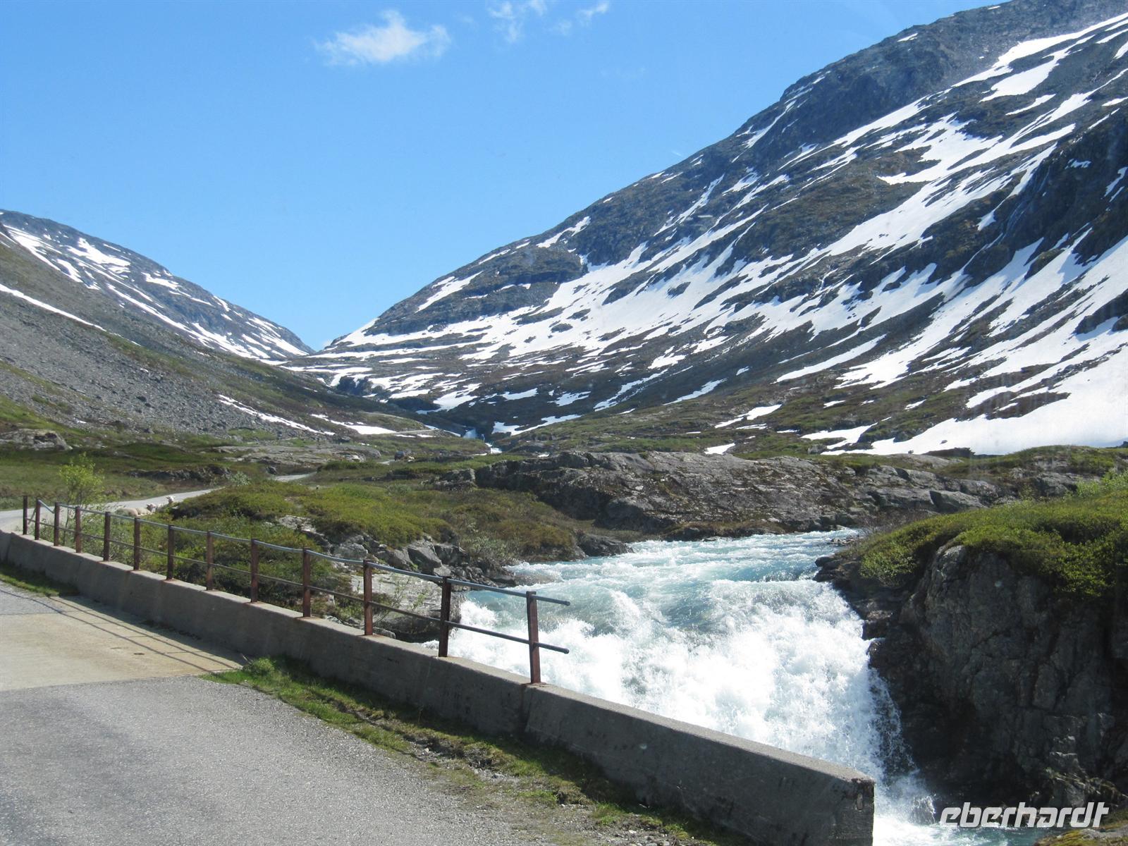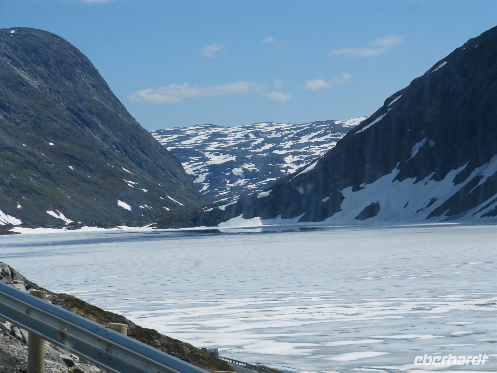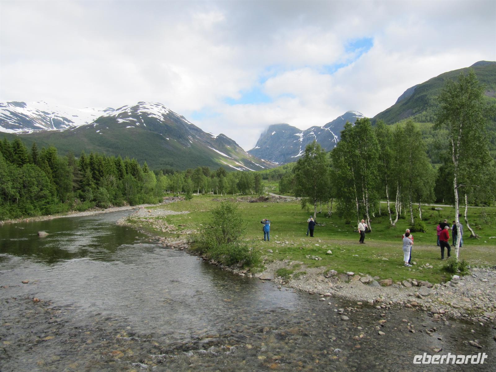 Uns begrüßte wiederum die Sonne am Morgen. Wir freuten uns auf unseren gemeinsamen Eberhardt-Ausflug. Mit den Tenderbooten der AIDA erreichten wir den kleinen Ort Hellesylt, direkt am Eingang zum Geirangerfjord. Maria, unsere Reiseleiterin, erwartete uns bereits. Nach einem kurzen Bummel durch den kleinen Ort starteten wir mit unserem Bus zunächst über den alten Postweg nach Stryn. Maria erzählte uns viele interessante Geschichten aus ihrer Heimat Norwegen. Wir bestaunten den „Hochzeitsstein", durch den der Legende nach die jungen Mädchen klettern mussten, bevor sie heiraten durften. Damit sollte geprüft werden, ob sie wirklich noch jungfräulich waren. Einige unsrer Gäste probierten es aus... Durch herrliche Landschaft brachte uns der Bus nach Stryn. Wir bummelten durch den kleinen Ort. Er bestach durch seine hübschen Häuser. Über die alte sepentienenreiche Straße erreichten wir durch eine imposante Landschaft das Sommer-Skizentrum des Tystigbreen. Wir legten eine kurze Mittagspause ein. In diesem Jahr lagt noch ungewöhnlich viel Schnee. So konnten wir einigen Skifahrern zuschauen. Durch die imposante Hochgebirgslandschaft, die hier aber nur bis ca. 1.100 Meter reicht und dennoch ein ähnliches Gesicht, wie die Alpen in 2.000 - 3.000 Metern Höhe aufweist, ging es weiter. Wir sahen hübsche Hüttensiedlungen, denn jeder Norweger möchte eine Hütte in mitten der Natur haben. Früher dienten die Hütten den Bauern auf den Almen als Unterkünfte und inzwischen sind sie zu Urlaubsdomizilen ausgebaut worden. Nun stand ein Höhepunkt unserer Reise auf dem Programm. Über eine kurvenreiche Schotterstraße erreichten