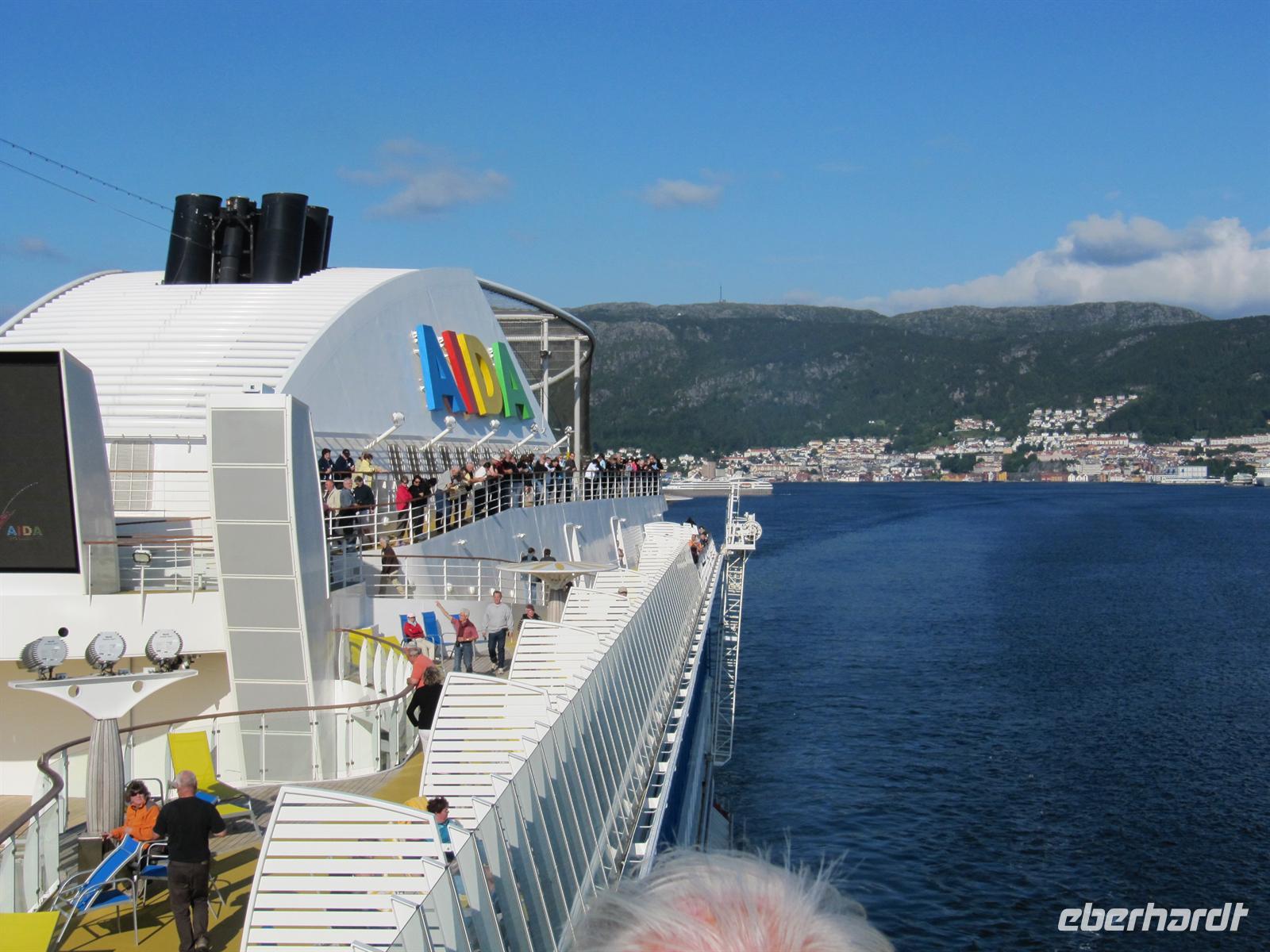 Von den Sonnenstrahlen wurden wir geweckt. Nach dem ausgiebigen Frühstück stand die Seenotrettungsübung für alle Passagiere auf dem Programm. Mit unseren knallorangen Rettungswesten fanden wir uns alle auf Deck 5 ein. Nach der Anwesenheitskontrolle durch die Crew erhielten wir wichtige Sicherheitshinweise für den Aufenthalt an Bord und für das Verhalten im Notfall. Anchließend lernten wir das Schiff während eines eigens für unsere Eberhardt-Gäste organisierten Schiffsrundganges kennen. Von der AIDAbar ging es in den Sportbereich, weiter über das Pooldeck in die Anytimebar. Vorbei an den drei Buffetrestaurants führte uns die Tour durch das Theatrium, wo jede Menge Veranstaltungen stattfinden und durch das Casino wieder in die AIDAbar. Anschließend luden wir unsere Gäste zu einem Willkommenssekt in die AIDALounge ein. Gemeinsam stießen wir auf eine schöne Reise an. Susanne gab einige Informationen zu Norwegen und den bevorstehenden Ausflügen. Den Nachmittag und Abend verbrachte jeder nach seinen Interessen.
