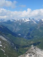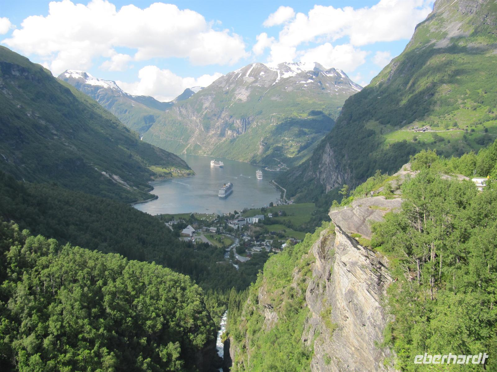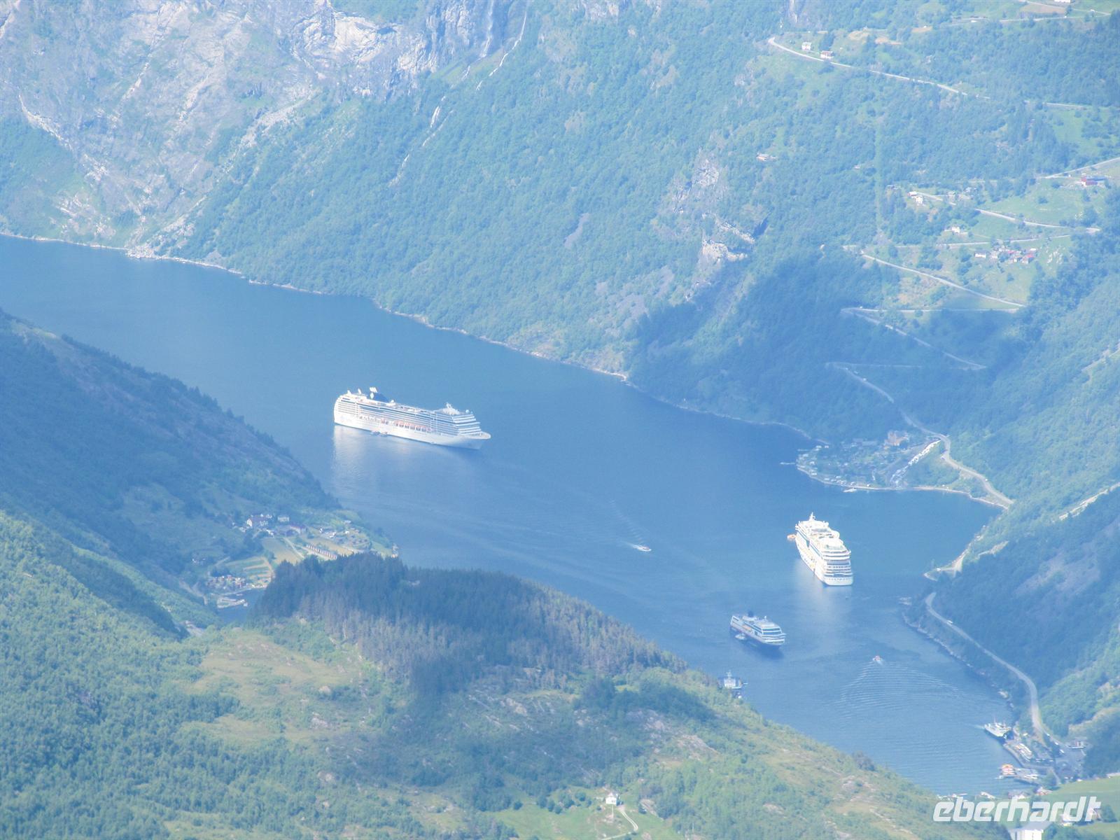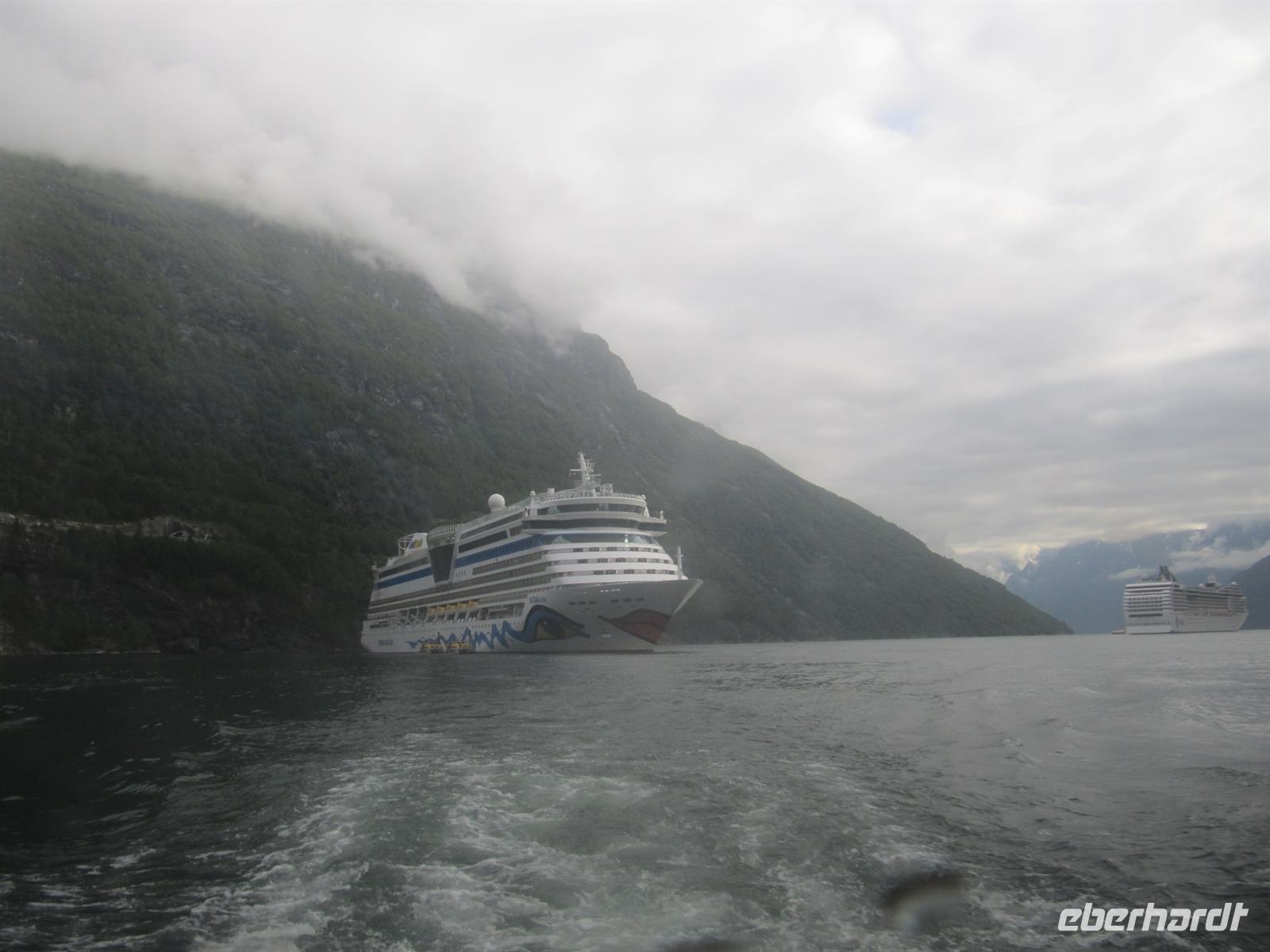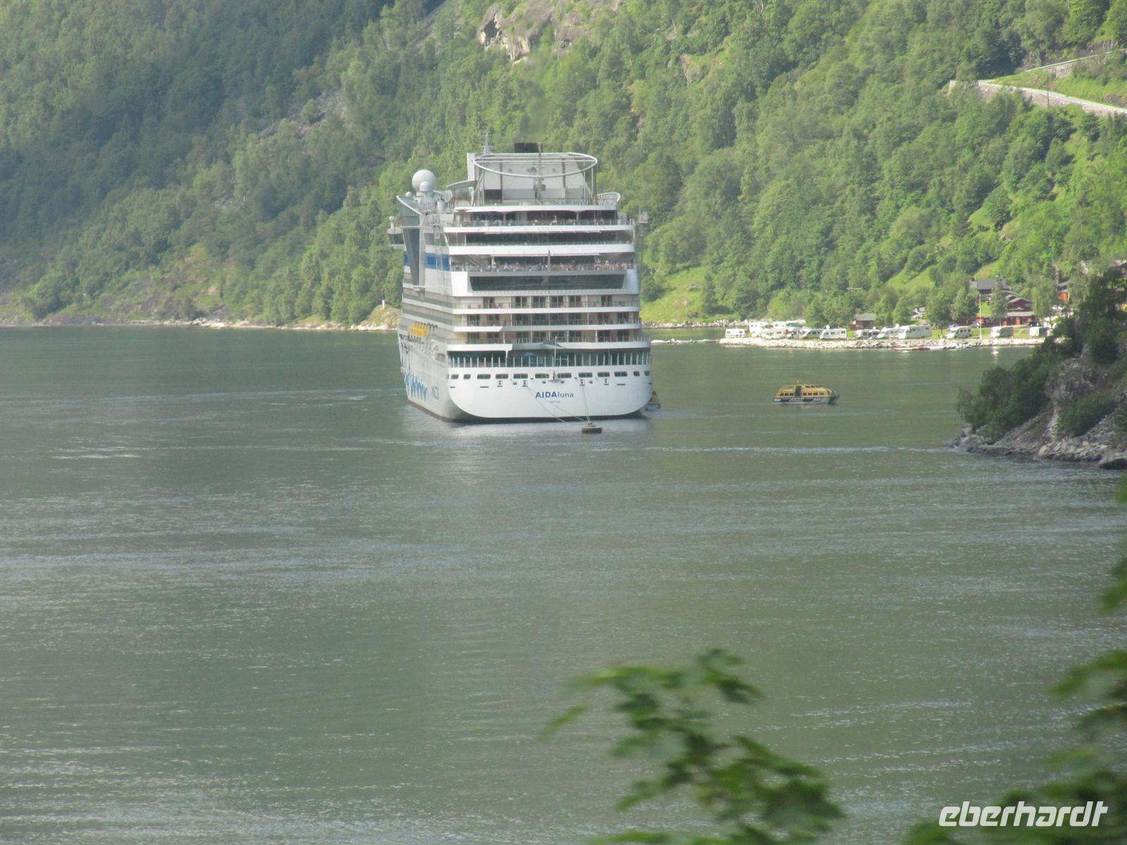 wir den 1.495 Meter hohen Danslibba. Dieser Berg ist wegen seiner grandiosen Aussicht so berühmt. Bei strahlendem Sonnenschein blicken wir tief hinab in den Geirangerfjord, wo inzwischen unsere AIDA geankert hatte. Die Aussicht in die Bergwelt und über den Fjord ist atemberaubend. Wir konnten uns gar nicht satt sehen. Hinunter lenkte André unser Chauffeur wieder sicher über kurvenreiche Strecke nach Geiranger. Zu unseren Füßen lag der Djupvatnetsee, der Tiefsee. In Geiranger besuchten wir am Nachmittag das Norwegische Fjordzentrum. Ein Film mit beeindruckenden Naturbildern ließ uns die Eindrücke des Tages nochmals Revue passieren. Im Museum konnten wir hautnah erleben, wie die Norweger gelebt haben und wie sie mit den recht harten Bedingungen fertig wurden. Mit den Tenderbooten erreichten wir wieder unser Schiff. Am Abend genossen wir die beeindruckende Fahrt durch den Fjord. Der Geirangerfjord ist einer der imposantesten Fjorde Norwegens mit nur maximal 1,5 Kilometern Breite und steil aufragenden Felswänden. Wir sahen die „Sieben Schwestern" und den „Freier", die wohl beeindruckendsten Wasserfälle im Fjord. Am späten Abend erreichten wir wieder das offene Meer.