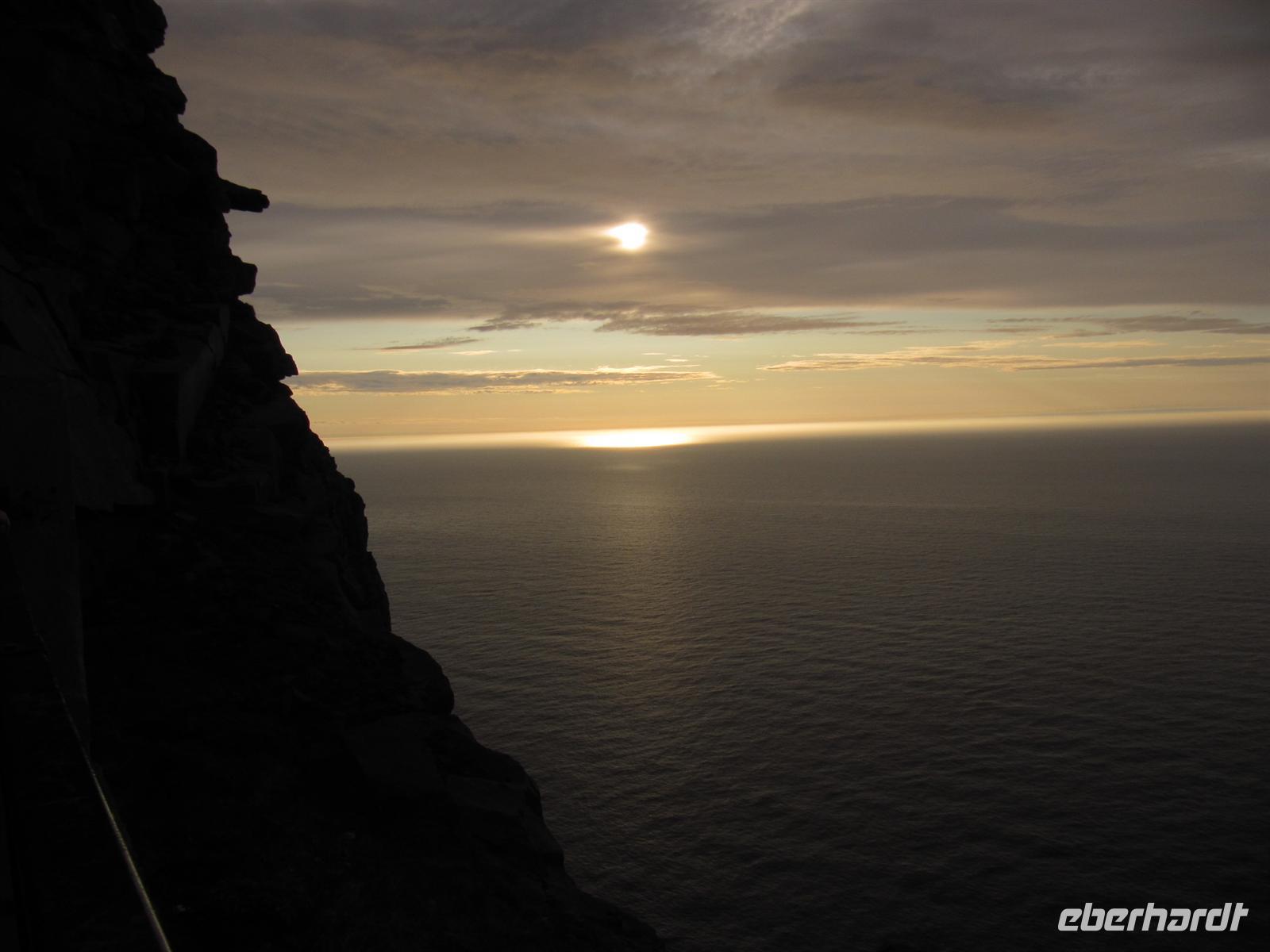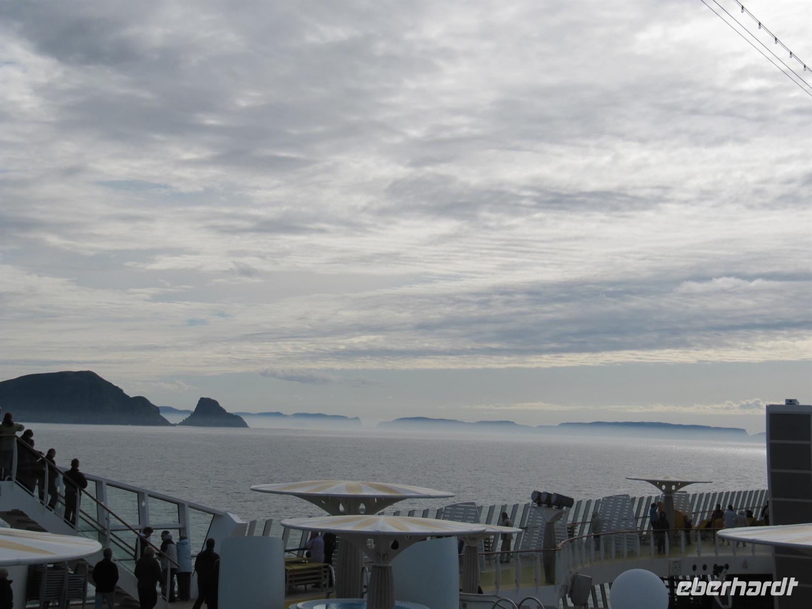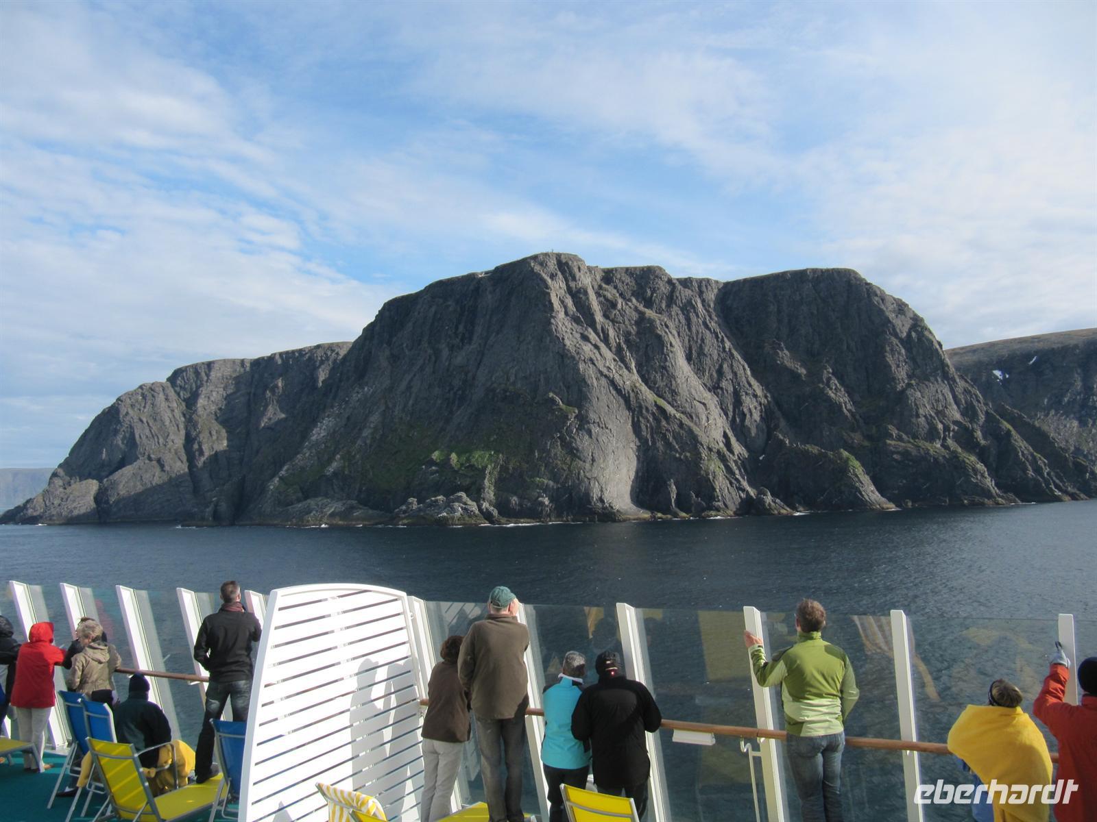 Am Morgen begrüßte uns wieder die Sonne und entsprechend gut war auch die Stimmung unter den Gästen. Wir verbrachten den Tag mit unterschiedlichsten Aktivitäten an Bord. Am Nachmittag begann der Höhepunkt des Tages: Die Nordkap-Passage. Bei strahlendem Sonnenschein und klarer Sicht standen wir dick eingemummelt auf dem Außendeck. Schließlich zeigte das Thermometer nur