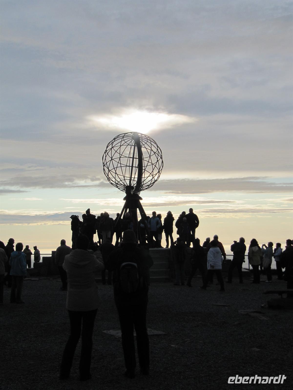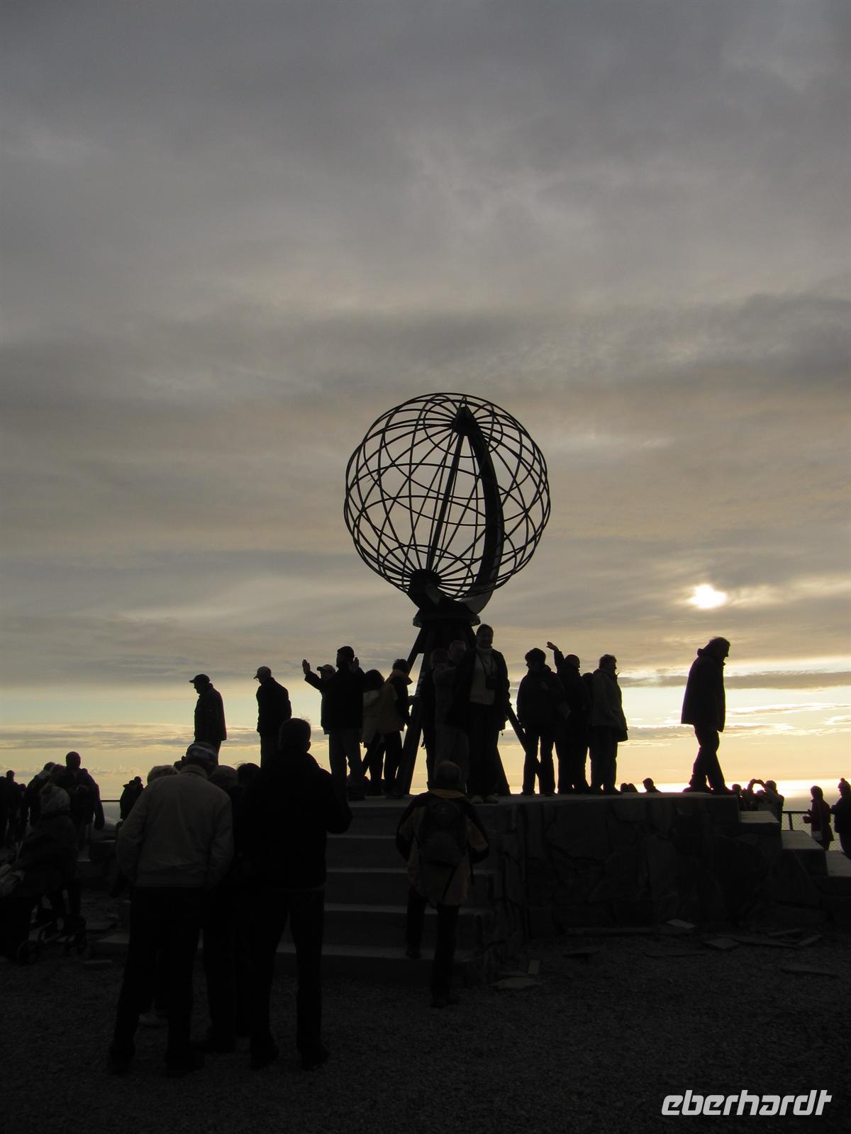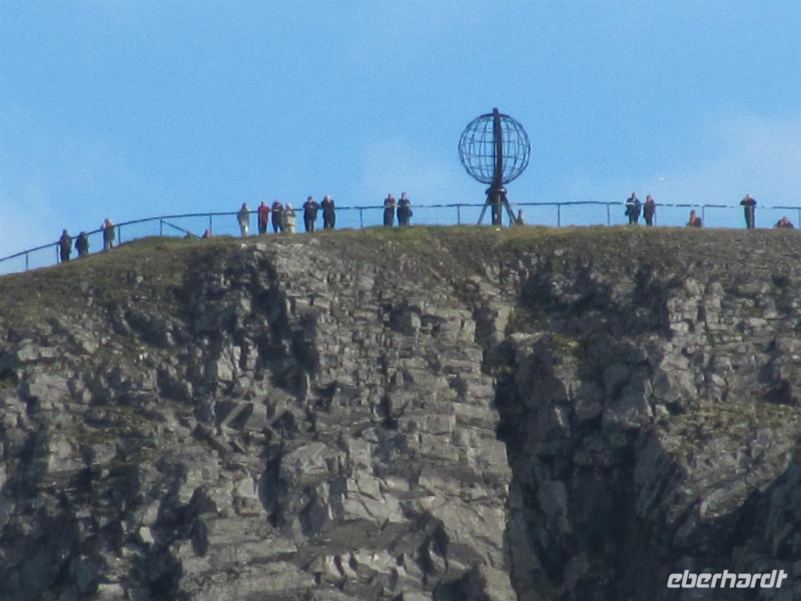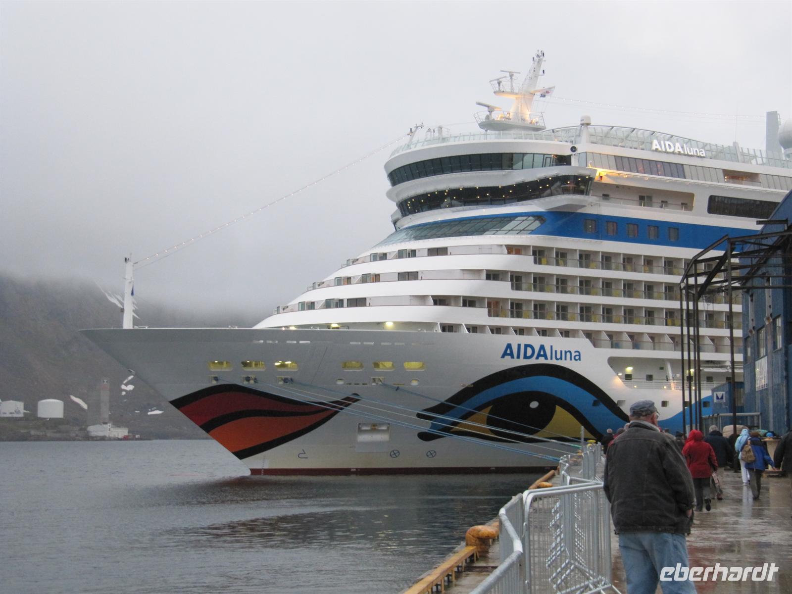 ca. 12°C an. Aber keiner wollte sich diese Ausblicke entgehen lassen. Unser Kapitän steuerte die AIDAluna ganz dicht am Nordkap-Felsen vorbei und wir konnten ganz deutlich die Aussichtsplattform mit der berühmten Weltkugel und die Nordkaphallen erkennen. Die Vorfreude auf unseren Besuch am Nordkap stieg. Am Abend legten wir in Honingsvag an. Wir durften als erste das Schiff verlassen und fuhren mit einem der ersten Busse zum Nordkap. Unsere Eberhardt-Gruppe bekam einen eigenen Bus zugeteilt. So konnte Susanne noch einige interessante Ausführungen zum Nordkap, zu den Rentieren und zum Leben der Samen im hohen Norden machen. Auf der Fahrt zum Nordkap durch die raue, aber dennoch beeindruckende Landschaft begegneten uns die Rentiere. Sie leben im Sommer hier und ernähren sich von den Flechten und Moosen. Am Nordkap begrüßte die Mitternachtssonne. Natürlich wollten alle ein Foto mit der berühmten Weltkugel. Wir ließen unsere Blicke über das weite Meer schweifen, ein erhabener Augenblick. In den Nordkaphallen erlebten wir einen Film über das Nordkap im Lauf der Jahreszeiten, schauten nach Mitbringseln oder holten uns den heiß begehrten Nordkap-Sonderstempel. Als wir wieder aus den Nordkaphallen heraustraten, sahen wir plötzlich nichts mehr. Nebel und Regen waren aufgezogen, das eigentlich so typische Nordkap-Wetter. Glücklich kehrten wir mit schönen Eindrücken zum Schiff zurück.