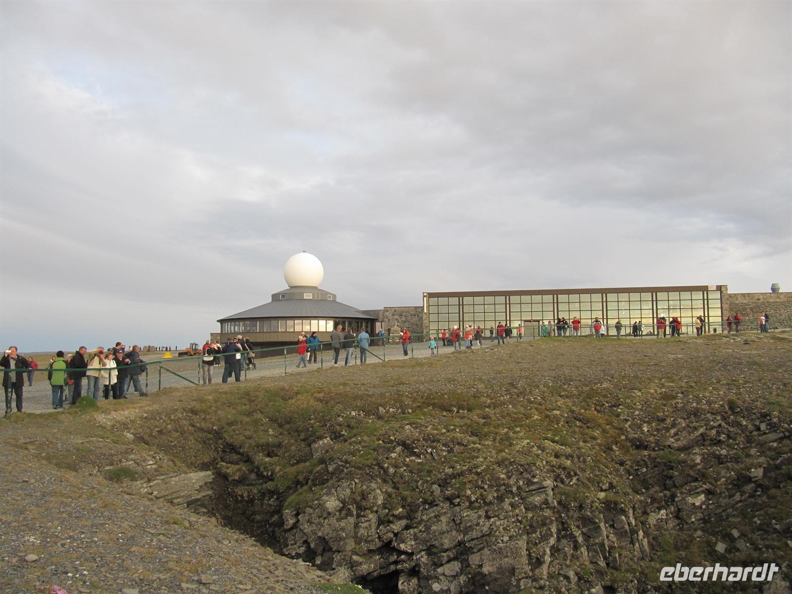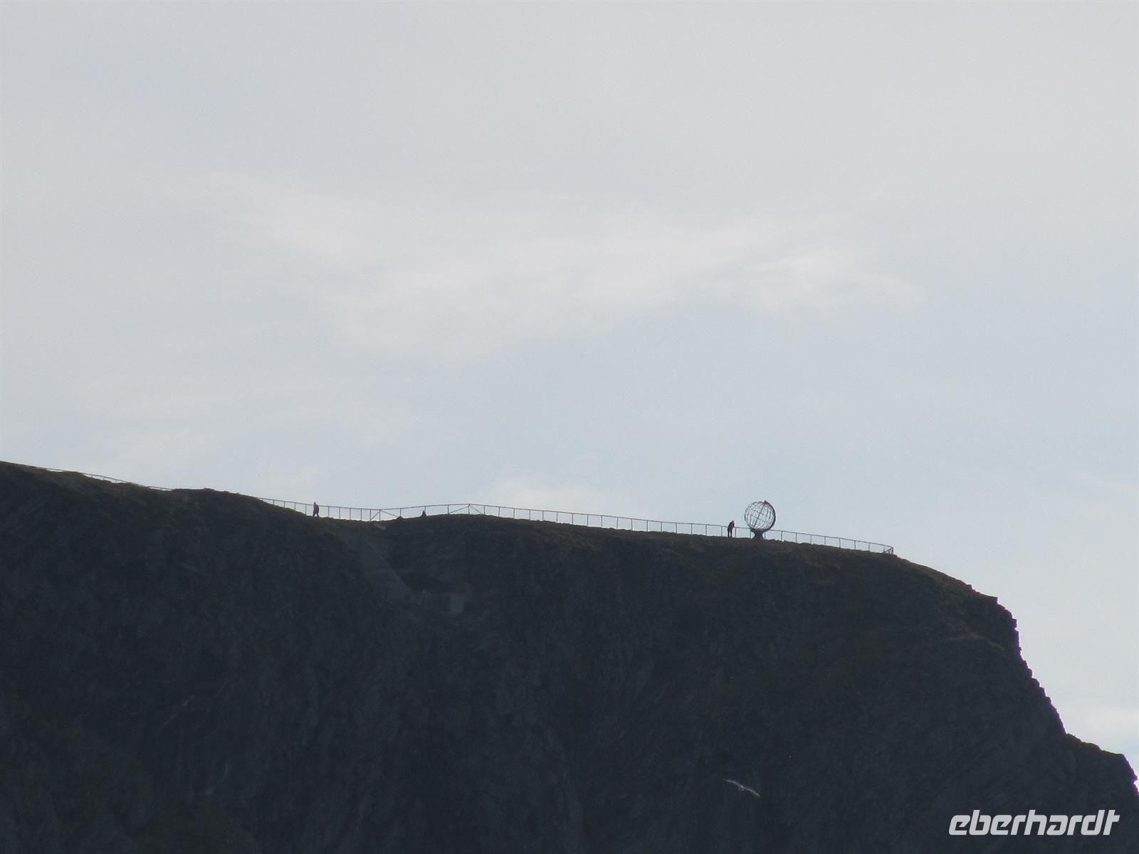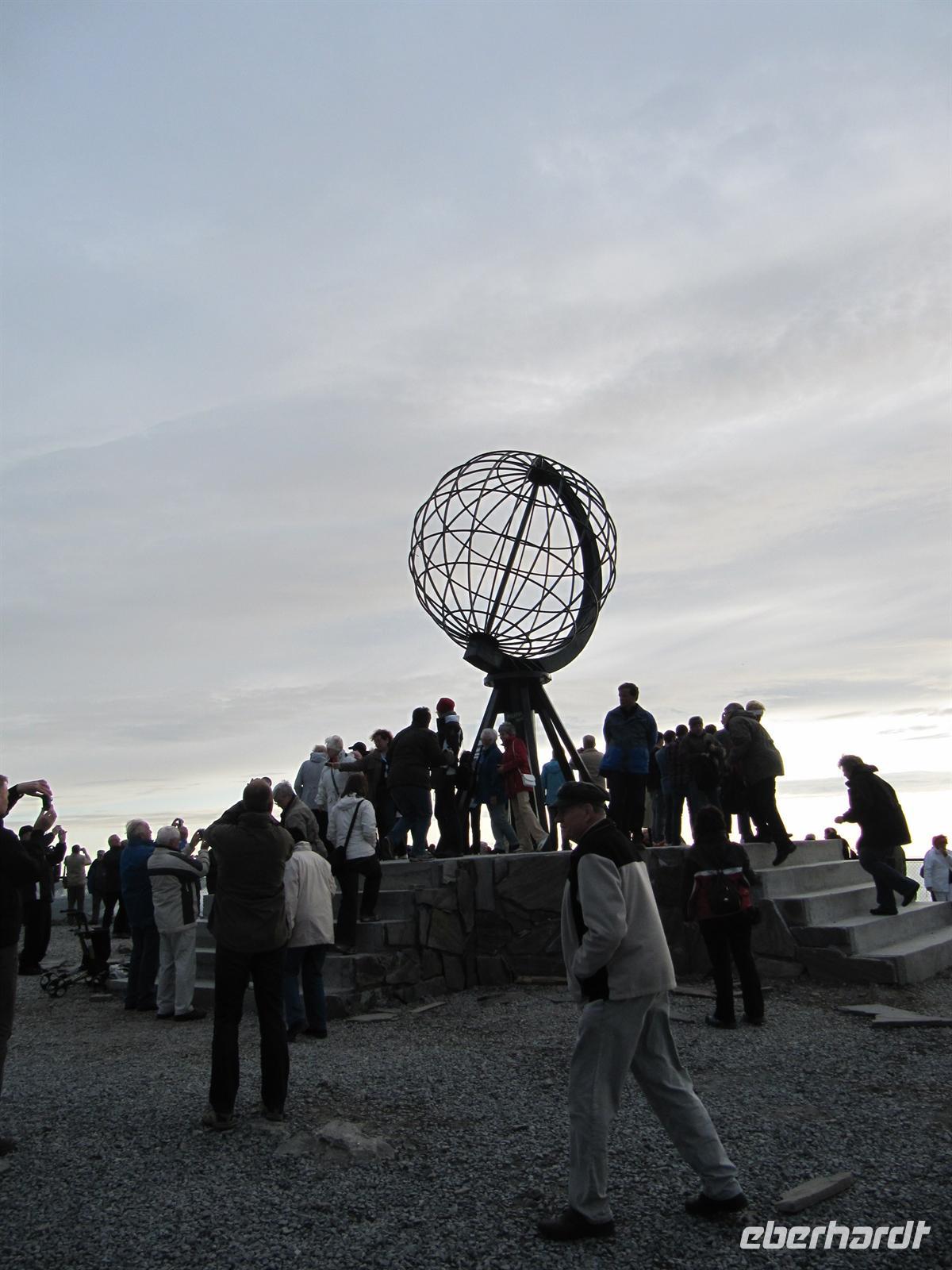 ca. 12°C an. Aber keiner wollte sich diese Ausblicke entgehen lassen. Unser Kapitän steuerte die AIDAluna ganz dicht am Nordkap-Felsen vorbei und wir konnten ganz deutlich die Aussichtsplattform mit der berühmten Weltkugel und die Nordkaphallen erkennen. Die Vorfreude auf unseren Besuch am Nordkap stieg. Am Abend legten wir in Honingsvag an. Wir durften als erste das Schiff verlassen und fuhren mit einem der ersten Busse zum Nordkap. Unsere Eberhardt-Gruppe bekam einen eigenen Bus zugeteilt. So konnte Susanne noch einige interessante Ausführungen zum Nordkap, zu den Rentieren und zum Leben der Samen im hohen Norden machen. Auf der Fahrt zum Nordkap durch die raue, aber dennoch beeindruckende Landschaft begegneten uns die Rentiere. Sie leben im Sommer hier und ernähren sich von den Flechten und Moosen. Am Nordkap begrüßte die Mitternachtssonne. Natürlich wollten alle ein Foto mit der berühmten Weltkugel. Wir ließen unsere Blicke über das weite Meer schweifen, ein erhabener Augenblick. In den Nordkaphallen erlebten wir einen Film über das Nordkap im Lauf der Jahreszeiten, schauten nach Mitbringseln oder holten uns den heiß begehrten Nordkap-Sonderstempel. Als wir wieder aus den Nordkaphallen heraustraten, sahen wir plötzlich nichts mehr. Nebel und Regen waren aufgezogen, das eigentlich so typische Nordkap-Wetter. Glücklich kehrten wir mit schönen Eindrücken zum Schiff zurück.