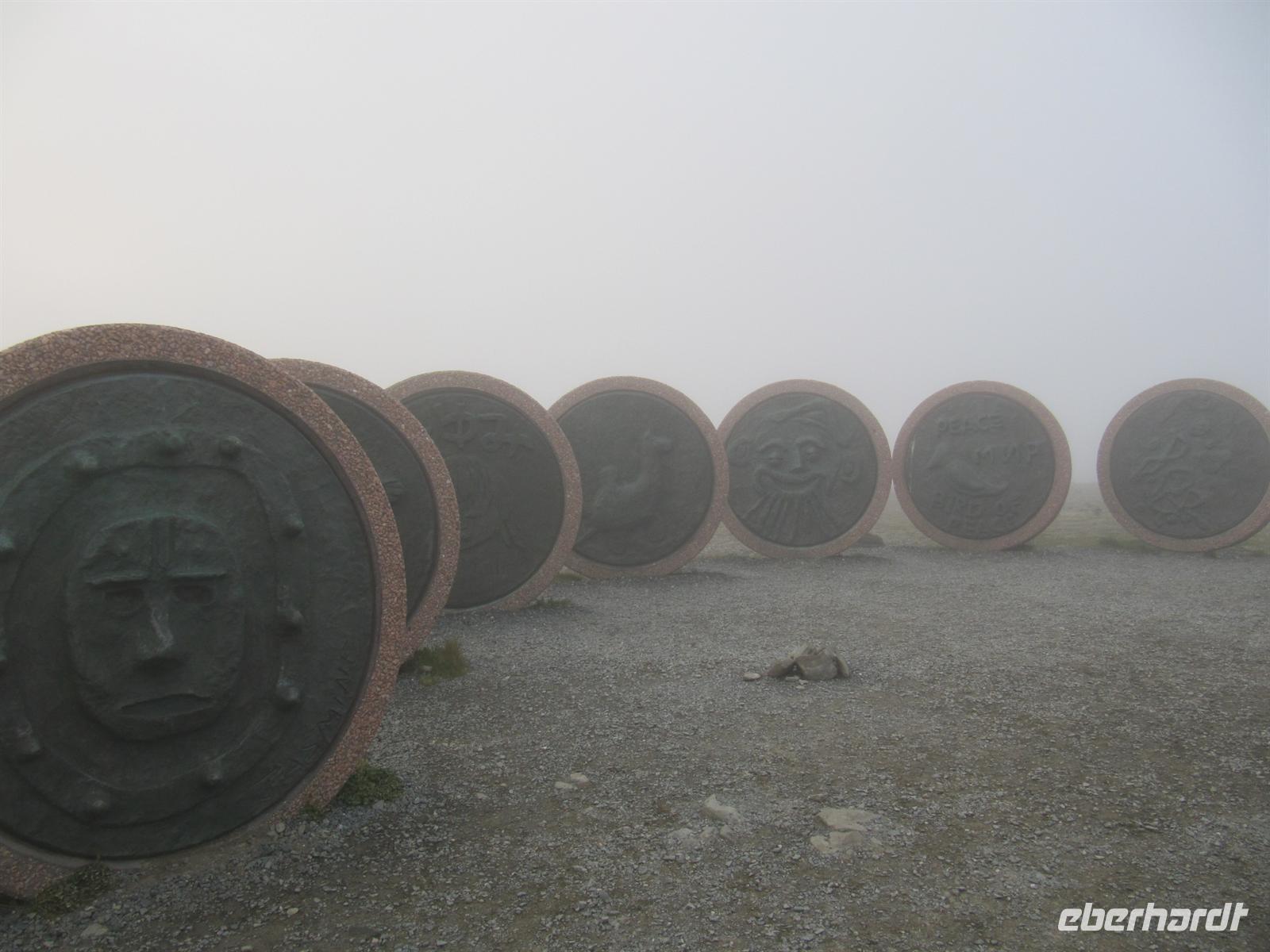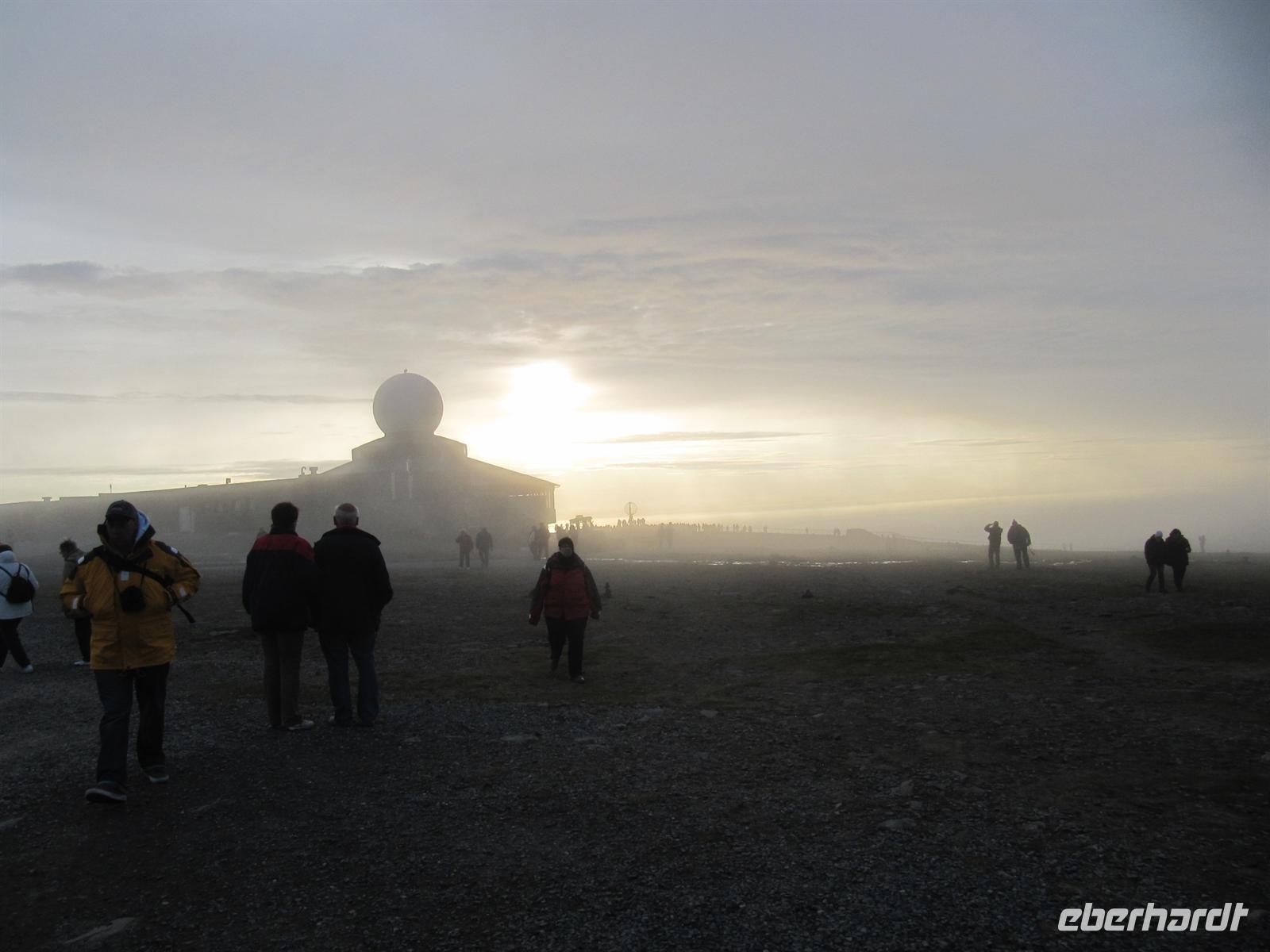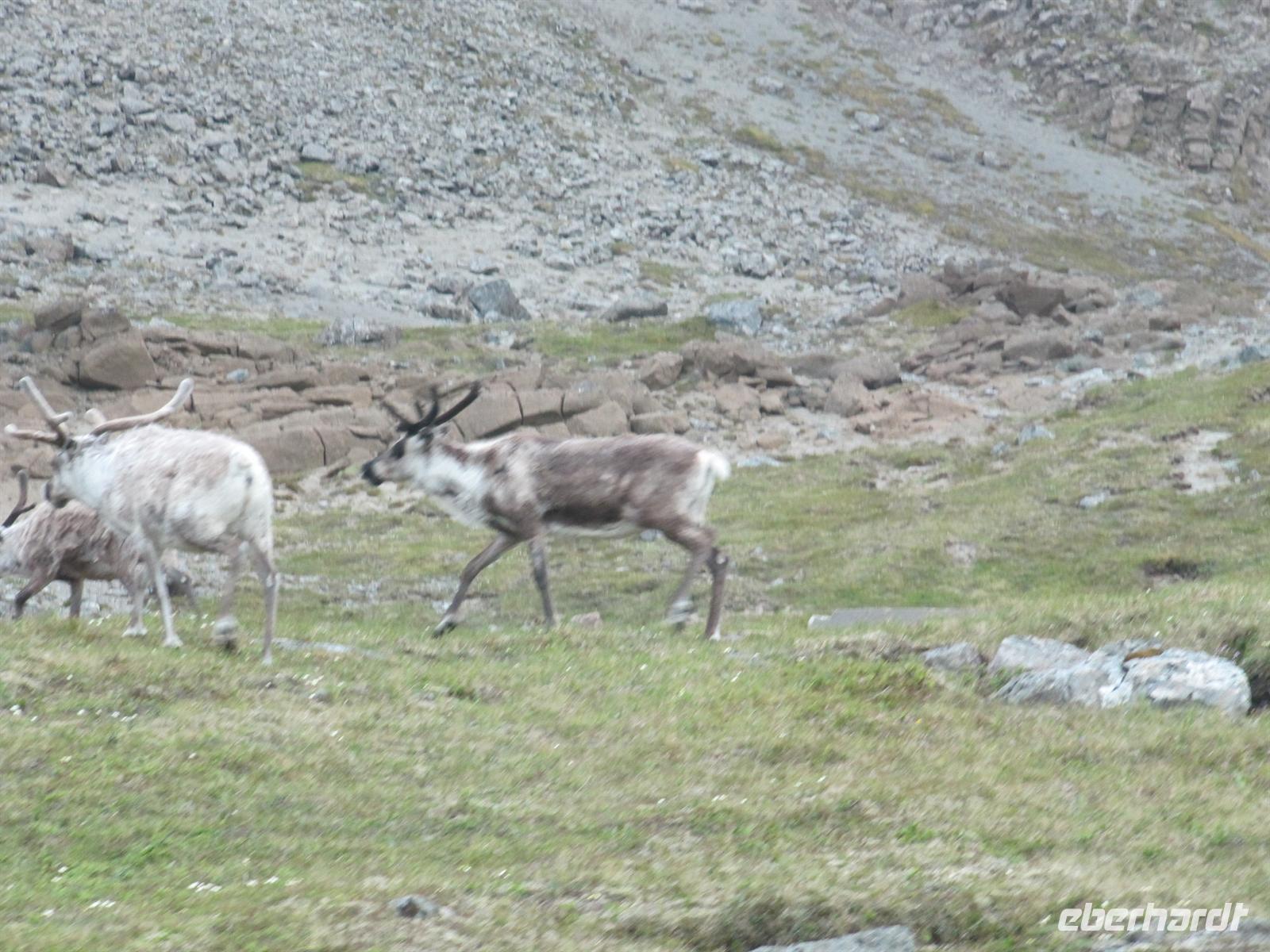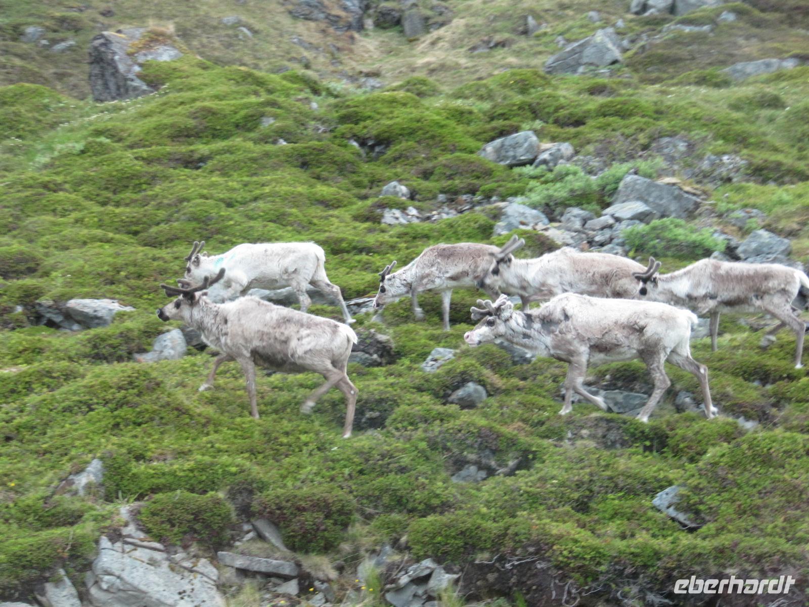 ca. 12°C an. Aber keiner wollte sich diese Ausblicke entgehen lassen. Unser Kapitän steuerte die AIDAluna ganz dicht am Nordkap-Felsen vorbei und wir konnten ganz deutlich die Aussichtsplattform mit der berühmten Weltkugel und die Nordkaphallen erkennen. Die Vorfreude auf unseren Besuch am Nordkap stieg. Am Abend legten wir in Honingsvag an. Wir durften als erste das Schiff verlassen und fuhren mit einem der ersten Busse zum Nordkap. Unsere Eberhardt-Gruppe bekam einen eigenen Bus zugeteilt. So konnte Susanne noch einige interessante Ausführungen zum Nordkap, zu den Rentieren und zum Leben der Samen im hohen Norden machen. Auf der Fahrt zum Nordkap durch die raue, aber dennoch beeindruckende Landschaft begegneten uns die Rentiere. Sie leben im Sommer hier und ernähren sich von den Flechten und Moosen. Am Nordkap begrüßte die Mitternachtssonne. Natürlich wollten alle ein Foto mit der berühmten Weltkugel. Wir ließen unsere Blicke über das weite Meer schweifen, ein erhabener Augenblick. In den Nordkaphallen erlebten wir einen Film über das Nordkap im Lauf der Jahreszeiten, schauten nach Mitbringseln oder holten uns den heiß begehrten Nordkap-Sonderstempel. Als wir wieder aus den Nordkaphallen heraustraten, sahen wir plötzlich nichts mehr. Nebel und Regen waren aufgezogen, das eigentlich so typische Nordkap-Wetter. Glücklich kehrten wir mit schönen Eindrücken zum Schiff zurück.