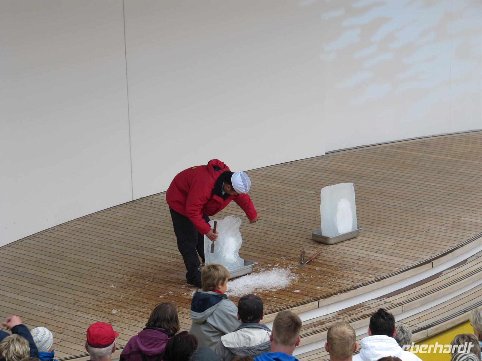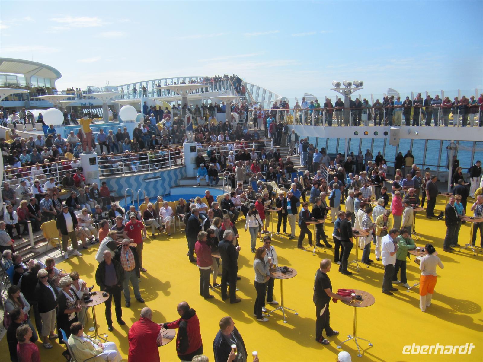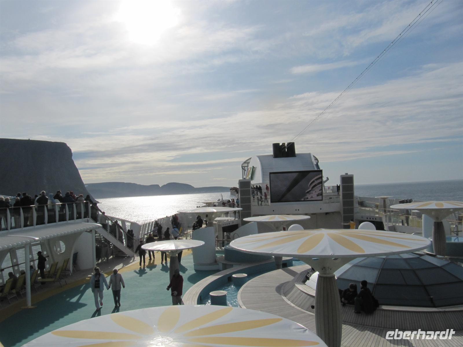 Als kleine Entschädigung für den ausgefallenen Landgang in Reykjavik lud uns die Besatzung bei strahlendem Sonnenschein zu einem maritimen Frühschoppen auf das Pooldeck ein. Der Shantychor der Besatzung erfreute uns mit einigen bekannten Seemannsliedern und die Band der Besatzung sorgte mit heißen Titeln für gute Stimmung. Natürlich durften Bier und Fischbrötchen nicht fehlen. So verging der Vormittag wie im Flug. Das tolle Wetter entschädigte uns seinerseits und wir genossen den Tag auf dem Außendeck.