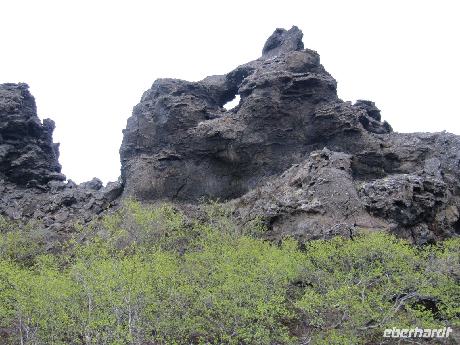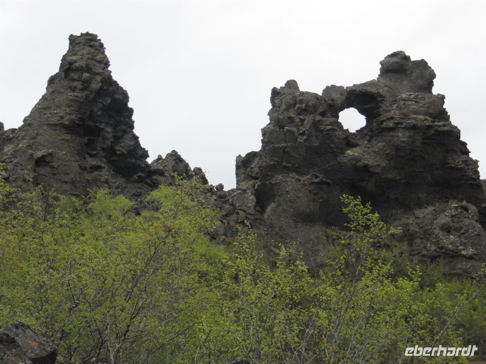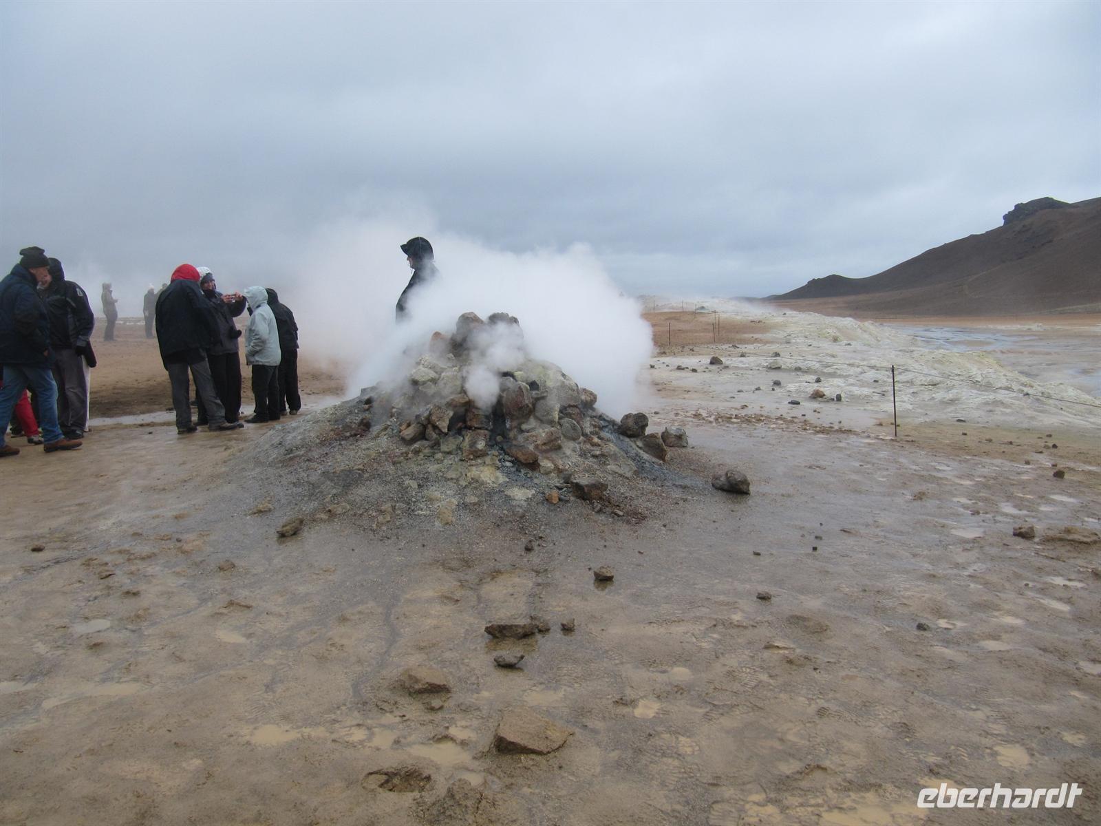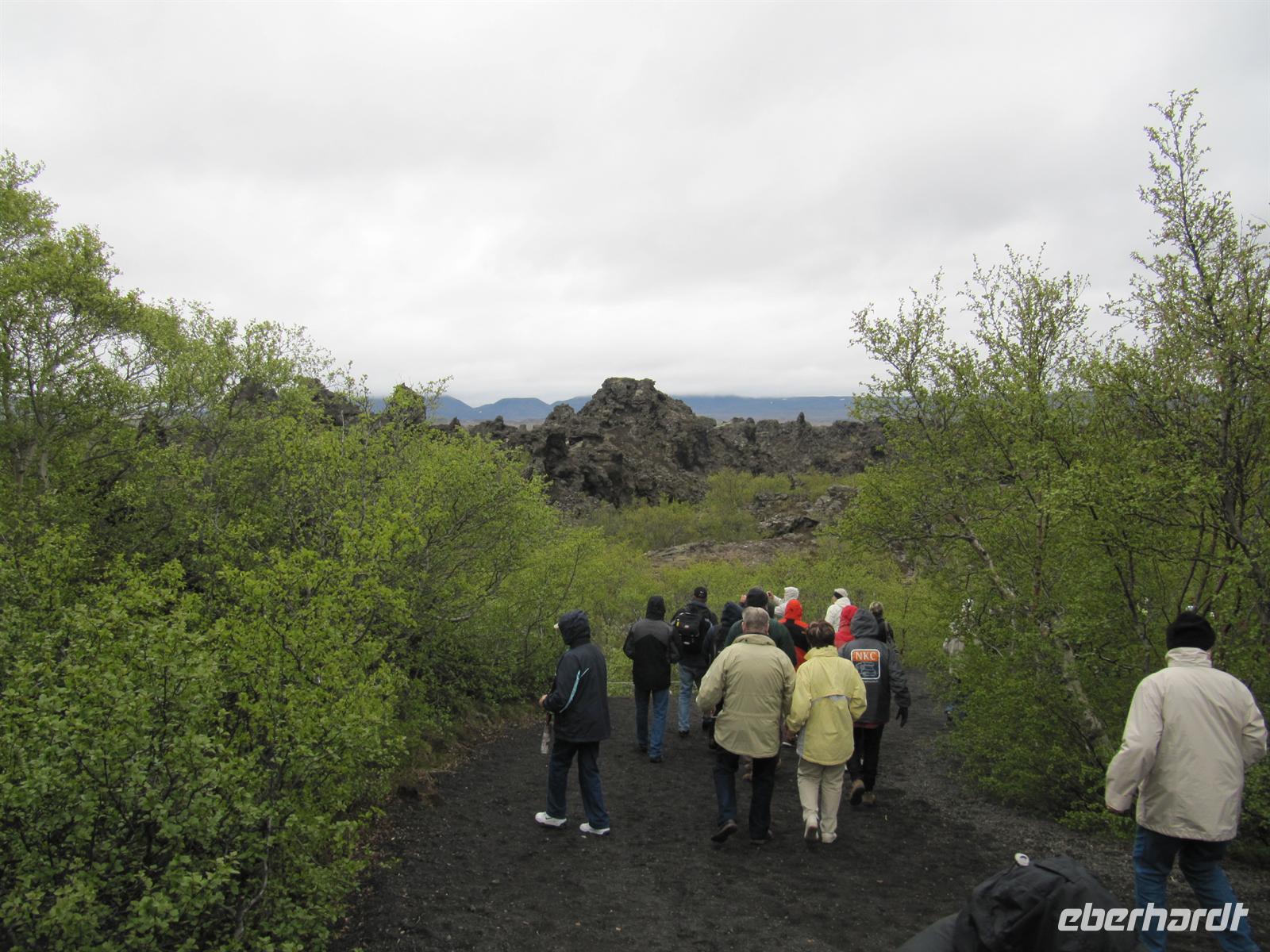 unserer Gäste hatten sich für einen Ausflug zu den Naturwundern des Nordens entschieden. Helga unsere örtliche Reiseleiterin erwartete uns. Zunächst führte uns die Fahrt aus dem Eyjafjord hinaus. Wir sahen unsere AIDAluna im Hafen von Akureyri liegen. Durch die interessante Landschaft aus erstarrter Lava vorbei an einsamen Gehöften fuhren wir nach Skútustadir zu den Pseudokratern vulkanischen Ursprungs. Wir stärkten uns bei einem Kaffee und isländischem Kuchen, bevor wir unsere Reise entlang des Myvatn-See fortsetzten. Übersetzt heißt der See „Mückensee" und im Hochsommer sollen hier bis zu 500 Arten von Mücken leben. Da wir im kältesten Juni seit 60 Jahren Island besuchten, brauchten wir die Mücken nicht zu fürchten. Bei einer Außentemperatur von ca. 5 - 7 ° Celisus, schneidendem Wind und Regen waren eher Handschuh, Schal und Mütze angebracht. Doch das widrige Wetter konnte unsere gute Laune nicht trüben. Helga erfreute uns zwischendurch immer wieder mit dem Vortrag wunderschöner isländischer Volkslieder. Wir besuchten anschließend den Lava-Irrgarten in Dimmuborgir. Hier entstanden bizarre Lavafomationen, die teilweise hoch in den Himmel aufragten und Helga wusste
