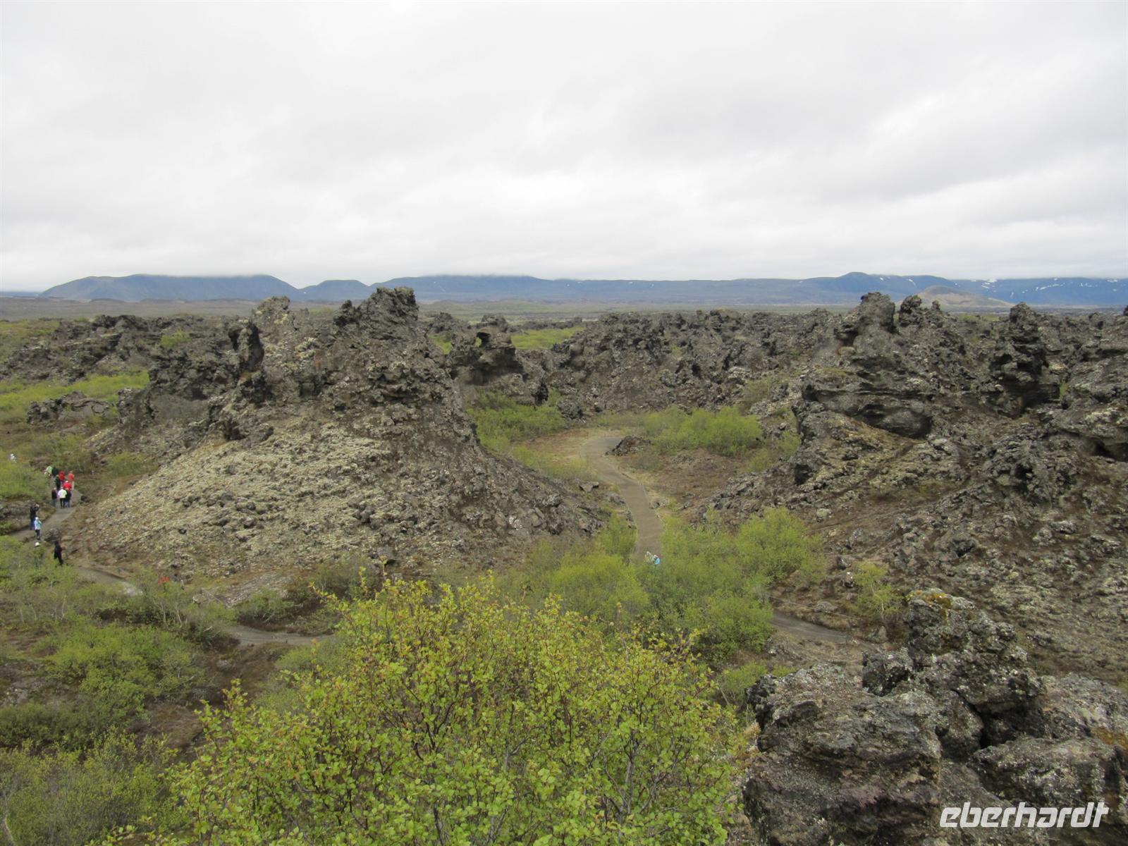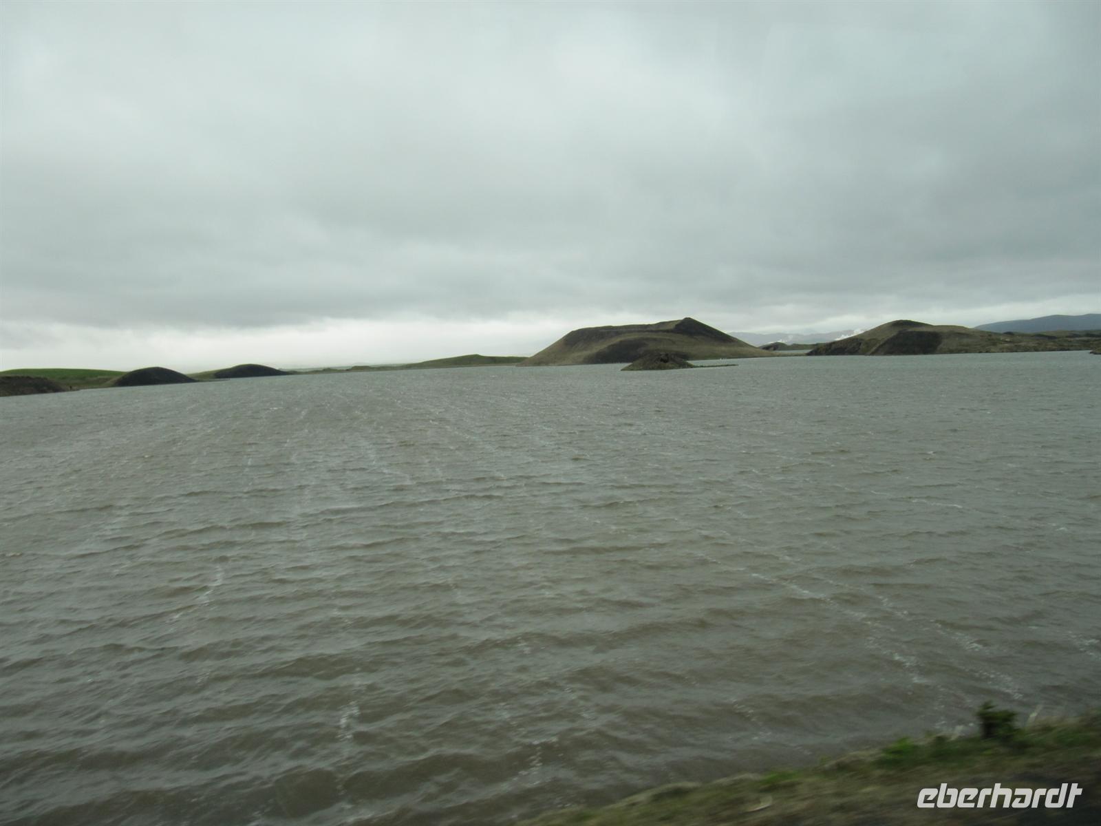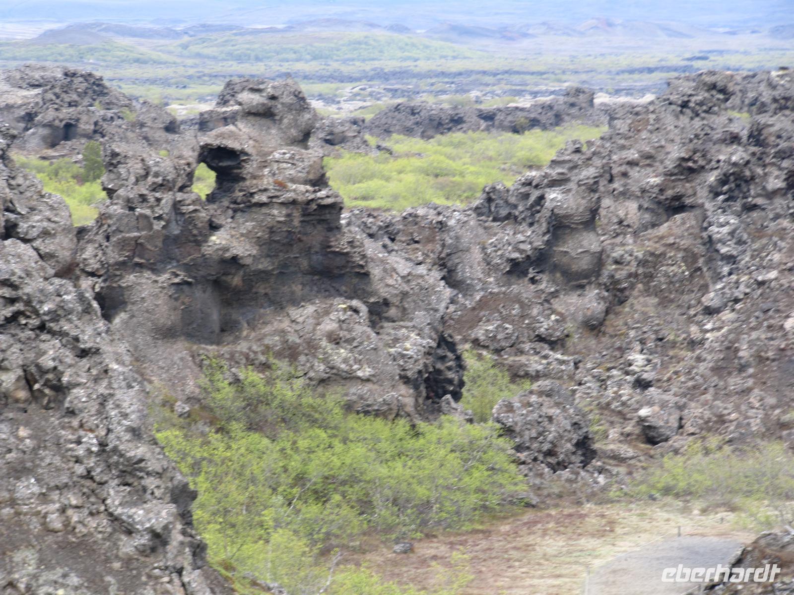 unserer Gäste hatten sich für einen Ausflug zu den Naturwundern des Nordens entschieden. Helga unsere örtliche Reiseleiterin erwartete uns. Zunächst führte uns die Fahrt aus dem Eyjafjord hinaus. Wir sahen unsere AIDAluna im Hafen von Akureyri liegen. Durch die interessante Landschaft aus erstarrter Lava vorbei an einsamen Gehöften fuhren wir nach Skútustadir zu den Pseudokratern vulkanischen Ursprungs. Wir stärkten uns bei einem Kaffee und isländischem Kuchen, bevor wir unsere Reise entlang des Myvatn-See fortsetzten. Übersetzt heißt der See „Mückensee" und im Hochsommer sollen hier bis zu 500 Arten von Mücken leben. Da wir im kältesten Juni seit 60 Jahren Island besuchten, brauchten wir die Mücken nicht zu fürchten. Bei einer Außentemperatur von ca. 5 - 7 ° Celisus, schneidendem Wind und Regen waren eher Handschuh, Schal und Mütze angebracht. Doch das widrige Wetter konnte unsere gute Laune nicht trüben. Helga erfreute uns zwischendurch immer wieder mit dem Vortrag wunderschöner isländischer Volkslieder. Wir besuchten anschließend den Lava-Irrgarten in Dimmuborgir. Hier entstanden bizarre Lavafomationen, die teilweise hoch in den Himmel aufragten und Helga wusste