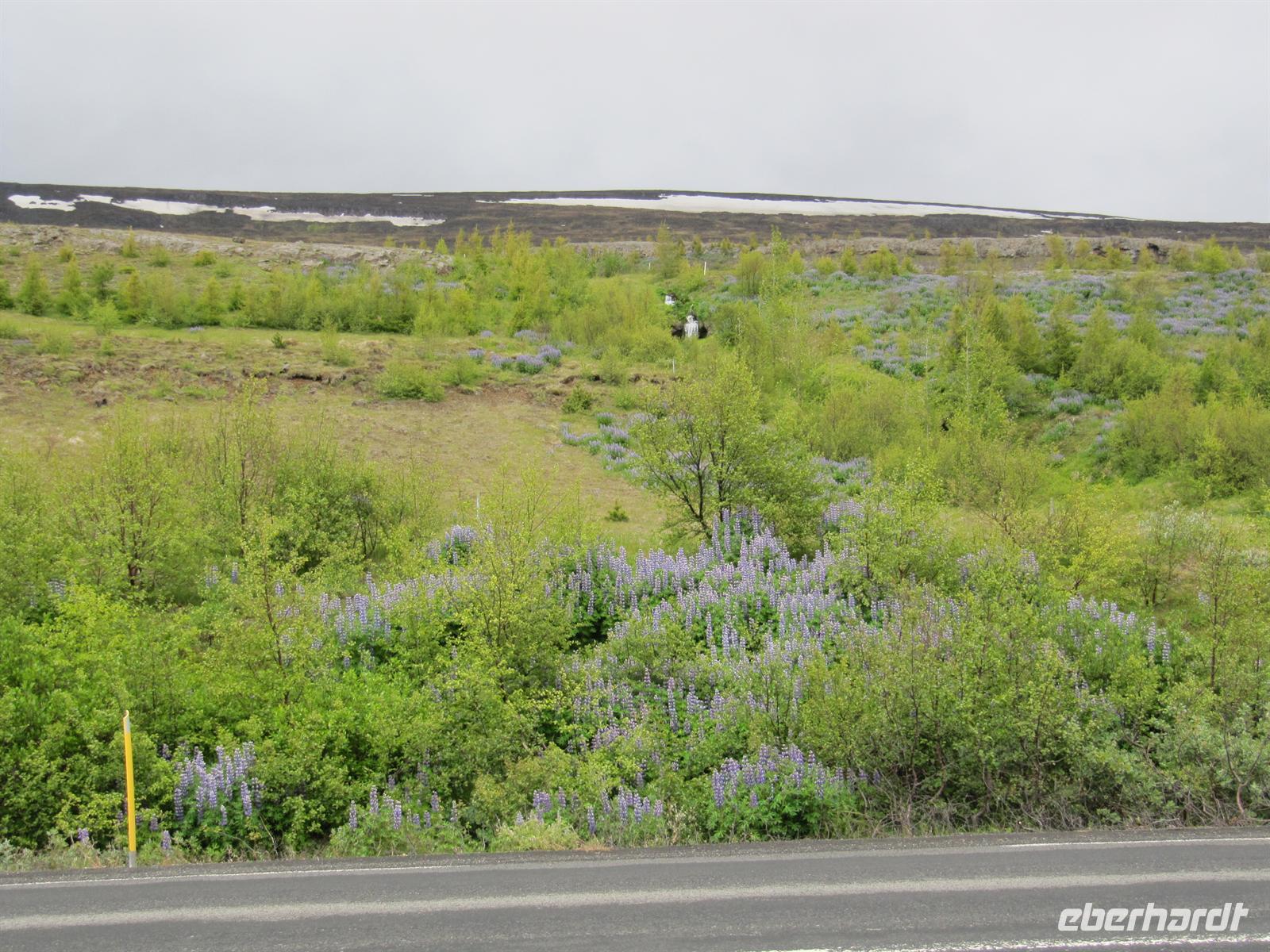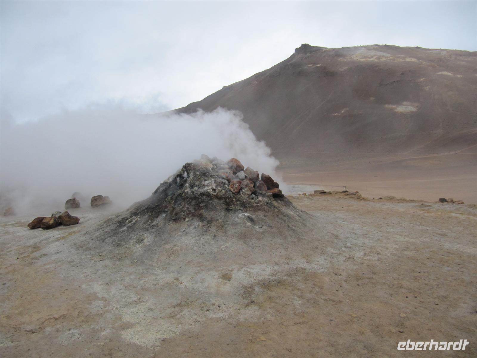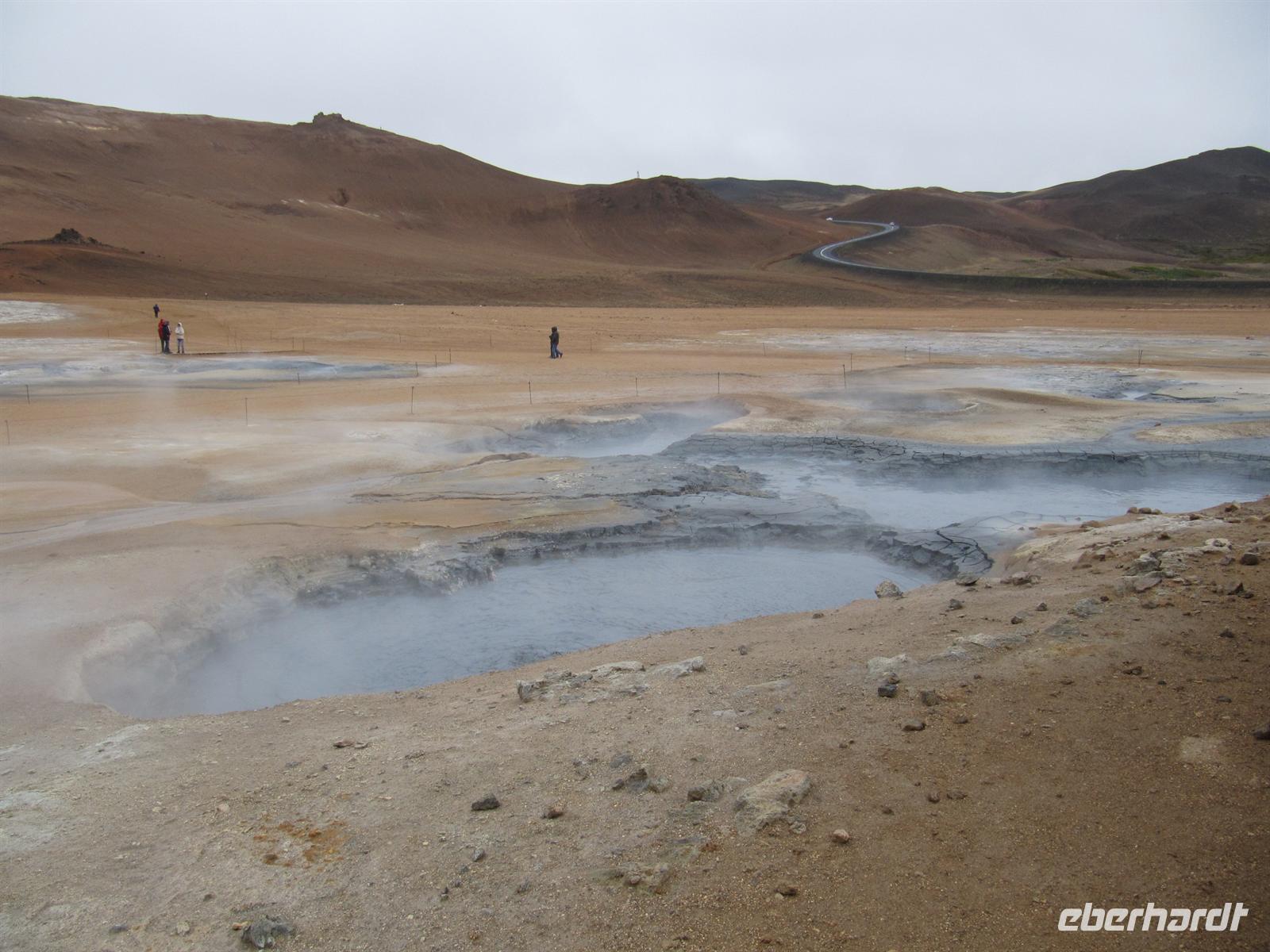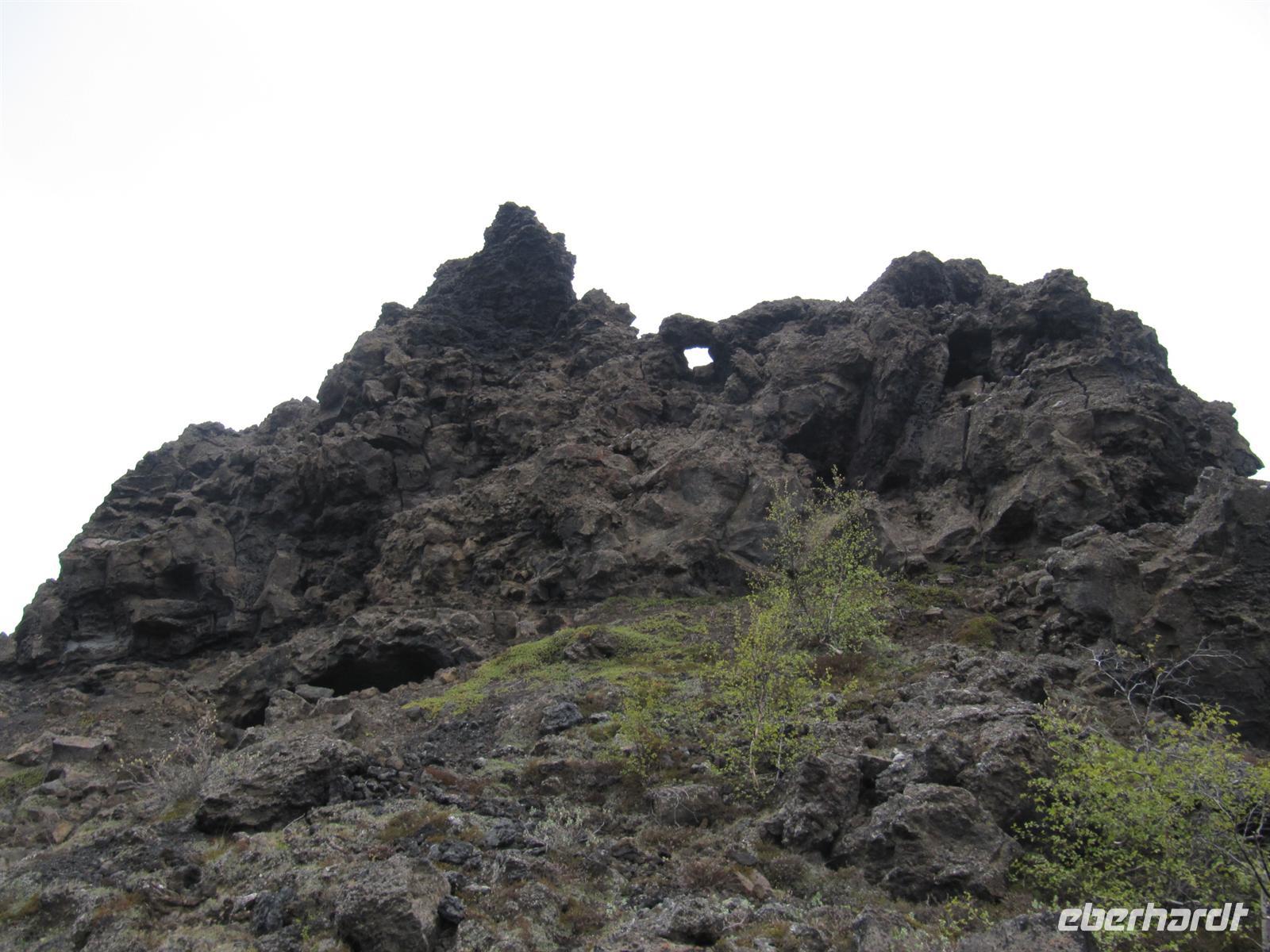 unserer Gäste hatten sich für einen Ausflug zu den Naturwundern des Nordens entschieden. Helga unsere örtliche Reiseleiterin erwartete uns. Zunächst führte uns die Fahrt aus dem Eyjafjord hinaus. Wir sahen unsere AIDAluna im Hafen von Akureyri liegen. Durch die interessante Landschaft aus erstarrter Lava vorbei an einsamen Gehöften fuhren wir nach Skútustadir zu den Pseudokratern vulkanischen Ursprungs. Wir stärkten uns bei einem Kaffee und isländischem Kuchen, bevor wir unsere Reise entlang des Myvatn-See fortsetzten. Übersetzt heißt der See „Mückensee" und im Hochsommer sollen hier bis zu 500 Arten von Mücken leben. Da wir im kältesten Juni seit 60 Jahren Island besuchten, brauchten wir die Mücken nicht zu fürchten. Bei einer Außentemperatur von ca. 5 - 7 ° Celisus, schneidendem Wind und Regen waren eher Handschuh, Schal und Mütze angebracht. Doch das widrige Wetter konnte unsere gute Laune nicht trüben. Helga erfreute uns zwischendurch immer wieder mit dem Vortrag wunderschöner isländischer Volkslieder. Wir besuchten anschließend den Lava-Irrgarten in Dimmuborgir. Hier entstanden bizarre Lavafomationen, die teilweise hoch in den Himmel aufragten und Helga wusste