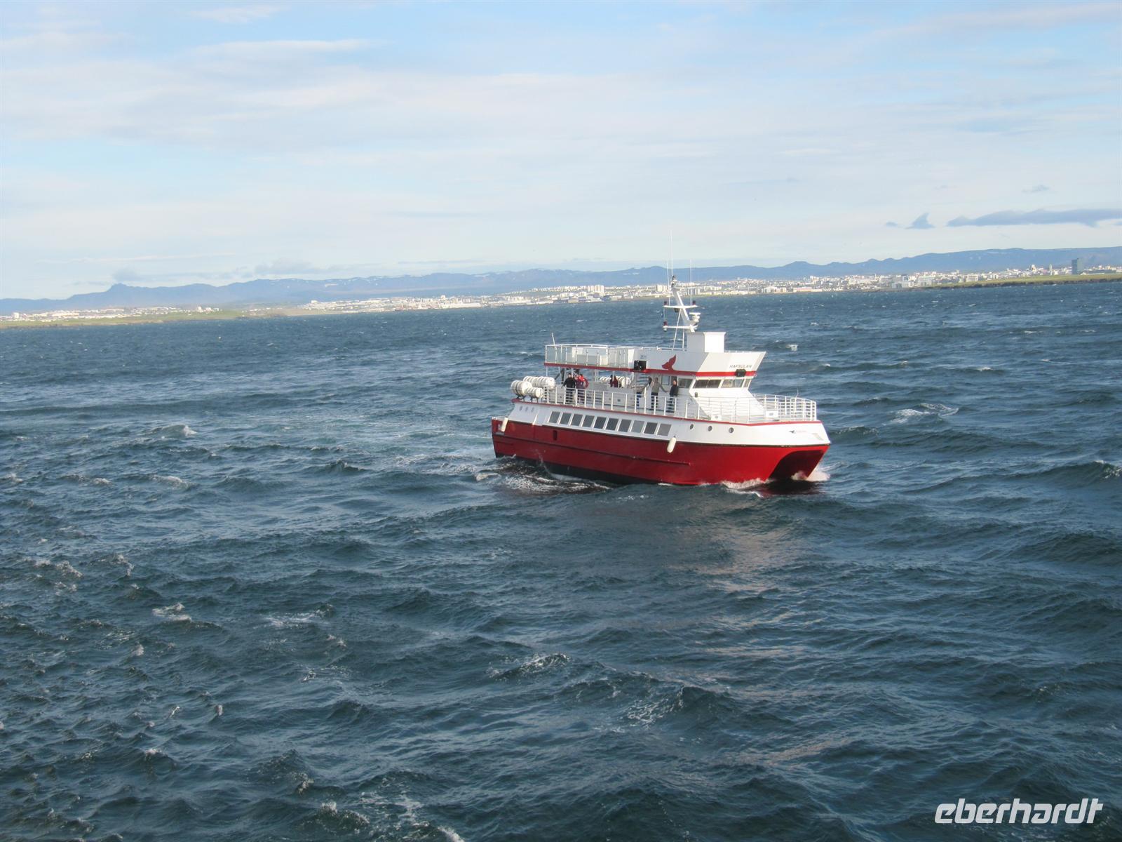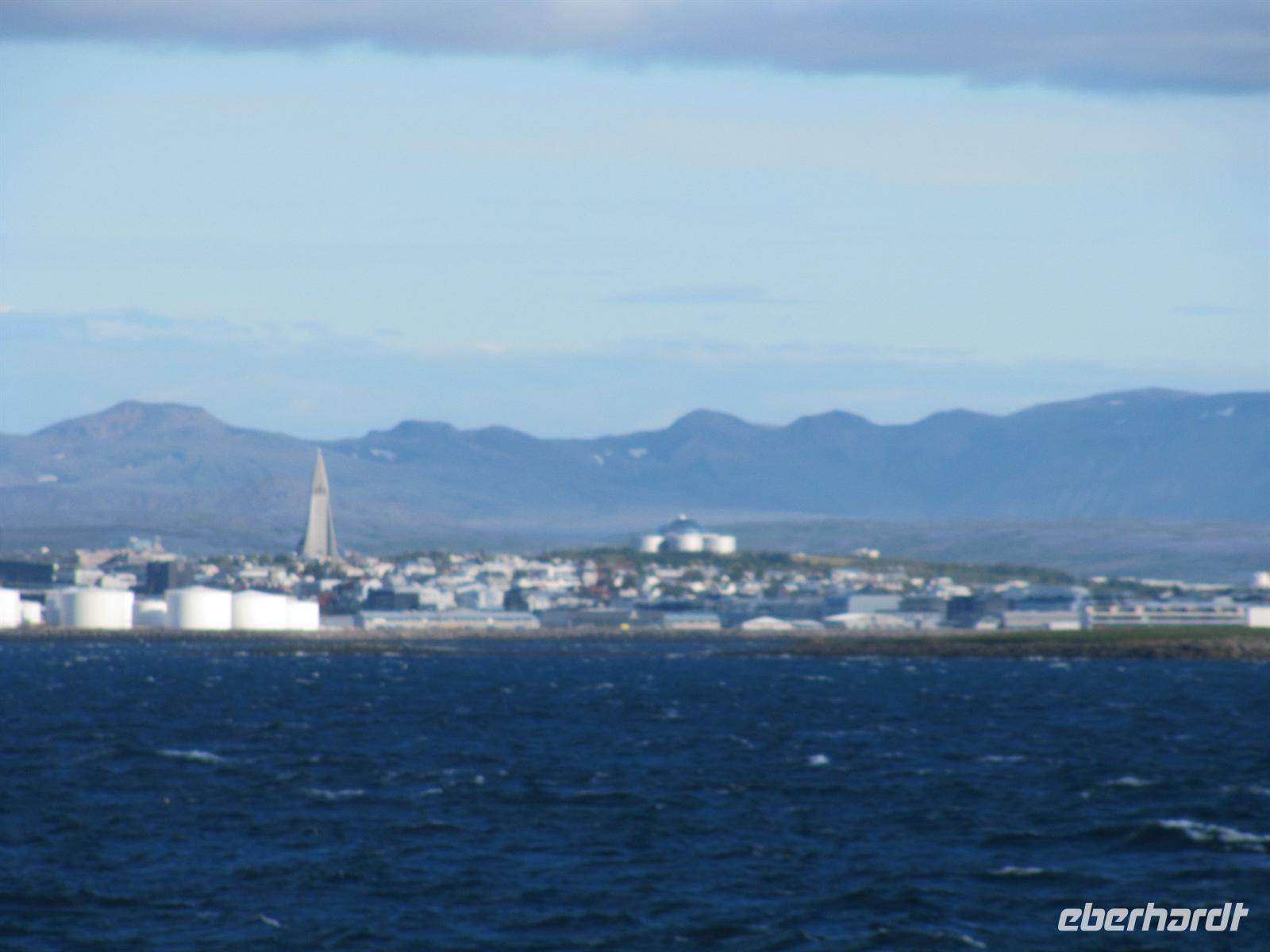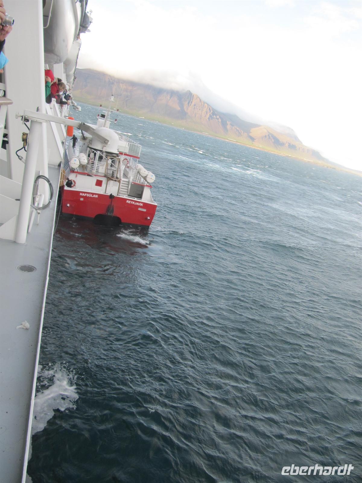 war die See immer noch sehr unruhig. Der Kapitän hatte bereits am Vortag angekündigt, dass wir in Reykjavik auf Grund des Windes nicht im Hafen einlaufen werden, sondern auf Reede gehen und Tenderverkehr eingerichtet wird. Wir freuten uns auf schöne Ausflüge zum Gulfoss und zu den Geysiren oder nach Reykjavik und zur Blauen Lagune. Als wir uns an den einzelnen Treffpunkten eintrafen, meldete sich unser Kapitän zu Wort. Auf Grund des starken Windes war es nicht möglich die Tenderboote zu Wasser zu lassen und einen sicheren Tenderverkehr einzurichten. Das bedeutete für uns, dass wir das Schiff nicht verlassen konnten und die Ausflüge nicht stattfinden konnten. Da einige Gäste in Akureyri das Schiff für einen zweitägigen Ausflug verlassen hatten, mussten diese natürlich wieder an Bord kommen. Mit einem Walbeobachtungsboot wurden die Gäste zum Schiff gebracht und erst nach mehrmaligen Versuchen konnte das Boot sicher am Schiff festmachen und die Gäste konnten wieder zusteigen. Als wir sahen, wie das doch etwas robustere Boot auf den Wellen tanzte, war uns klar, dass die Tenderboote für die Wellen wie Spielzeug gewesen wären. So bleib uns nur ein schönes Foto von der isländischen Hauptstadt in der Abendsonne zu schießen. Denn das Wetter sollte sich nicht ändern und so entschied der Kapitän, bereits in der Nacht Kurs auf Invergordon zu nehmen.