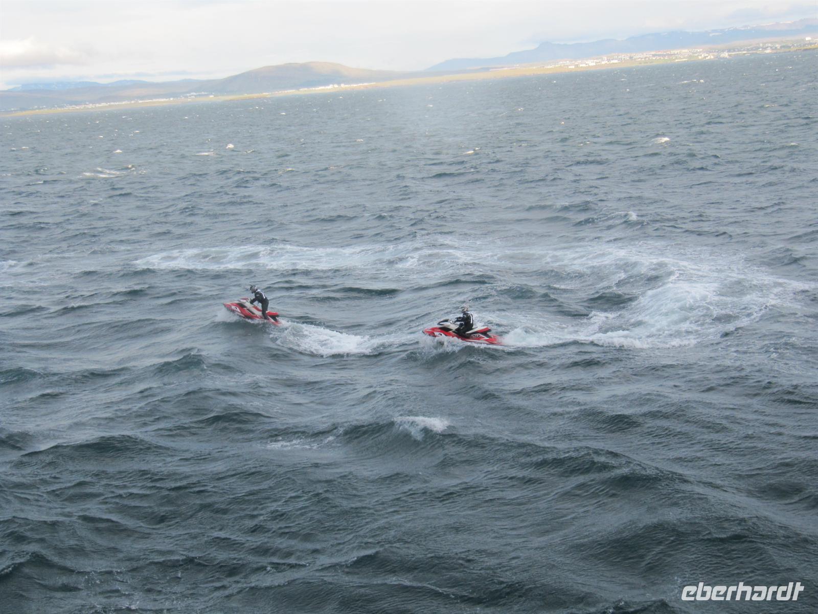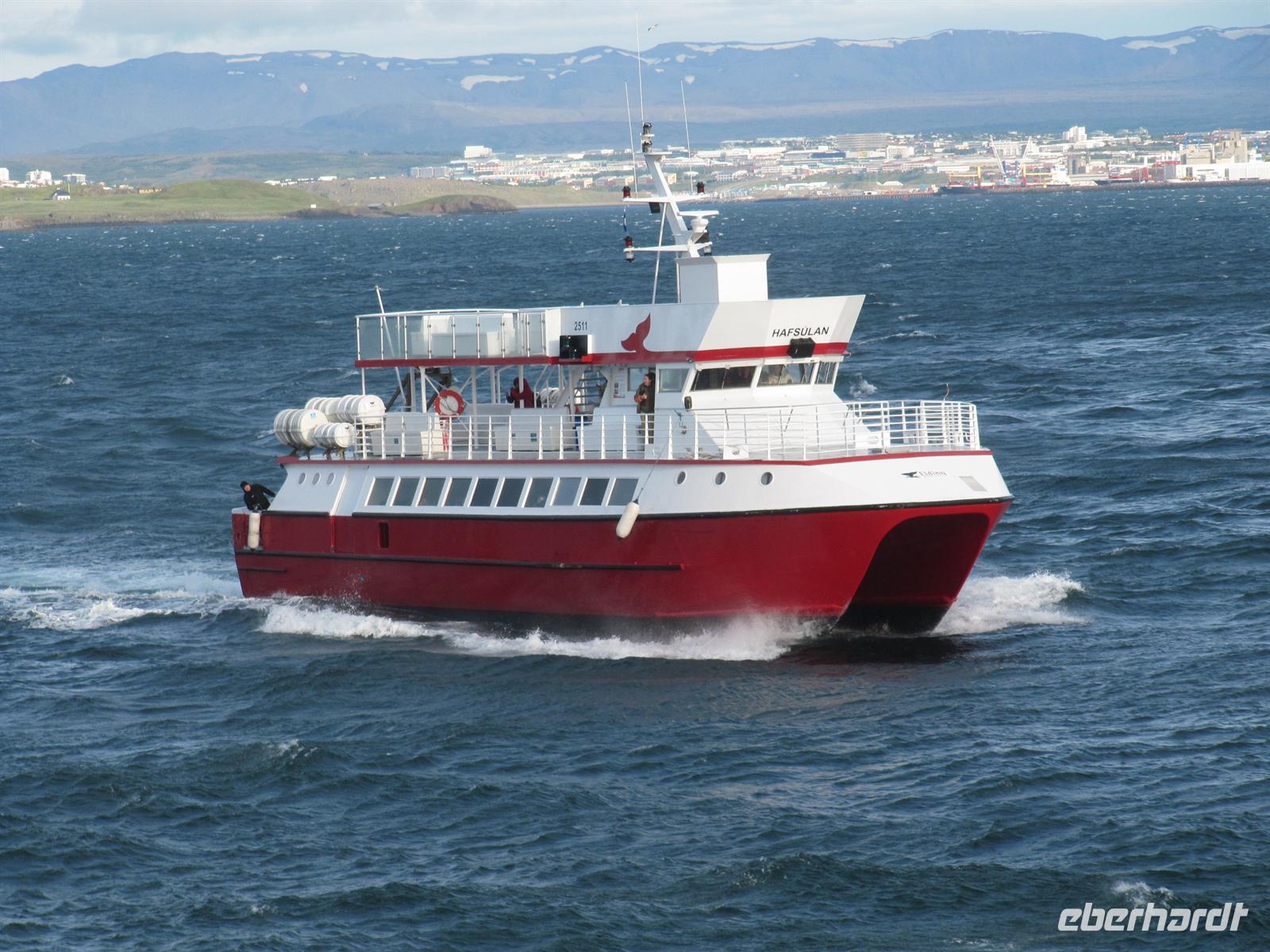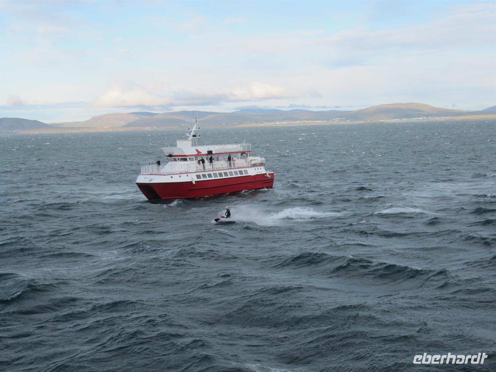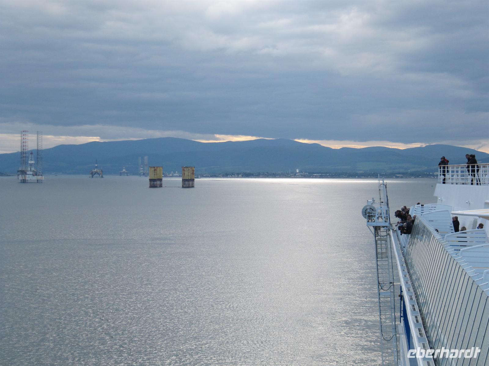 war die See immer noch sehr unruhig. Der Kapitän hatte bereits am Vortag angekündigt, dass wir in Reykjavik auf Grund des Windes nicht im Hafen einlaufen werden, sondern auf Reede gehen und Tenderverkehr eingerichtet wird. Wir freuten uns auf schöne Ausflüge zum Gulfoss und zu den Geysiren oder nach Reykjavik und zur Blauen Lagune. Als wir uns an den einzelnen Treffpunkten eintrafen, meldete sich unser Kapitän zu Wort. Auf Grund des starken Windes war es nicht möglich die Tenderboote zu Wasser zu lassen und einen sicheren Tenderverkehr einzurichten. Das bedeutete für uns, dass wir das Schiff nicht verlassen konnten und die Ausflüge nicht stattfinden konnten. Da einige Gäste in Akureyri das Schiff für einen zweitägigen Ausflug verlassen hatten, mussten diese natürlich wieder an Bord kommen. Mit einem Walbeobachtungsboot wurden die Gäste zum Schiff gebracht und erst nach mehrmaligen Versuchen konnte das Boot sicher am Schiff festmachen und die Gäste konnten wieder zusteigen. Als wir sahen, wie das doch etwas robustere Boot auf den Wellen tanzte, war uns klar, dass die Tenderboote für die Wellen wie Spielzeug gewesen wären. So bleib uns nur ein schönes Foto von der isländischen Hauptstadt in der Abendsonne zu schießen. Denn das Wetter sollte sich nicht ändern und so entschied der Kapitän, bereits in der Nacht Kurs auf Invergordon zu nehmen.