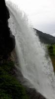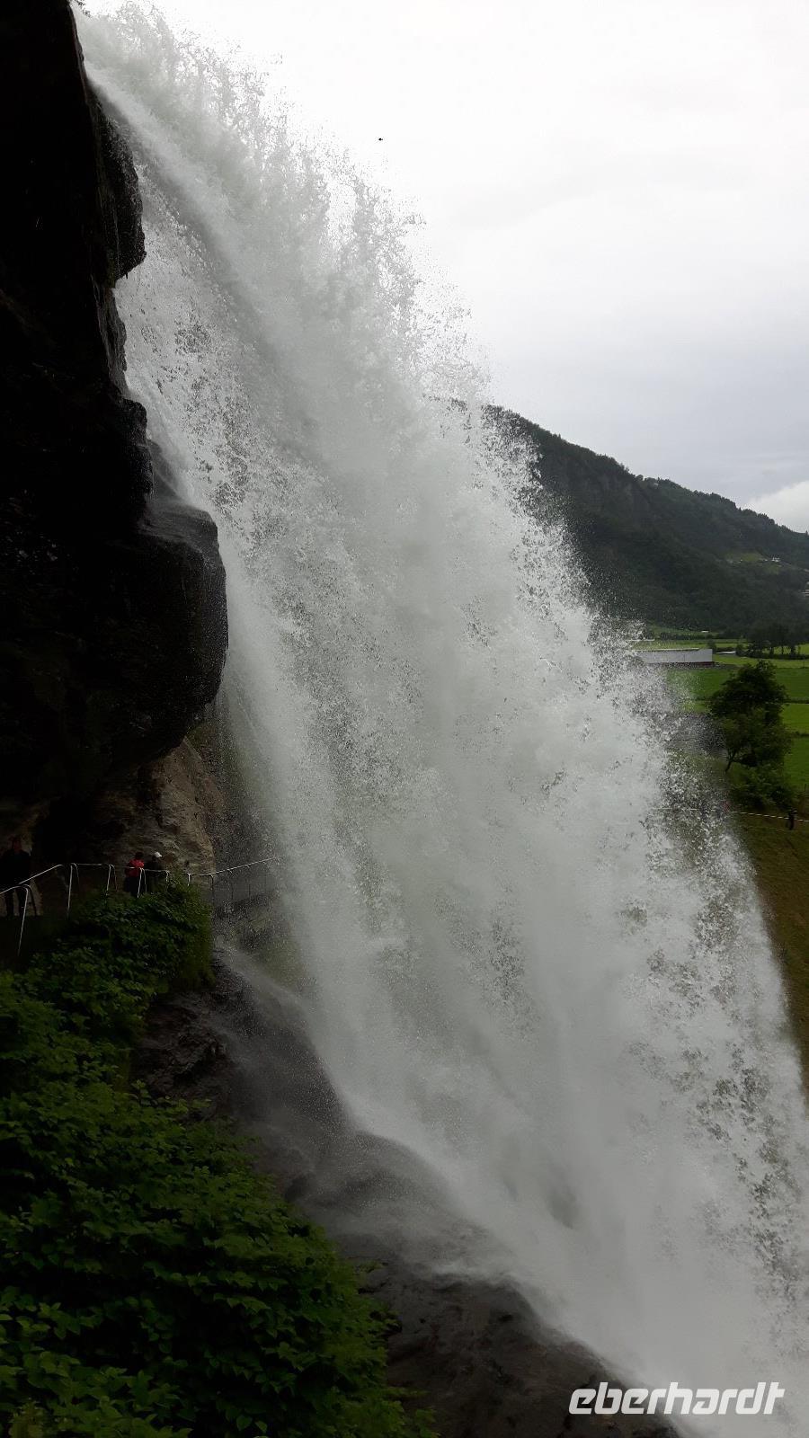 Am Steinsdalfossen legen wir eine Pause ein, die Fußgänger lassen es sich nicht nehmen die Besonderheit dieses Wasserfalls kennenzulernen; man kann hinter ihm hindurchgehen ohne nass zu werden.