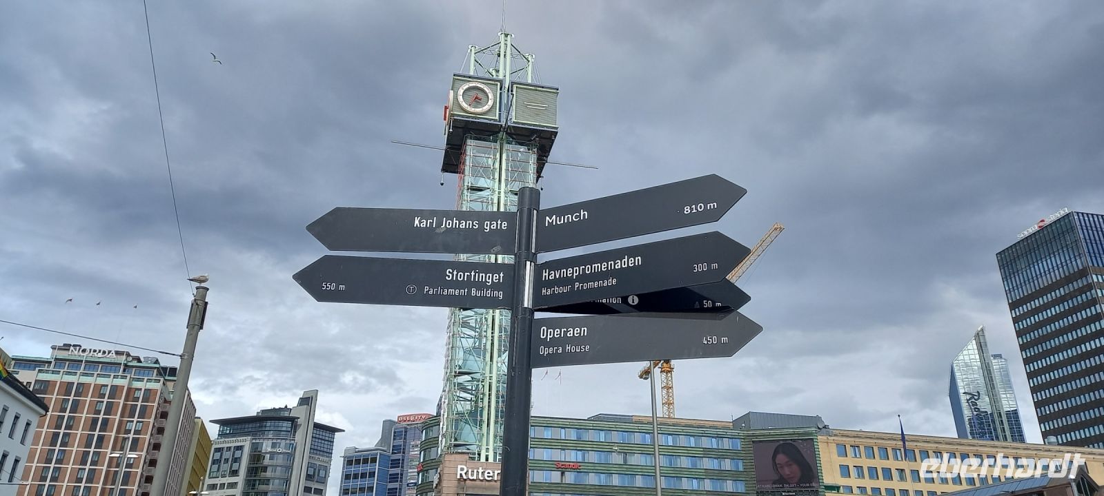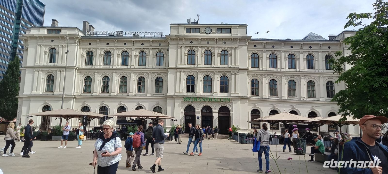 Flüge von Frankfurt und von Berlin brachten unsere kleine Gruppe nach Oslo. Hier, im Oslo Airport, startete dann auch der erste Zug, der"Flytoget“ in die Innenstadt zum Bahnhof Oslo Sentral. Da unser Hotel quasi im großen Bahnhofskomplex war, konnten wir gleich einchecken und die Gegend um das Hotel erkunden. Da gab es viel zu sehen und zu erforschen: Die neue Oper, die Deichmann-Bibliothek, das neue Munch-Museum, die neue Strandpromenade und vieles andere mehr. Als die Gruppe aus Frankfurt ankam, waren schon vier Gäste unterwegs, die früher angereist waren. Und so dauerte es nicht lange, bis auch die "Frankfurter" das herrliche Wetter nutzten und gleich unterwegs waren. Treffpunkt war für alle das benachbarte Restaurant in der Ostbanhalle, in dem für uns das Abendessen (letztlich) organisiert war.
