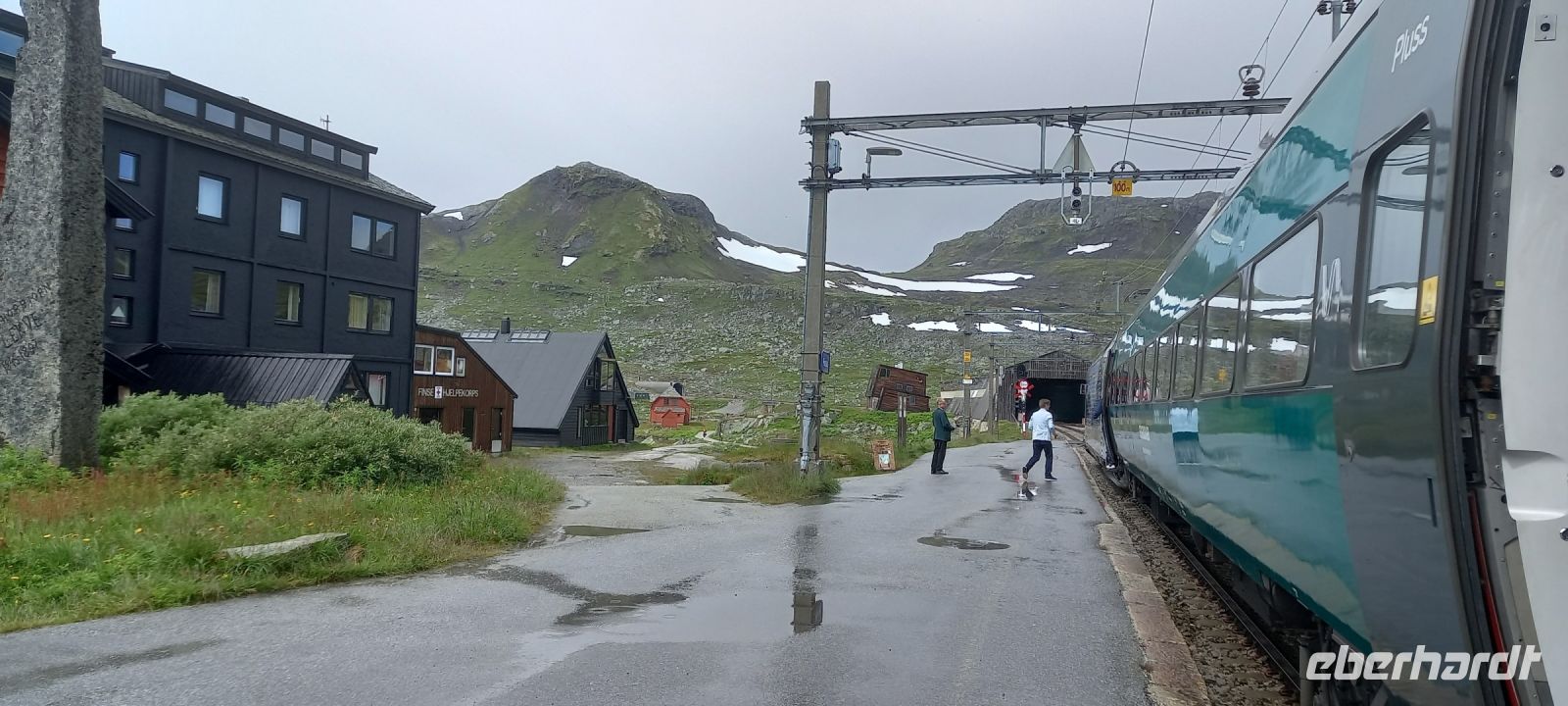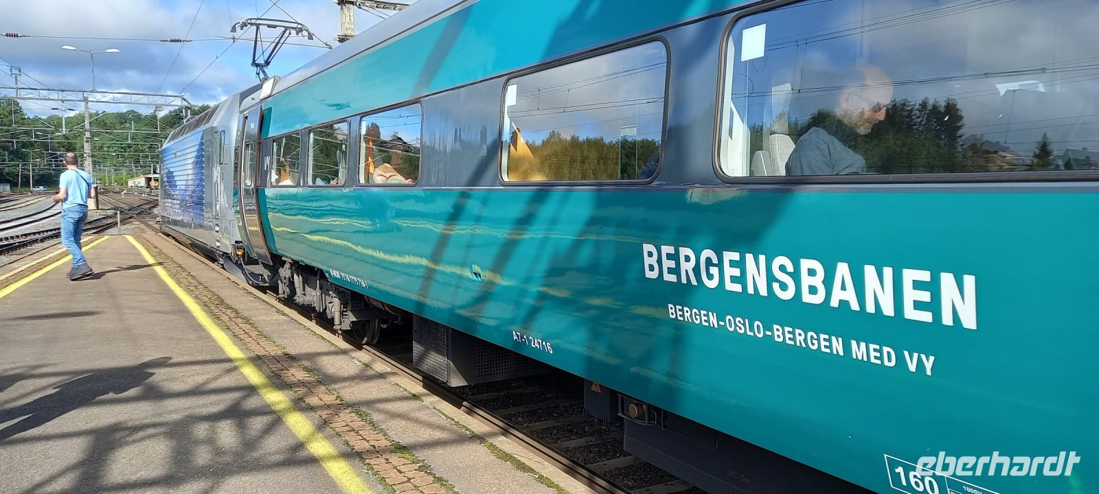 Nach dem Frühstück und Auschecken aus unserem Stadthotel geht es heute mit der berühmten Bergenbahn von Oslo nach Voss. Es erst durch Stadtgebiet von Oslo, dann durch ländliche Regionen mit tiefen Wäldern, Seen und kleinen Bauernhöfen. Aber dann wandelt sich das Bild: Fast unmerktlich bringt uns der Zug in die Hochgebirgslandschaft der Hardangervidda, die größte Hochebene Europas! Schroffe Felsen, dann von Gletschern abgeschliffene Hügel, Schneereste, Schmelzwasser-Seen und Bäche ziehen am Fenser der Bergenbahn vorbei. Wir kommen über die Baumgrenze (so ab 800 - 1.000 m Höhe) und erreichen Finse, den Scheitelpunkt der Bergebahn mit 1.222 m Höhe. Nun ist es nicht mehr weit hinunter nach Voss.