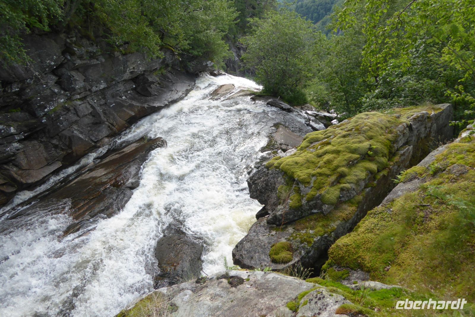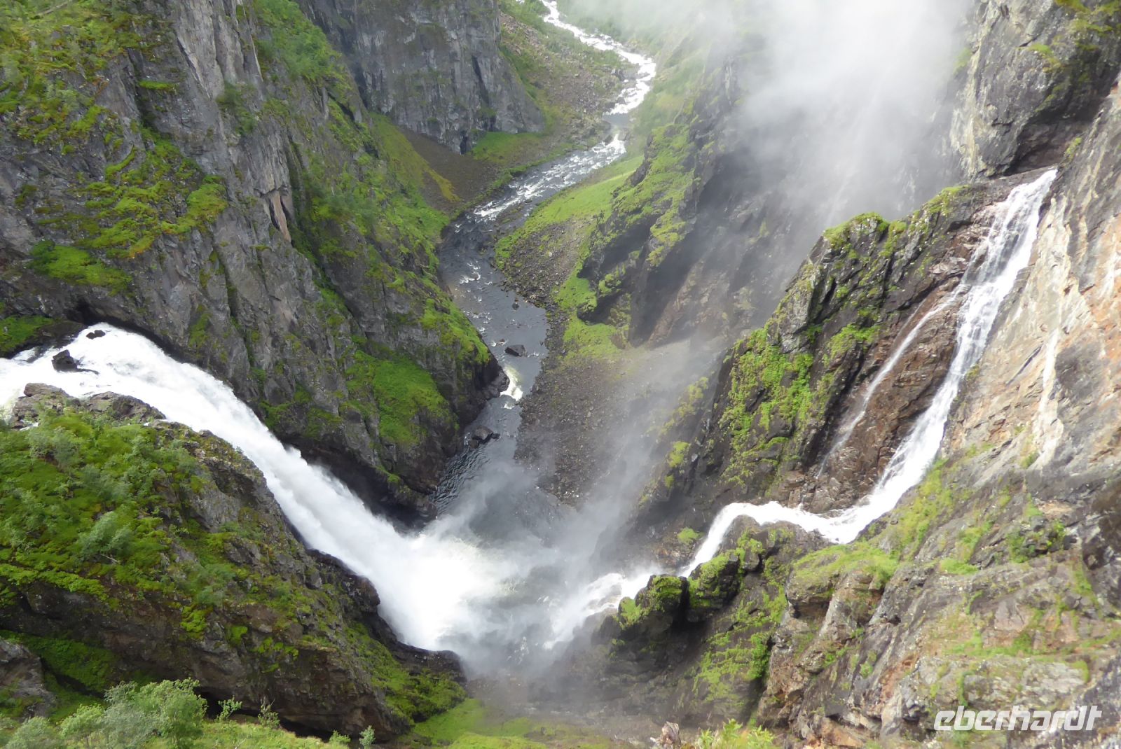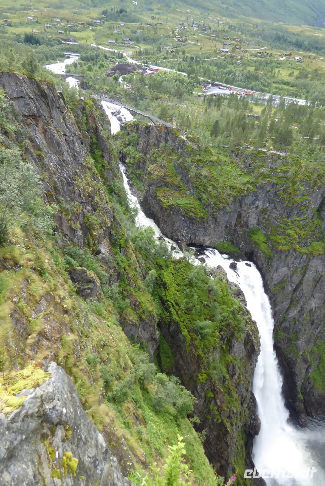 Weiter geht es mit einer "Sondereinlage", für die der Fahrer erst gewonnen werden musste: Hinauf auf die Hocheben der Hardangervidda nach Dyrant Fjellstova hoch oben in der Wildnis. In der Hütte mit Kaffee gab es eine Stärkung, zurück gings vorbei an dem riesigen Damm des Sysedam-Stausees und in der Ferne konnten wir den Hardangerjökulen sehen, einen riesigen Gletscher. Damit aber nicht genug. Nun stoppten wir noch an einem wunderschönen, über 150 m hohen Wasserfall, dem Vöringsfossen. Gut ausgebaute Wege und Terrassen ermöglichen eine Ausblick auf den Wasserfall von allen Seiten. Als wir kurz vor 16.00 h wieder im Hotel abgesetzt wurden, hatten wir wieder einen Reisetag mit vielen schönen Eindrücken erlebt. Den Abschluß machte dann wieder ein leckeres Abendessen-Buffet im Hotel.