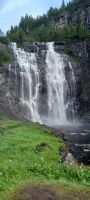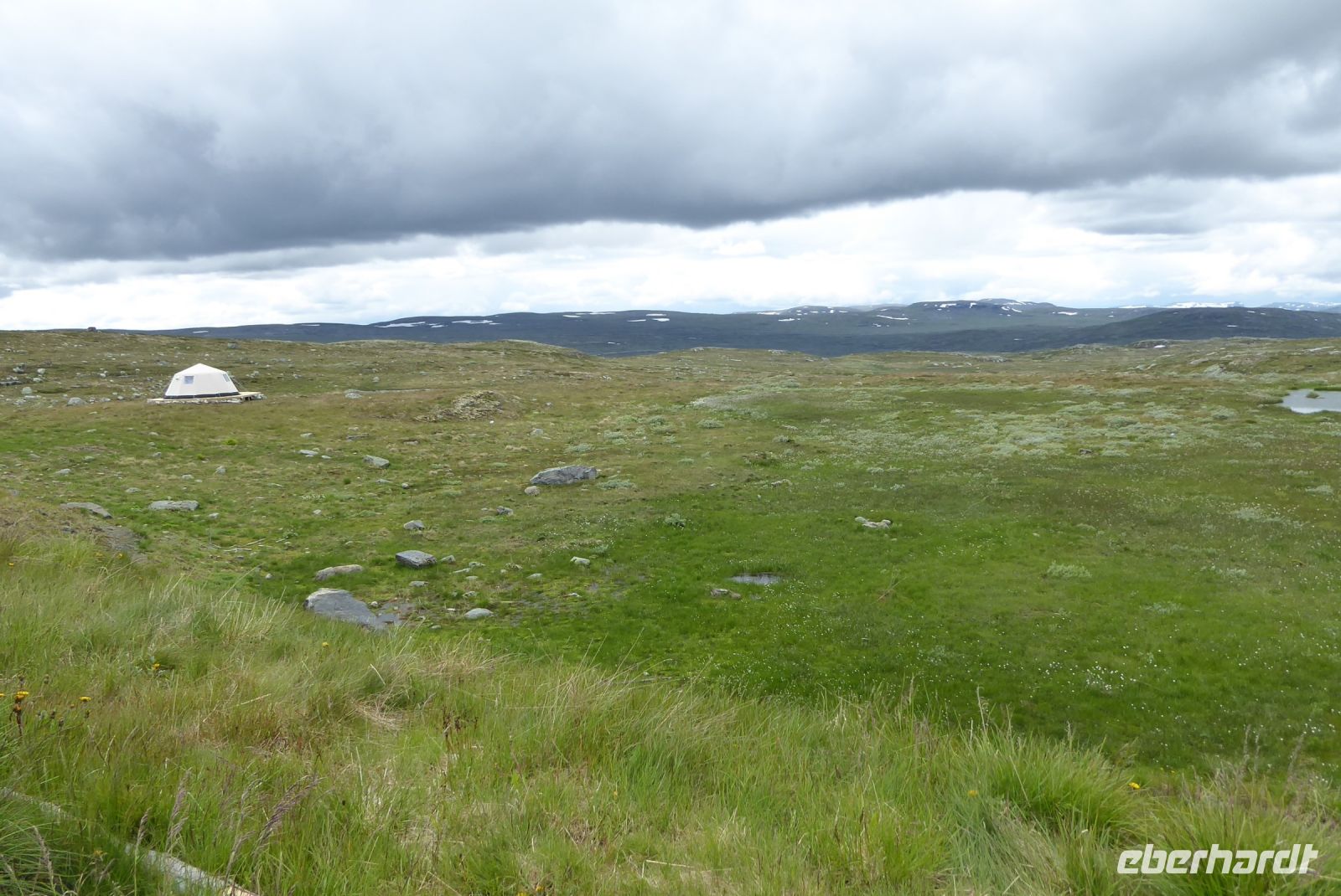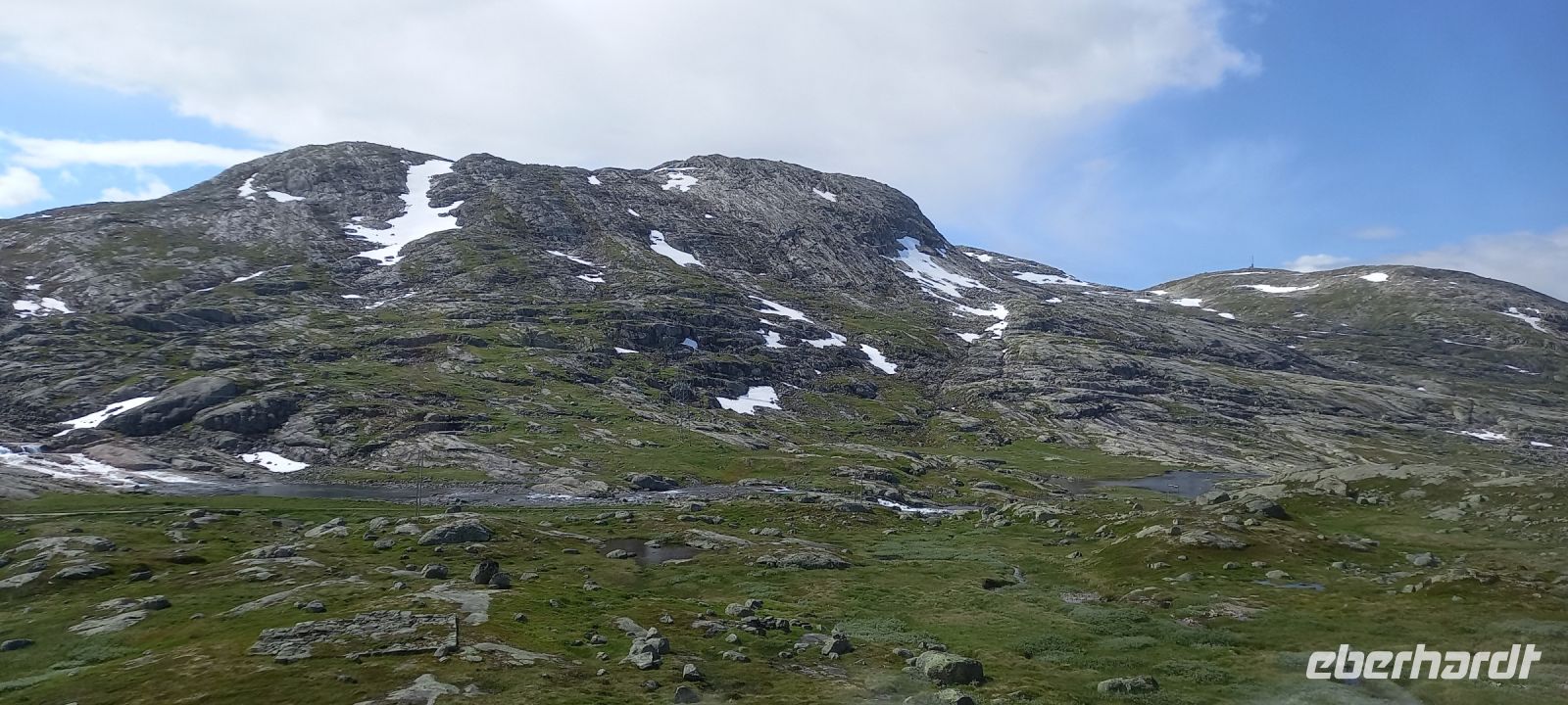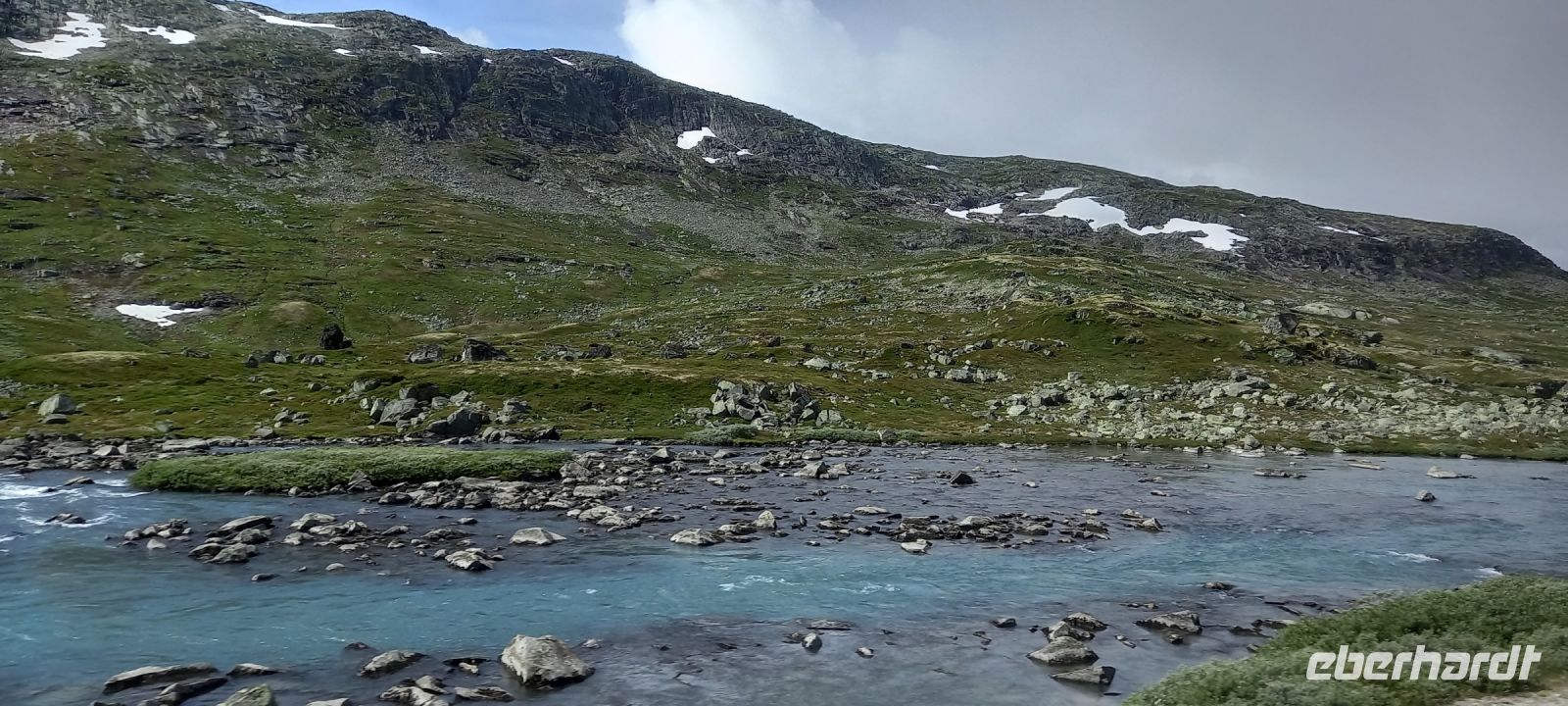 Weiter geht es mit einer "Sondereinlage", für die der Fahrer erst gewonnen werden musste: Hinauf auf die Hocheben der Hardangervidda nach Dyrant Fjellstova hoch oben in der Wildnis. In der Hütte mit Kaffee gab es eine Stärkung, zurück gings vorbei an dem riesigen Damm des Sysedam-Stausees und in der Ferne konnten wir den Hardangerjökulen sehen, einen riesigen Gletscher. Damit aber nicht genug. Nun stoppten wir noch an einem wunderschönen, über 150 m hohen Wasserfall, dem Vöringsfossen. Gut ausgebaute Wege und Terrassen ermöglichen eine Ausblick auf den Wasserfall von allen Seiten. Als wir kurz vor 16.00 h wieder im Hotel abgesetzt wurden, hatten wir wieder einen Reisetag mit vielen schönen Eindrücken erlebt. Den Abschluß machte dann wieder ein leckeres Abendessen-Buffet im Hotel.