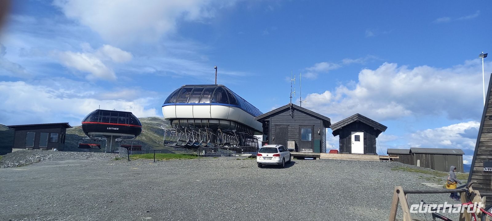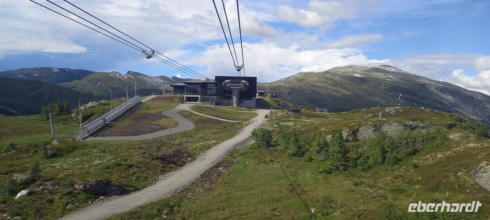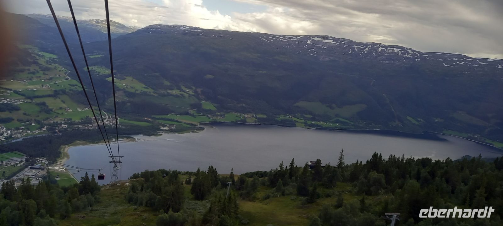 Da in Voss, in unserem Hotel direkt am Bahnhof, die Zimmer noch nicht fertig sind und das Wetter sehr schöne ist, entschließt sich der größte Teil der Gruppe, erst einmal im berühmten Hotes "Fleischer's" Kaffee zu trinken, und dann mit der Seilbahn auf den 840 m hohen Hangurstoppen, den Hausberg von Voss, zu fahren. Wie sich später rausstellt, eine sehr gute Entscheidung, rein wettertechnisch!