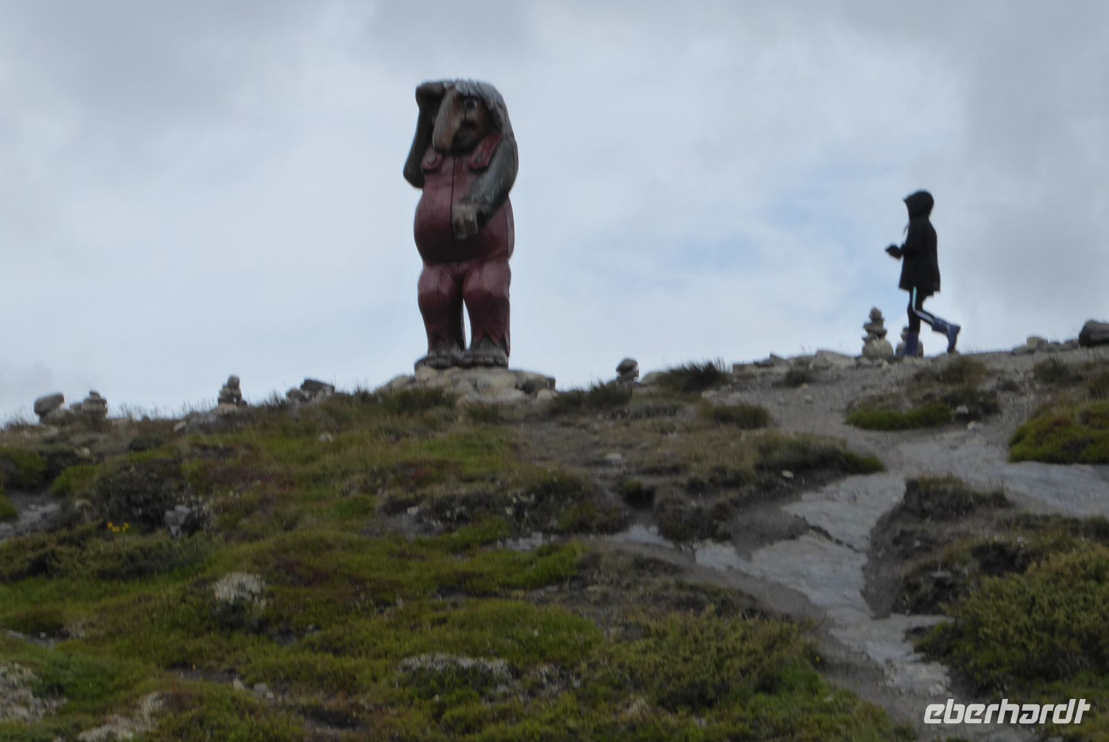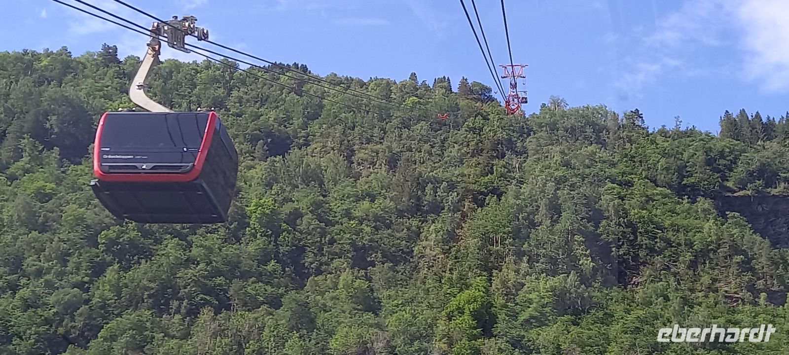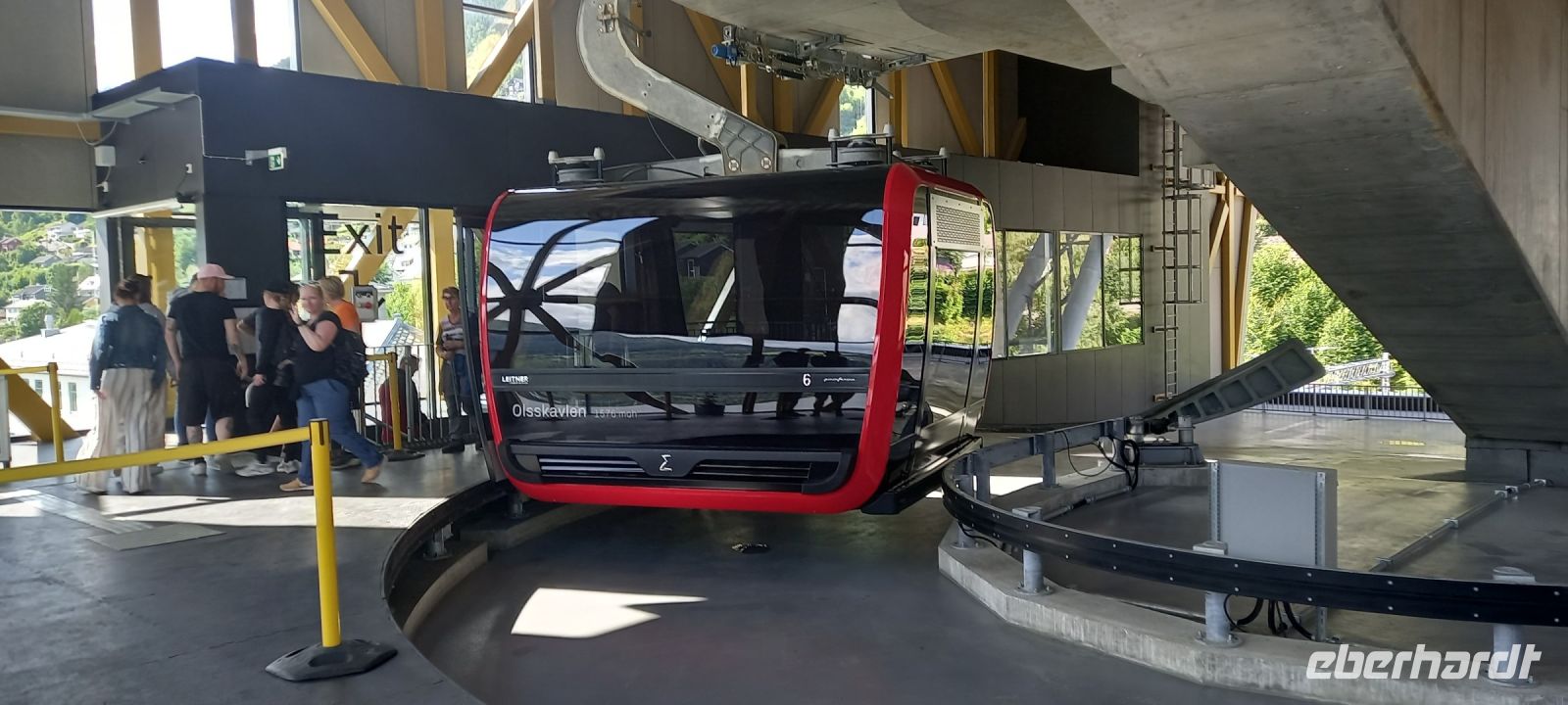 Da in Voss, in unserem Hotel direkt am Bahnhof, die Zimmer noch nicht fertig sind und das Wetter sehr schöne ist, entschließt sich der größte Teil der Gruppe, erst einmal im berühmten Hotes "Fleischer's" Kaffee zu trinken, und dann mit der Seilbahn auf den 840 m hohen Hangurstoppen, den Hausberg von Voss, zu fahren. Wie sich später rausstellt, eine sehr gute Entscheidung, rein wettertechnisch!