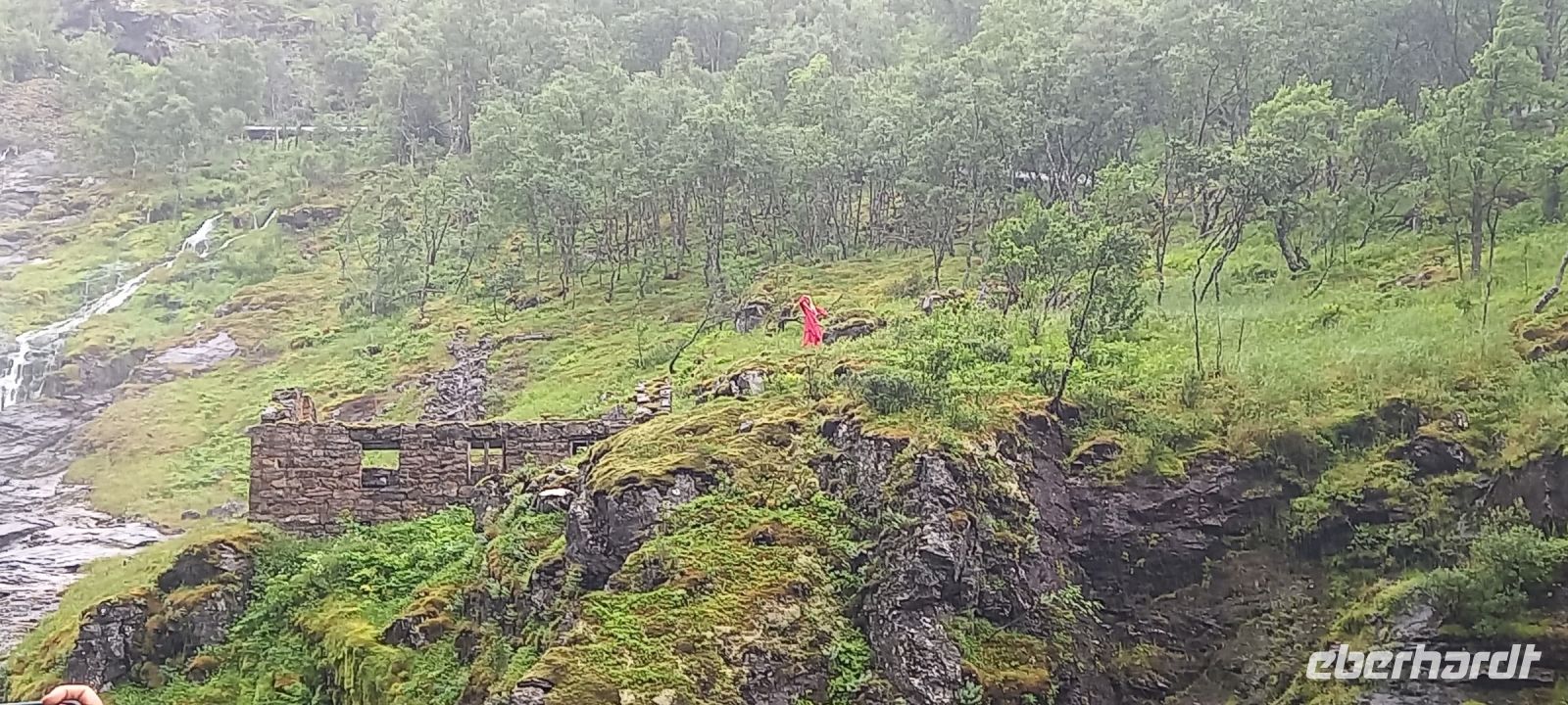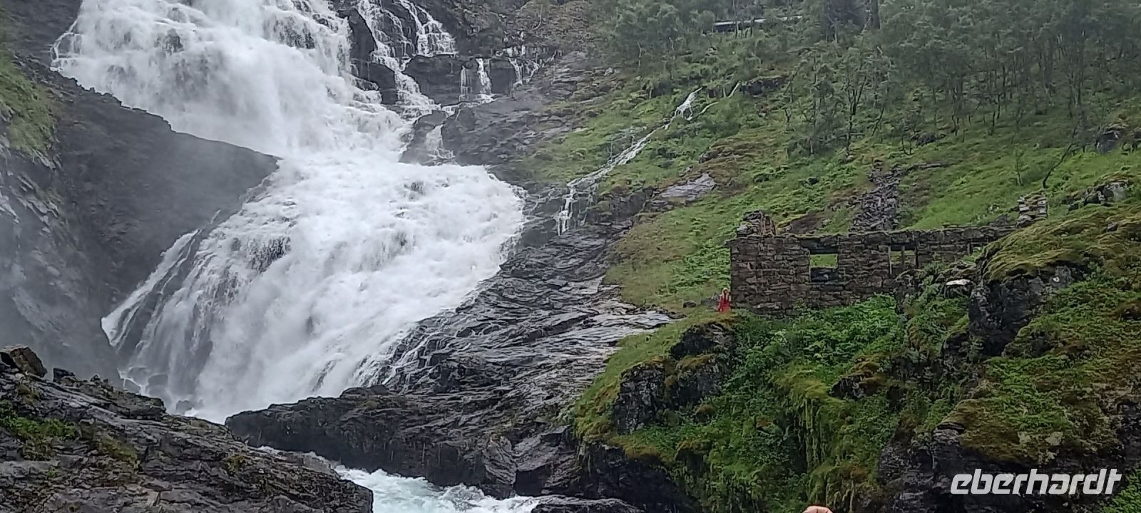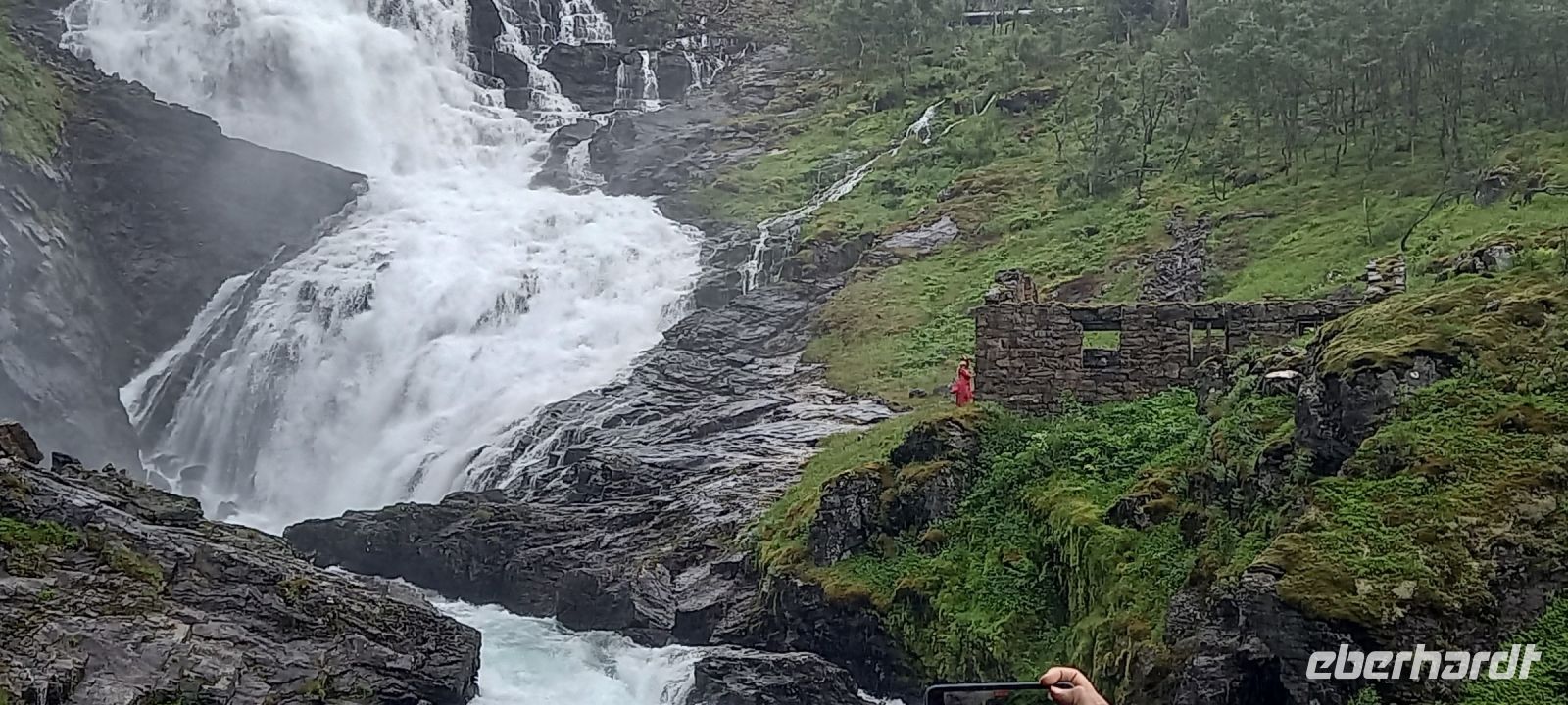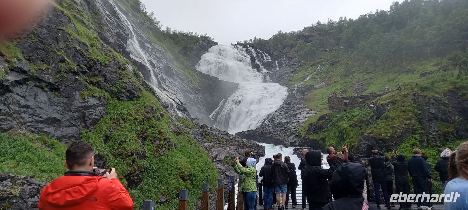 Heute sollten wir im Rahmen unseres Ausfluges eine der aufregendsten norwegischen Fjordlandschaften kennenlernen. Es ging los mit einem (von 5) lokalem Bus, der uns nach Gudvangen am Aurlandfjord bringen soll. Aber unterwegs gab es einen Fotostopp am berühmten und geschichtsträchtigen Hotel Stalheim. In Gudvangen angekommen heiß es gleich anstellen zum Boarding auf das Ausflugsschiff, einem modernen, eletrisch getriebenen Katamaran. Das Wetter sah nicht so gut aus, also war es wichtig, einen guten Platz drinnen im Schiff zu finden. Trotz Regen war es eine sehr interessante Fahrt: Norway live ! Wolken hängen über dem Fjord zwischen den steilen Felswänden. - Auch das hat seinen Reiz! Vom Aurlandfjord geht es in den Naeroyfjord, der mit seiner spektakulären Erscheinung zum UNESCO-Weltkulturerbe gehört (zusammen mit dem Geirangerfjord). In Flam angekommen hatten wir erst einmal Pause, bis eine gute Stunde später die Flambahn bereitstand für eine der spektakulärsten Bahnstrecken der Welt. Auf einer Länge von nur 20 Kilometern schlängelt sich eine der steilsten Normalspurbahnen der Welt durch schönste norwegische Natur. Kurz vor Myrdal stoppt die Bahn zwischen zwei Tunnel auf einer Brücke, am Kjossfossen, einem weiteren spektakulären Wasserfall. Als Hauptattraktion dort gibt es Musik und Tanz der Huldrenen. Oben in Myrdal angekommen konnten wir gleich wieder in die Bergenbahn einsteigen, die uns zurück nach Voss brachte.