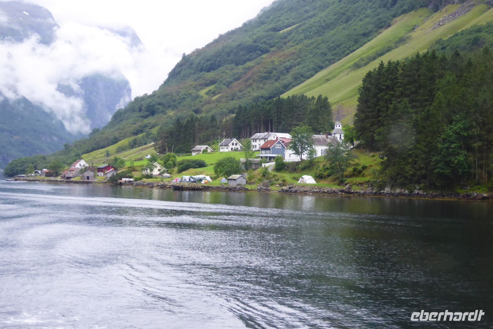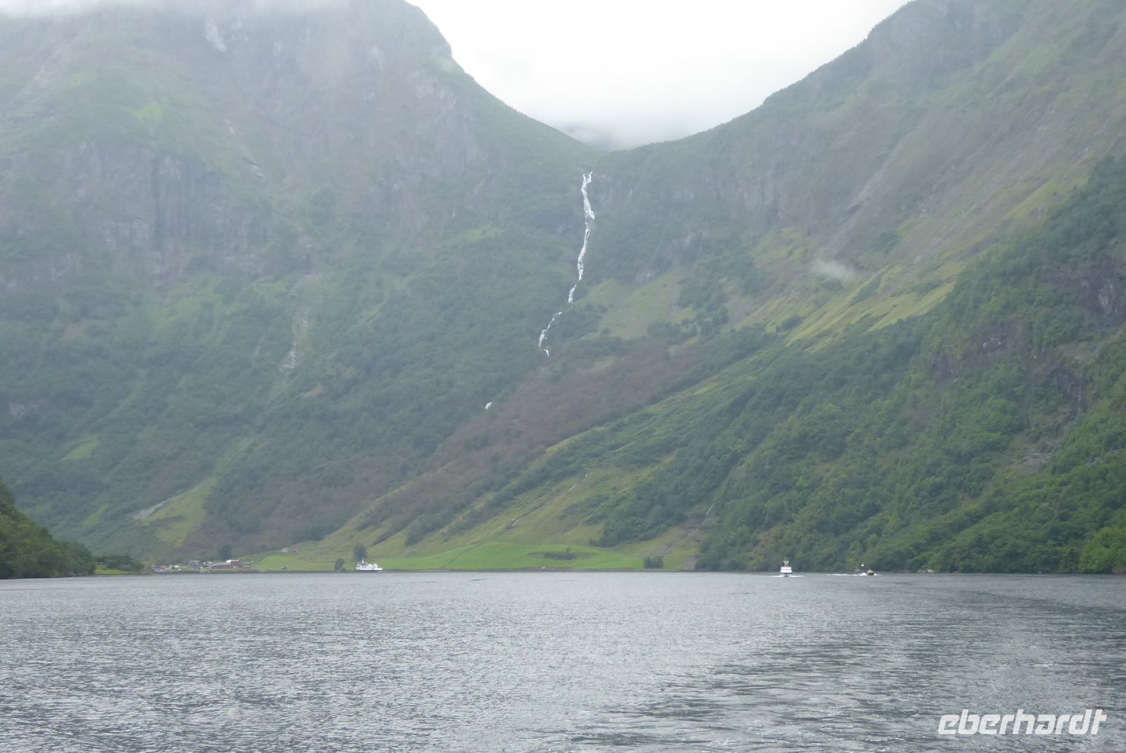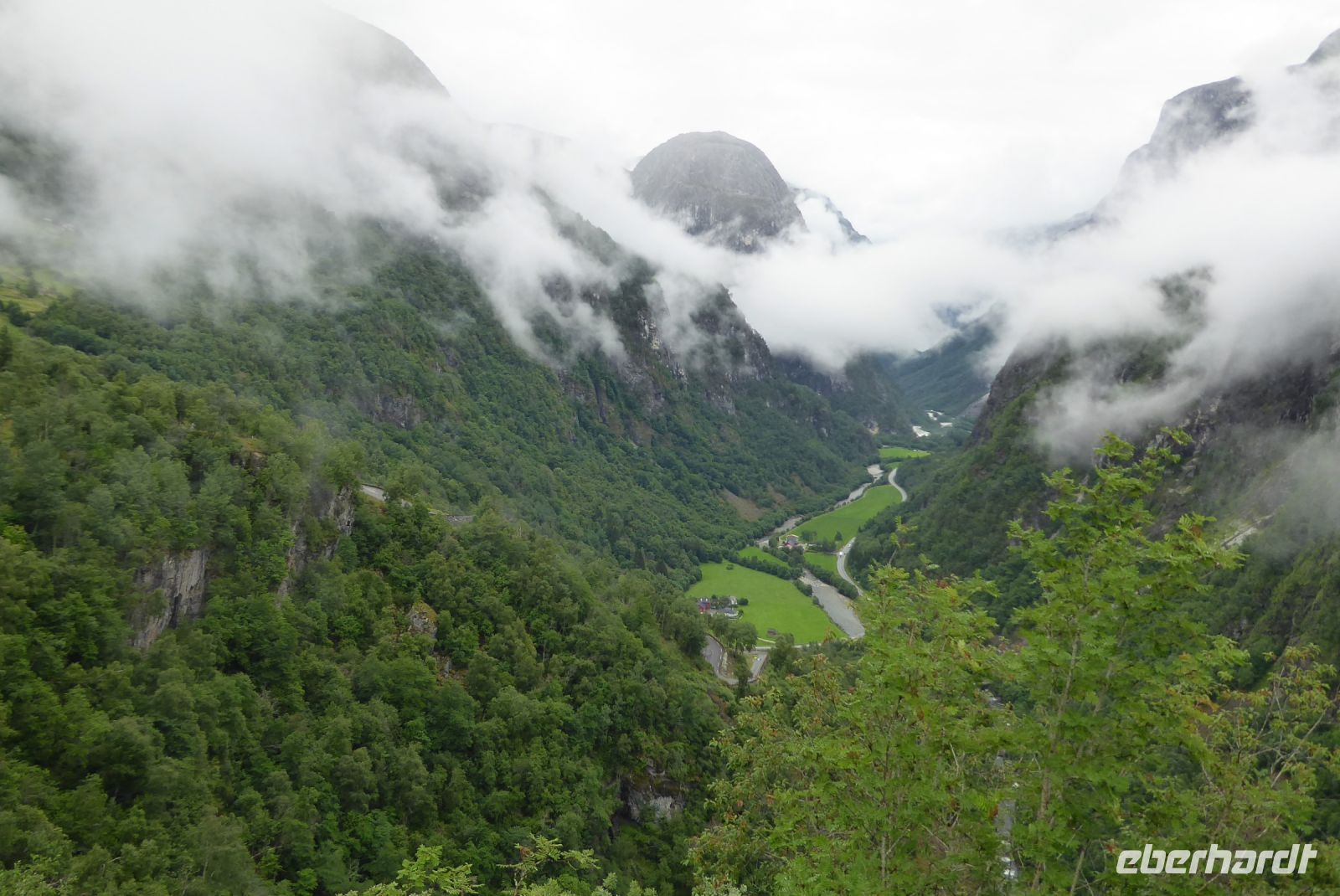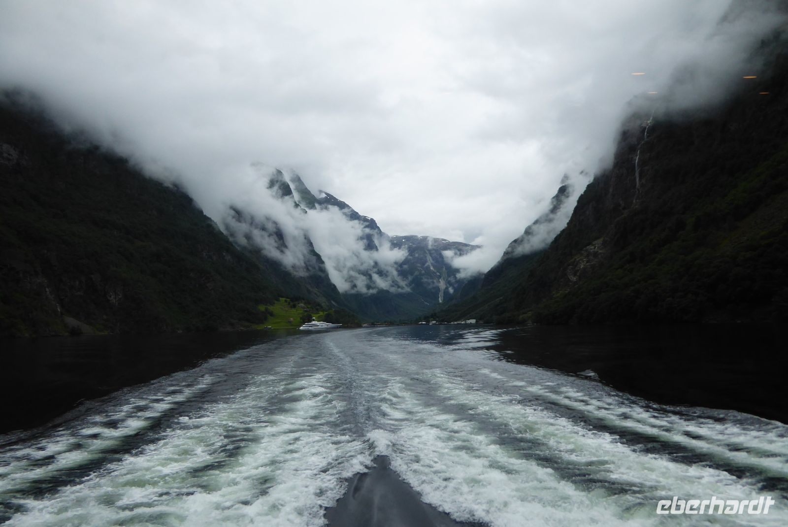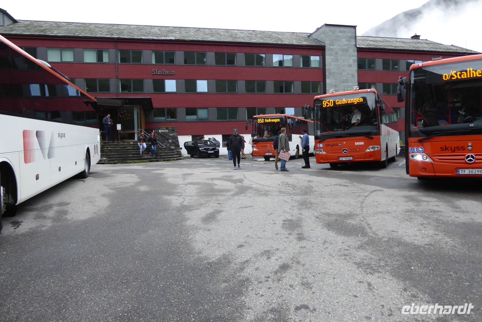 Heute sollten wir im Rahmen unseres Ausfluges eine der aufregendsten norwegischen Fjordlandschaften kennenlernen. Es ging los mit einem (von 5) lokalem Bus, der uns nach Gudvangen am Aurlandfjord bringen soll. Aber unterwegs gab es einen Fotostopp am berühmten und geschichtsträchtigen Hotel Stalheim. In Gudvangen angekommen heiß es gleich anstellen zum Boarding auf das Ausflugsschiff, einem modernen, eletrisch getriebenen Katamaran. Das Wetter sah nicht so gut aus, also war es wichtig, einen guten Platz drinnen im Schiff zu finden. Trotz Regen war es eine sehr interessante Fahrt: Norway live ! Wolken hängen über dem Fjord zwischen den steilen Felswänden. - Auch das hat seinen Reiz! Vom Aurlandfjord geht es in den Naeroyfjord, der mit seiner spektakulären Erscheinung zum UNESCO-Weltkulturerbe gehört (zusammen mit dem Geirangerfjord). In Flam angekommen hatten wir erst einmal Pause, bis eine gute Stunde später die Flambahn bereitstand für eine der spektakulärsten Bahnstrecken der Welt. Auf einer Länge von nur 20 Kilometern schlängelt sich eine der steilsten Normalspurbahnen der Welt durch schönste norwegische Natur. Kurz vor Myrdal stoppt die Bahn zwischen zwei Tunnel auf einer Brücke, am Kjossfossen, einem weiteren spektakulären Wasserfall. Als Hauptattraktion dort gibt es Musik und Tanz der Huldrenen. Oben in Myrdal angekommen konnten wir gleich wieder in die Bergenbahn einsteigen, die uns zurück nach Voss brachte.