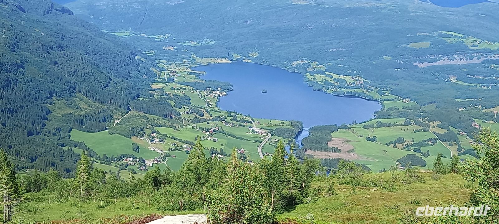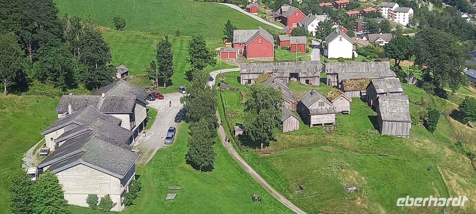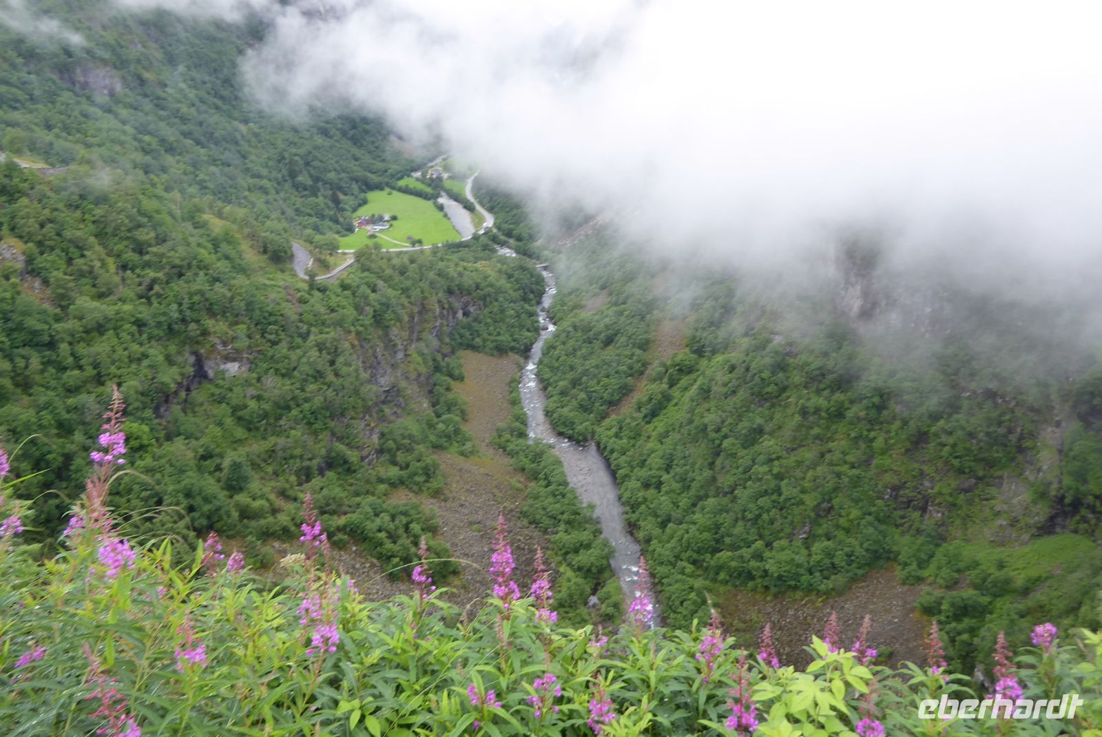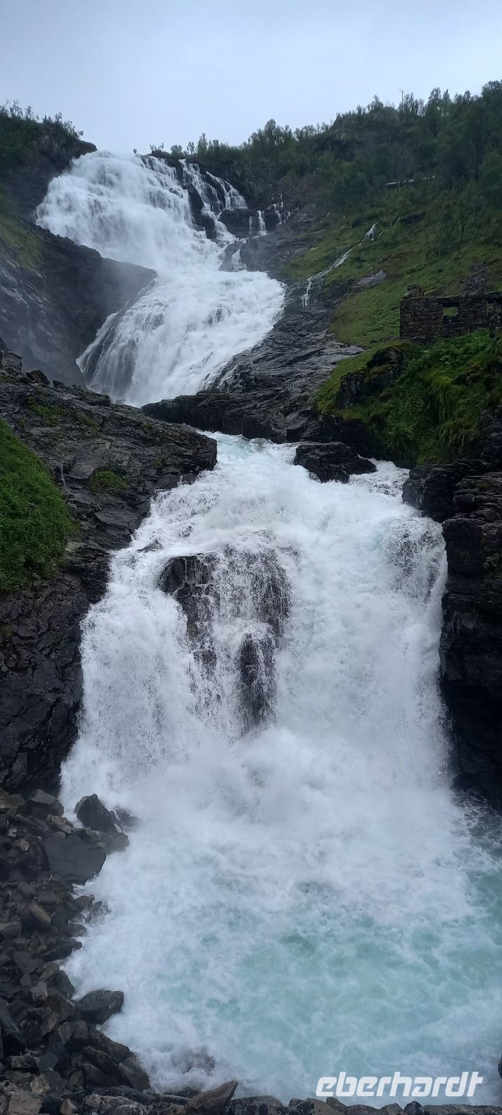 Heute sollten wir im Rahmen unseres Ausfluges eine der aufregendsten norwegischen Fjordlandschaften kennenlernen. Es ging los mit einem (von 5) lokalem Bus, der uns nach Gudvangen am Aurlandfjord bringen soll. Aber unterwegs gab es einen Fotostopp am berühmten und geschichtsträchtigen Hotel Stalheim. In Gudvangen angekommen heiß es gleich anstellen zum Boarding auf das Ausflugsschiff, einem modernen, eletrisch getriebenen Katamaran. Das Wetter sah nicht so gut aus, also war es wichtig, einen guten Platz drinnen im Schiff zu finden. Trotz Regen war es eine sehr interessante Fahrt: Norway live ! Wolken hängen über dem Fjord zwischen den steilen Felswänden. - Auch das hat seinen Reiz! Vom Aurlandfjord geht es in den Naeroyfjord, der mit seiner spektakulären Erscheinung zum UNESCO-Weltkulturerbe gehört (zusammen mit dem Geirangerfjord). In Flam angekommen hatten wir erst einmal Pause, bis eine gute Stunde später die Flambahn bereitstand für eine der spektakulärsten Bahnstrecken der Welt. Auf einer Länge von nur 20 Kilometern schlängelt sich eine der steilsten Normalspurbahnen der Welt durch schönste norwegische Natur. Kurz vor Myrdal stoppt die Bahn zwischen zwei Tunnel auf einer Brücke, am Kjossfossen, einem weiteren spektakulären Wasserfall. Als Hauptattraktion dort gibt es Musik und Tanz der Huldrenen. Oben in Myrdal angekommen konnten wir gleich wieder in die Bergenbahn einsteigen, die uns zurück nach Voss brachte.