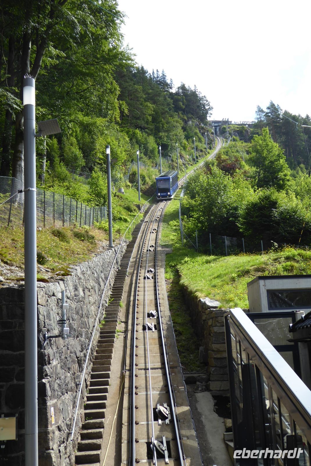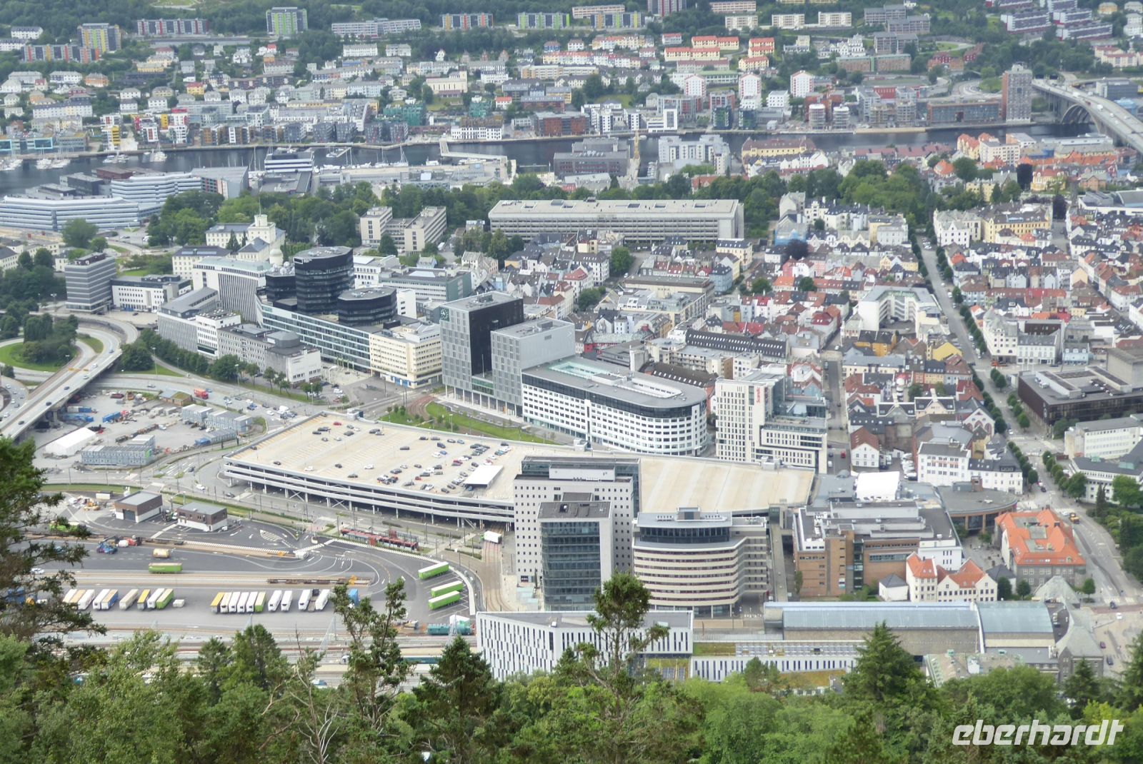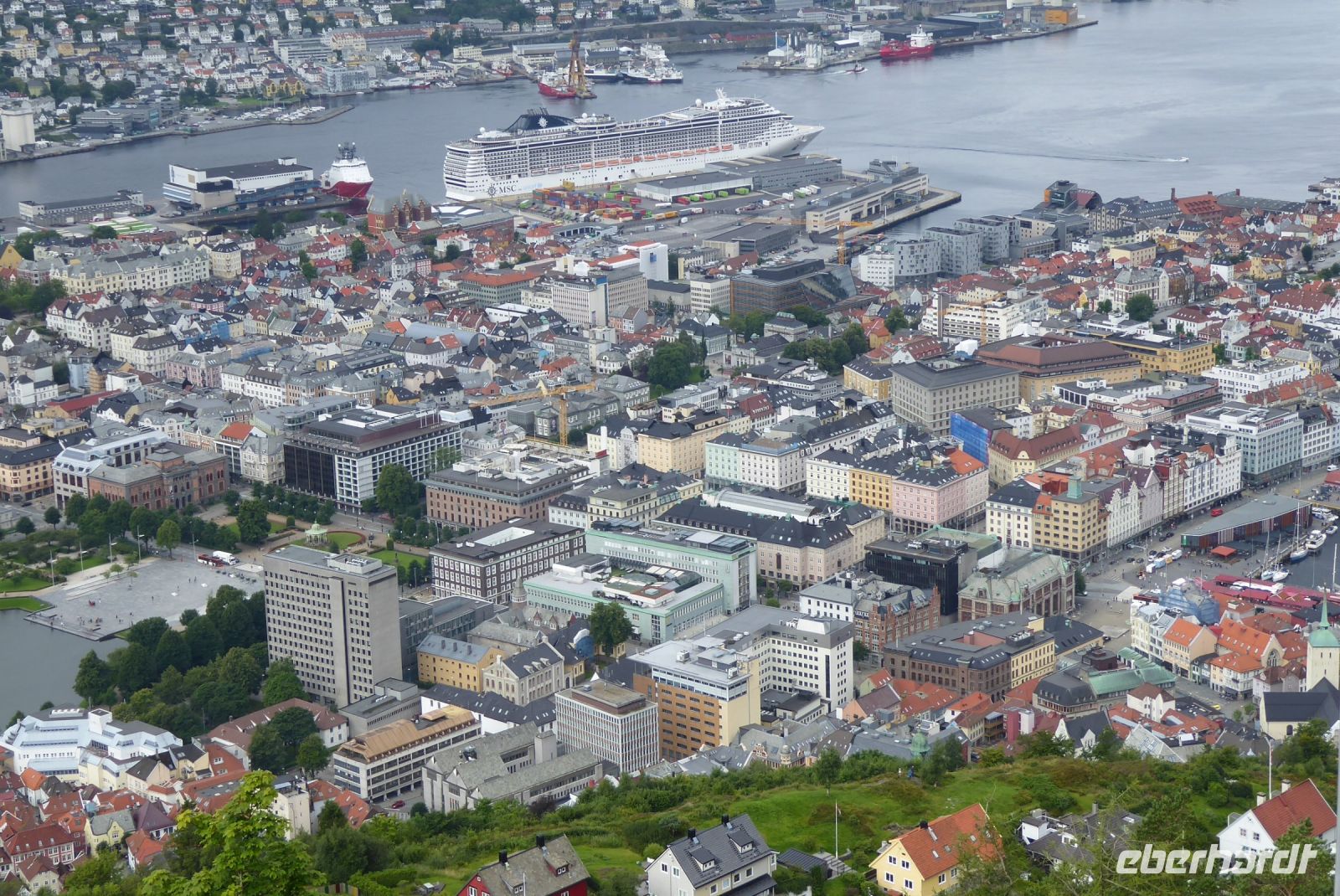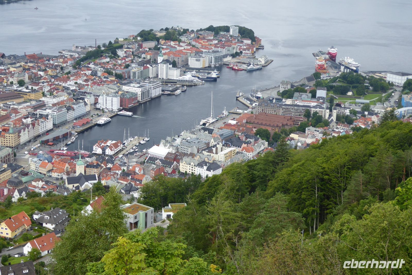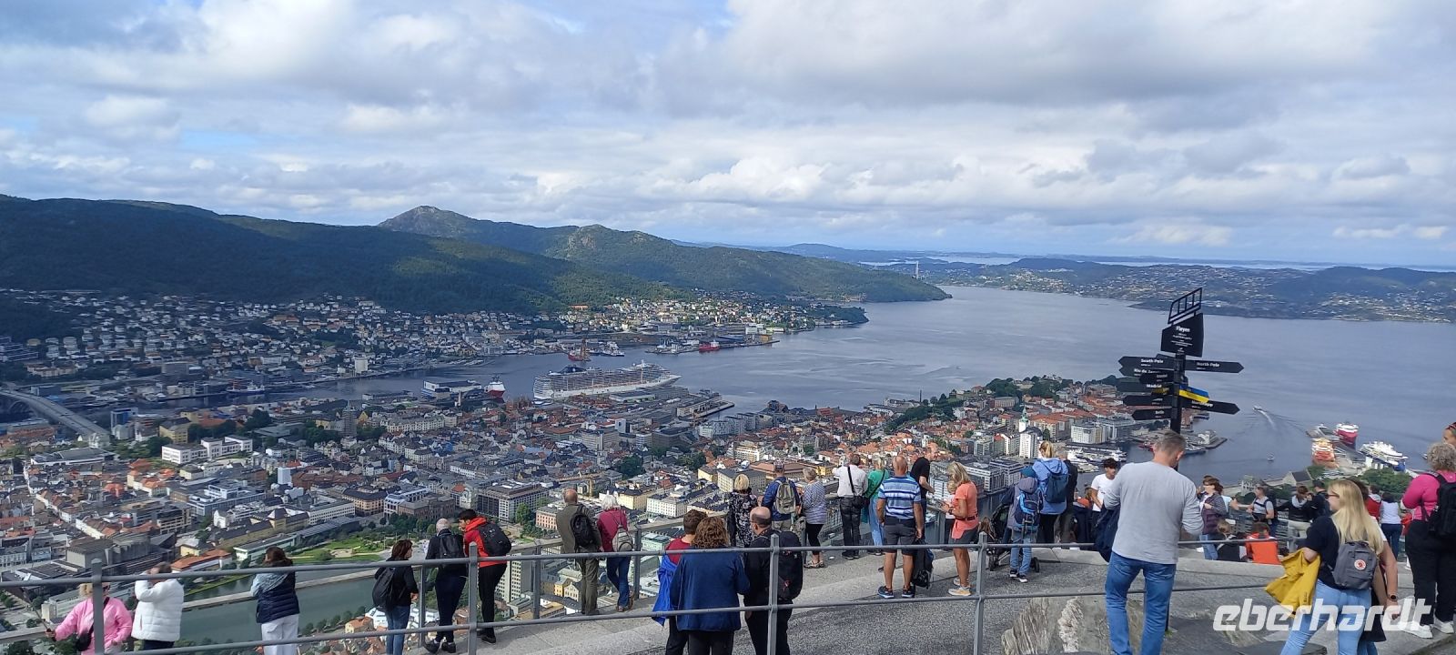 Der Vormittag bei schönstem Wetter ist ideal um mit der Floibahn hinauf auf den Hausberg zu fahren. Eine wunderschöne Aussicht auf die Stadt, den Fjord und die umliegenden Berge bieten sich uns an. Oben löst sich die Gruppe dann auf, damit jeder nach in seinem Tempo die Aussicht, die schöne Höhe für eine Spaziergang, oder den Fußweg nach unten nutzen kann. Dazu bieten sich viele nette Straßencafés an, gemütlich die Stadt und die Menschen zu genießen. Zum Abendessen treffen wir uns dann alle nochmal wieder. Hier kann auch geklärt werden, ob alle Check-ins für den Rückflug gelungen sind.