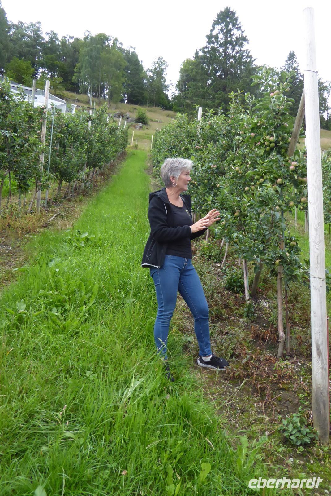 Wieder um 09.00 h erwartet uns heute ein kleiner Reisebus zu unserm Ausflug in die Hardangerfjord-Region. Mit 179 Kilometern ist der Hardangerfjordeiner der längsten Fjorde der Welt. Es warten einige Attraktionen auf uns an diesem Tag, beginnend mit dem Doppelwasserfall Skjervsfossen. Wir stoppen oben und unten, um jeweils schöne Fotos schießen zu können, aber auch zu den "Dusjen" zu laufen, dich am Wasser, wo die gischt die Besucher duscht. Weiter geht es dann zur Hardangerbrücke, 1.380 m lang über den Fjord, aber ganz besonders: die beiden Kreisverkehre im Berg / Tunnel. Unser Fahrer fährt für uns eine Ehrenrunde "unter Tage". Kurz darau errreichen wir den Bauernhof Sysegard; Ein Hof mit Obstanbau und Kelterei. Wir bekommen eine nette Führung, kosten Kirschen u von den Bäumen und erfahren viel Interessantes zur Pflege und Ernte der Früchte. Danach haben wir ein Tasting mit Apfelmost und 3 Sorten leckeren Sorten Cider. Im Hofladen gibt es Marmelade, Wurst und Schinken von den Schafen zu kaufen.