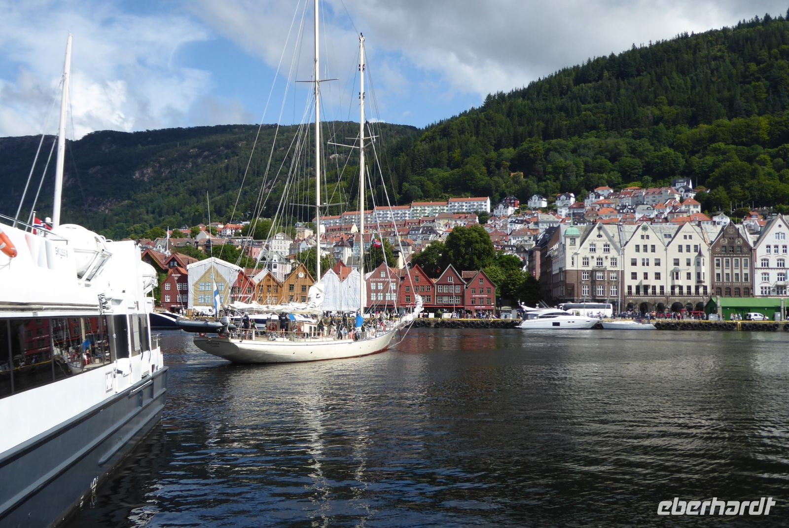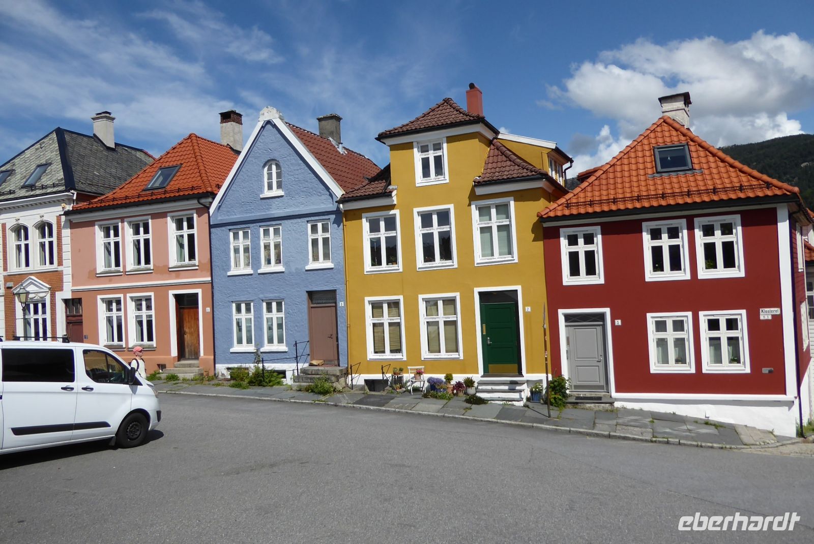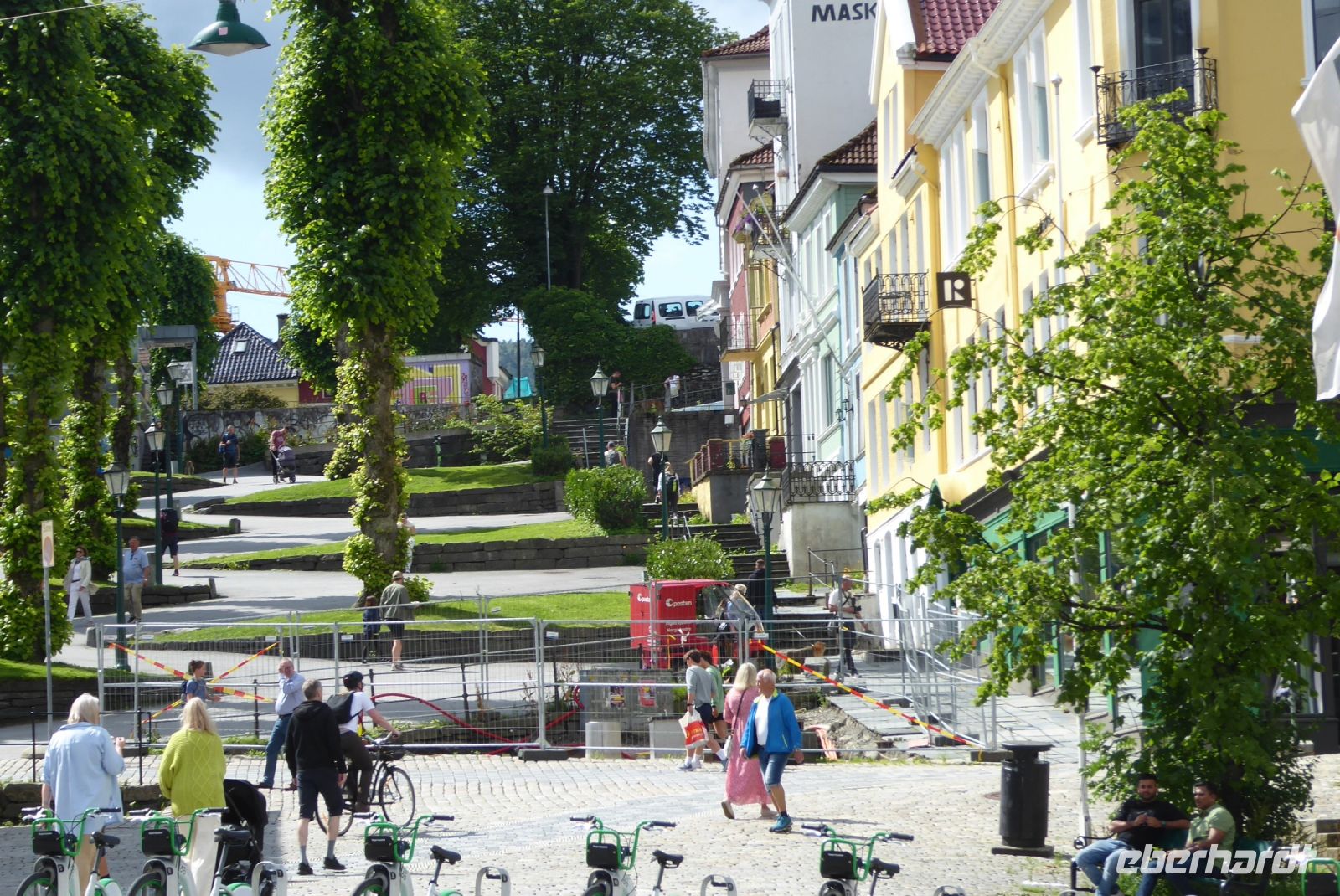 Heute verlassen wir unseren Standort Voss, um mit der Bergenbahn weiter in die Hafenstadt Bergen. Ein Checkin ist um diese Zeit noch nicht möglich, also stellen wir die Koffer ab und laufen gemütlich am Kaigaten entlang in die Stadt zum Fischmarkt. Dort treffen wir zum vereinbarten Zeitpunkt unsere Stadtführerin, die uns 3 Stunden lang viele kleine und große Sehenswürdigkeiten dieser tollen Stadt zeigt. Höhepunkt ist natürlich der Rundgang durch Bryggen, das Weltkulturerbe der UNESCO. Nach der Führung ist es möglich, die Zimmer im Hotel zu übernehmen, die Füße hoch zu legen oder nochmals in die nahe Innenstadt zu pilgern. Für den nächsten Tag, der für alle zur freien Verfügung steht, verabreden wir uns zur gemeinsamen Auffahrt auf den Stadtberg Bergens, Floyen.