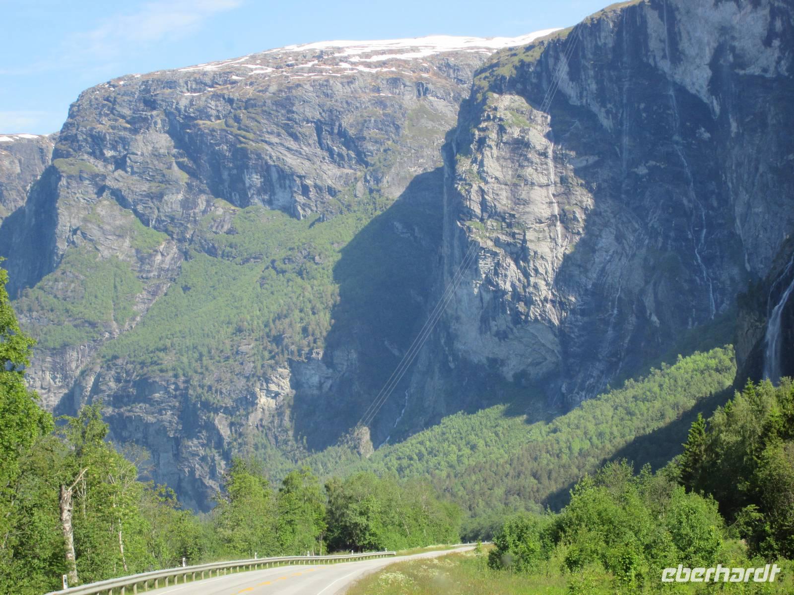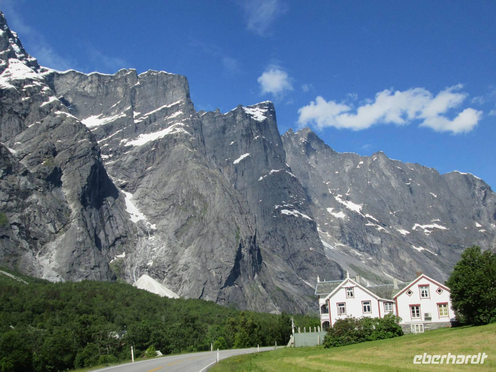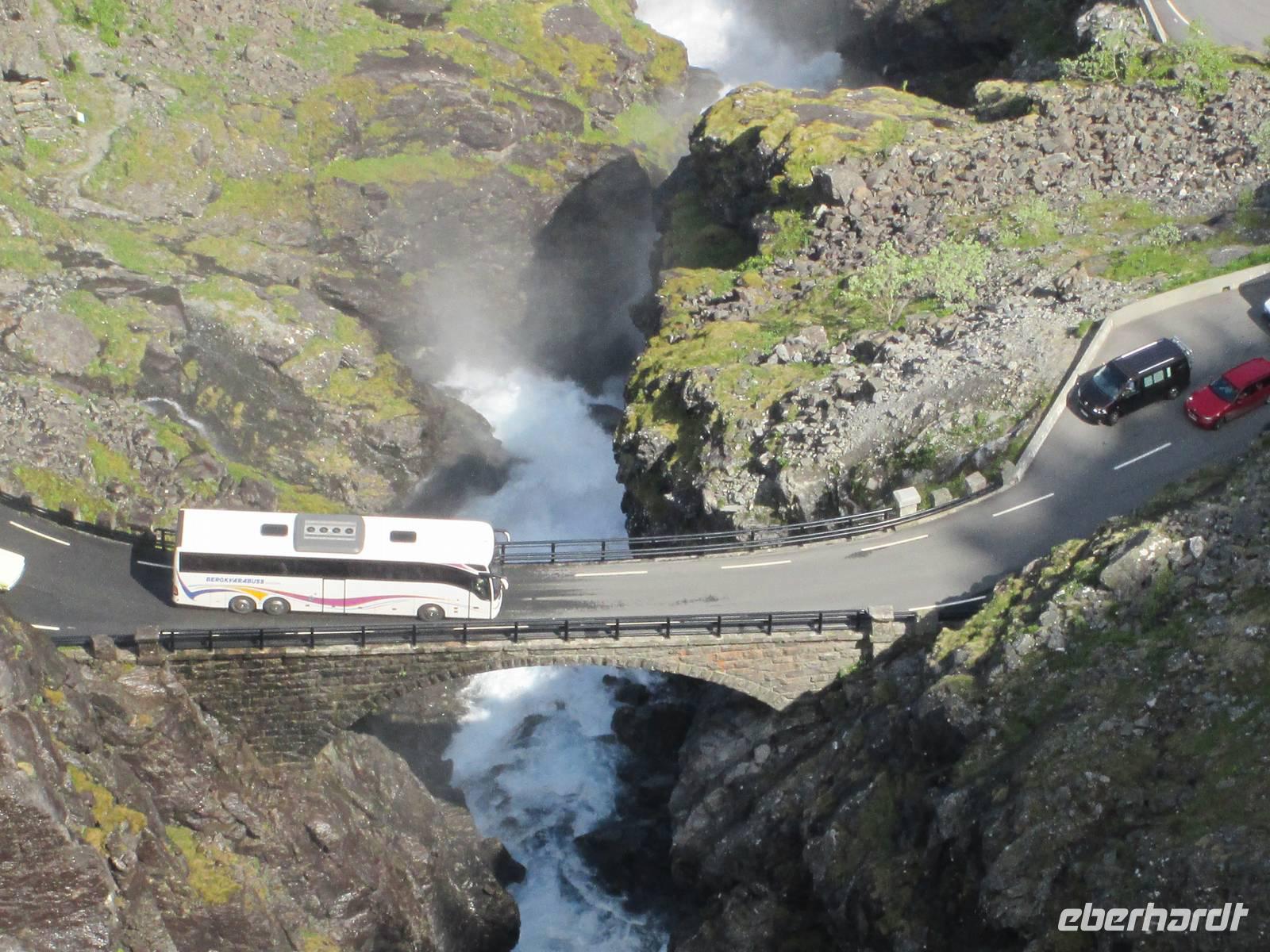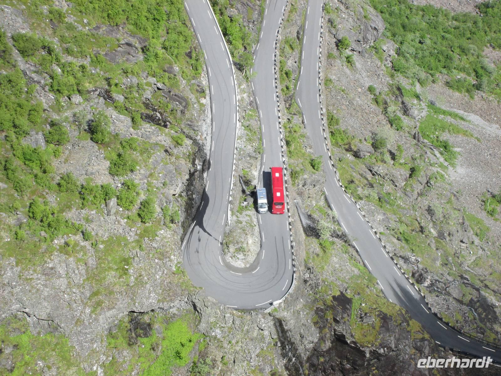 Dombas verließen wir am Sonntag Morgen, in der Hoffnung auch diesen Tag mit Sonnenschein geniessen zu können, denn einige landschaftliche Höhepunkte der gesamten Reise sollten folgen. Und tatsächlich: zunächst der von der Rauma gebildete wilde Slettafossen, dann schließlich der berühmte "Trollstigen", die 1936 erbaute Fahrstrasse, charakterisiert durch 11 Haarnadelkurven, präsentierten sich von der schönsten Seite. Fotostopps durften natürlich nicht fehlen.