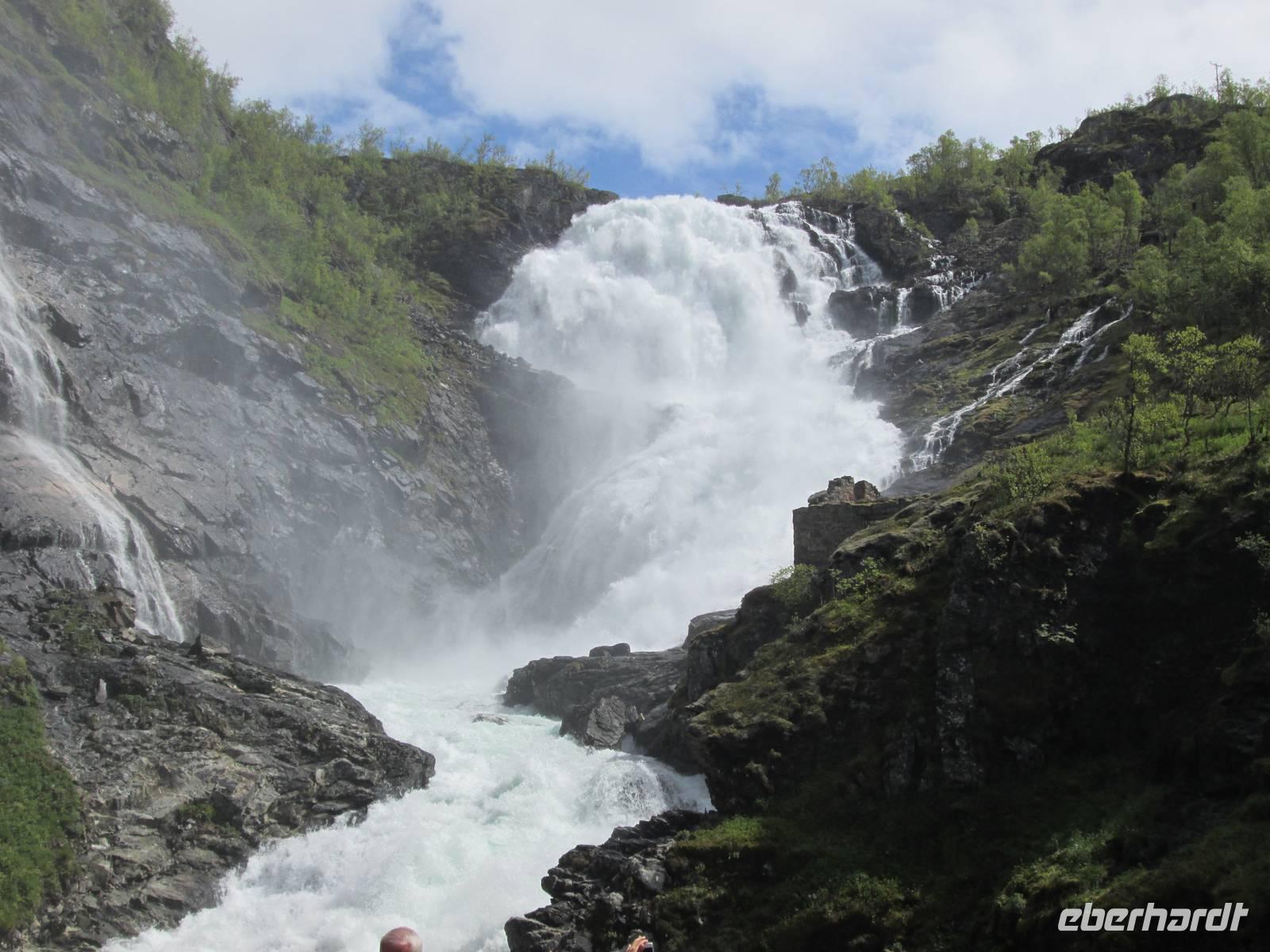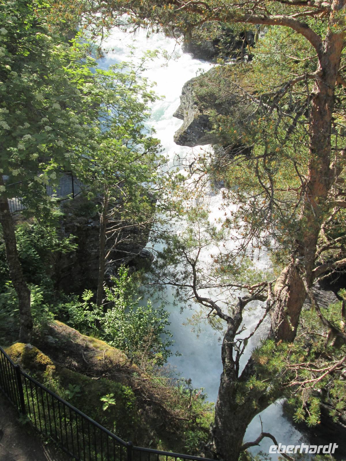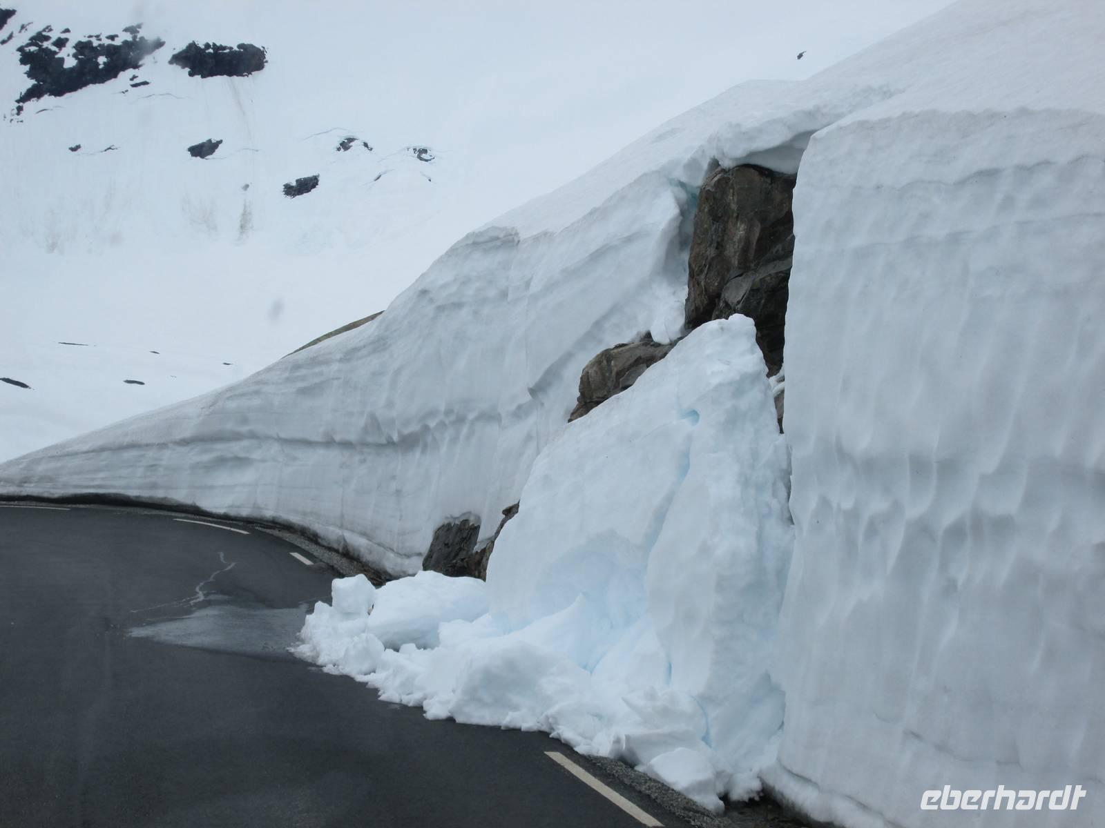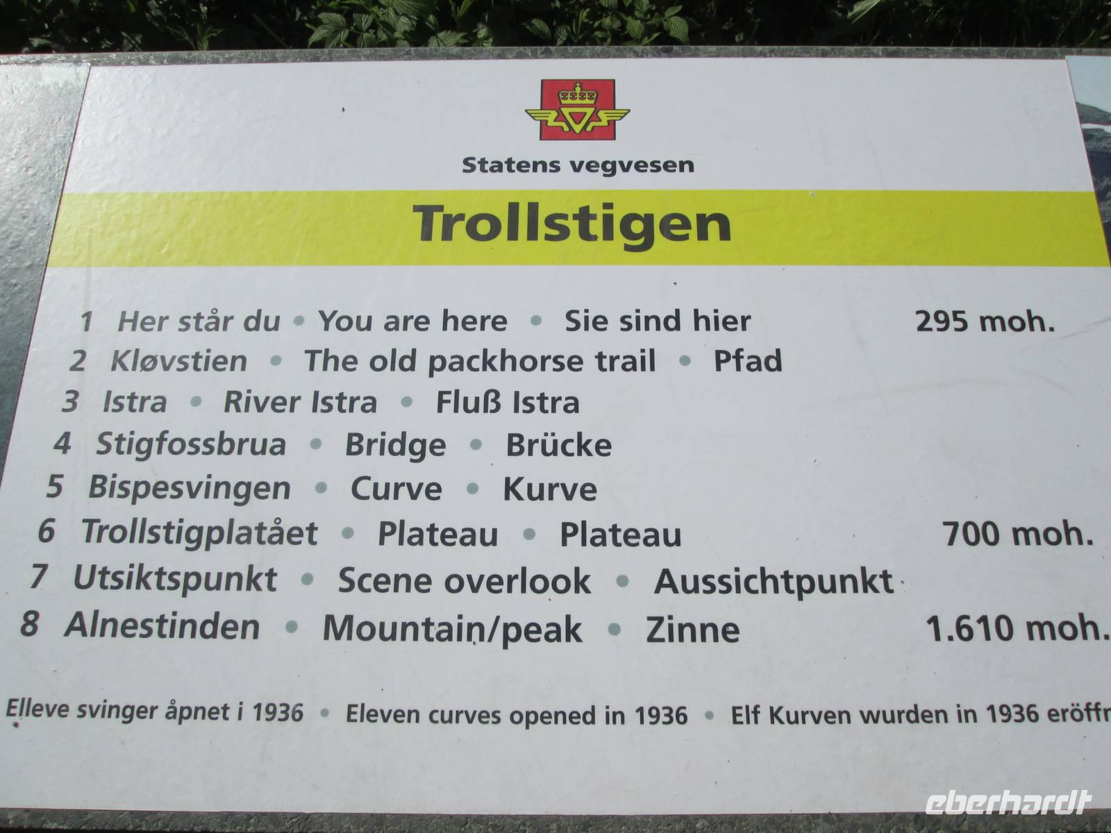 Dombas verließen wir am Sonntag Morgen, in der Hoffnung auch diesen Tag mit Sonnenschein geniessen zu können, denn einige landschaftliche Höhepunkte der gesamten Reise sollten folgen. Und tatsächlich: zunächst der von der Rauma gebildete wilde Slettafossen, dann schließlich der berühmte "Trollstigen", die 1936 erbaute Fahrstrasse, charakterisiert durch 11 Haarnadelkurven, präsentierten sich von der schönsten Seite. Fotostopps durften natürlich nicht fehlen.