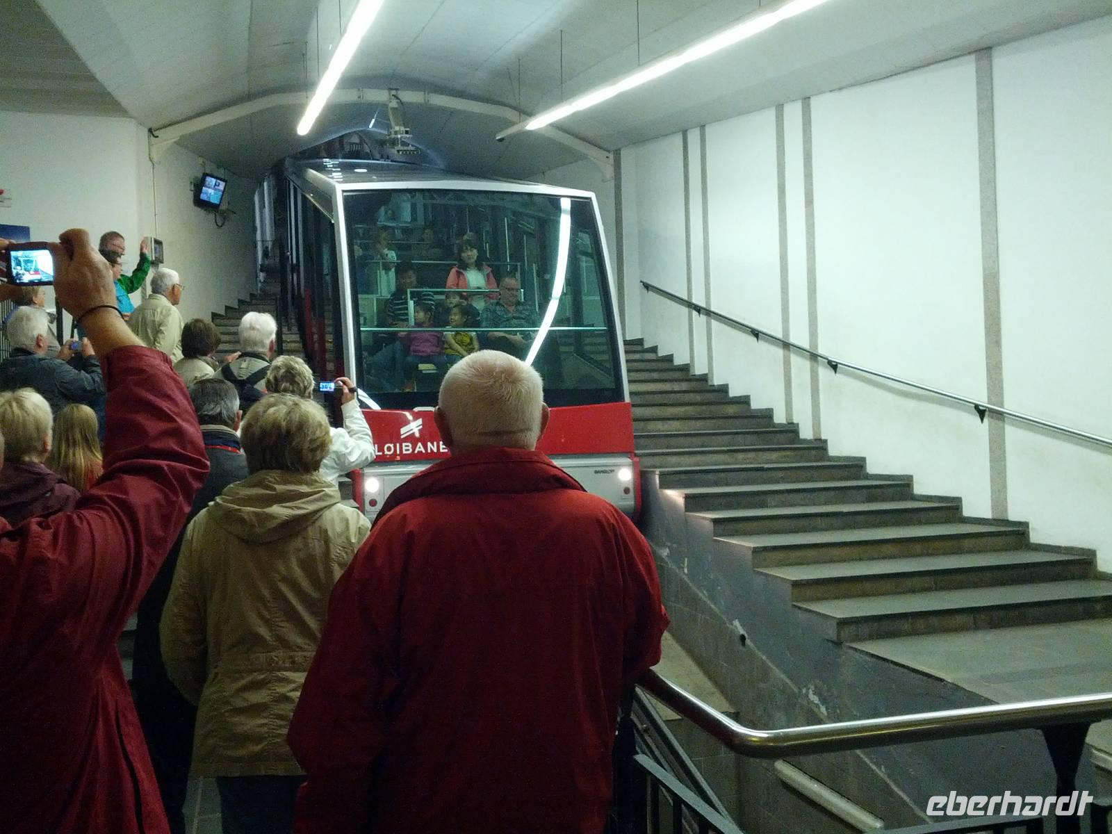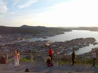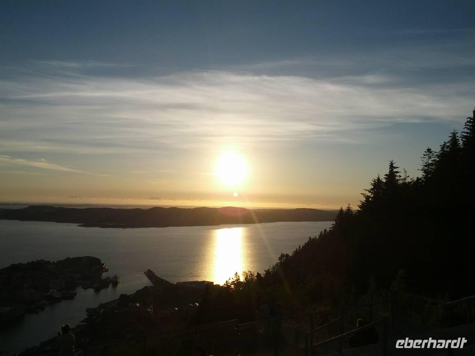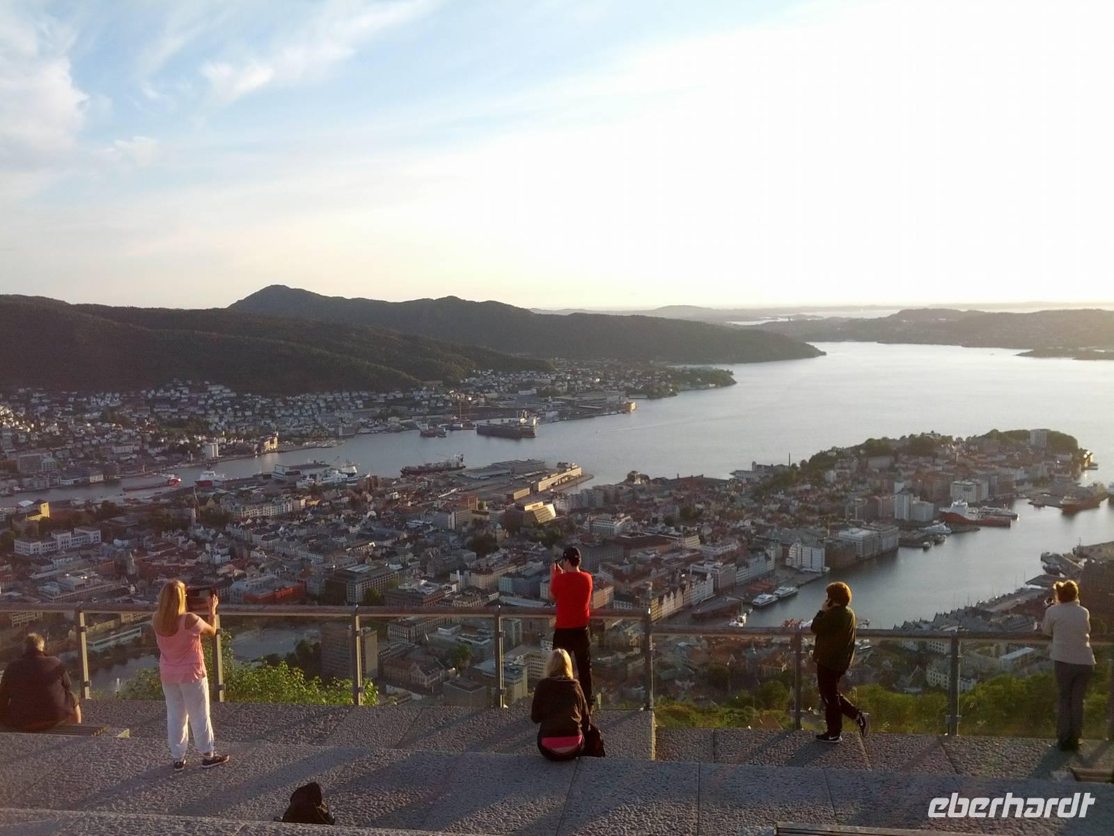 Nach dem Abendessen im Hotel verlockt uns das herrliche Wetter zur Auffahrt mit der einzigen Standseilbahn Norwegens auf den Hausberg der Stadt, den Fløyen.