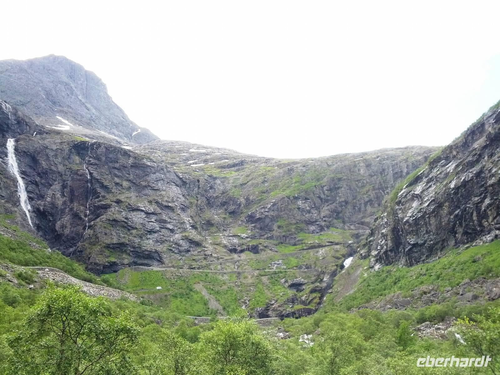 von elf großen Kehren gebildete Serpentinenstraße „Trollstigen" ab.